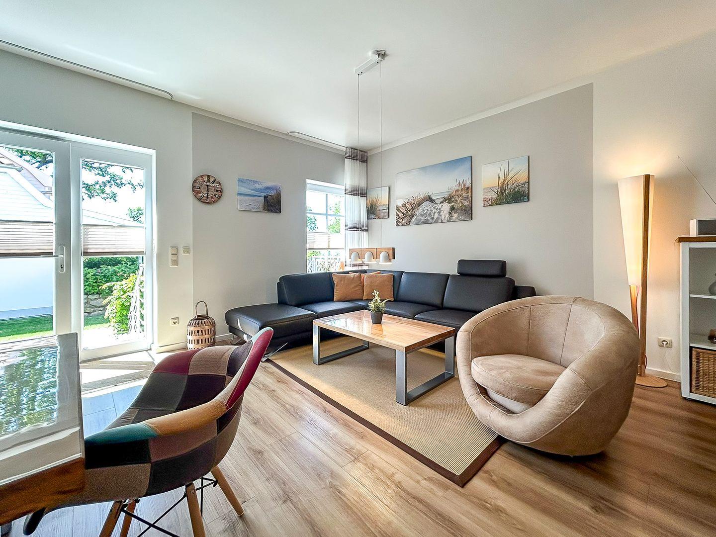 Über eine Außentreppe neben der großzügigen Südterrasse erreichst du den stilvoll eingerichteten Wohn- und Essbereich. Die angrenzende moderne Küche beinhaltet neben einem Kühlschrank mit Tiefkühlkombination, einem 4-Platten-Cerankochfeld mit Backofen, Spülmaschine und Mikrowelle selbstverständlich auch alle nötigen Küchenutensilien wie Toaster, Wasserkocher etc.