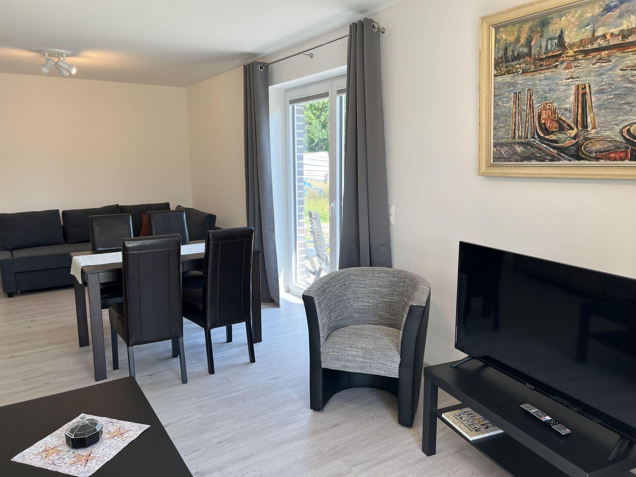 Zu der Ferienwohnung Ebbe im Erdgeschoss gehört eine Terrasse und ein Garten mit Strandkorb.
