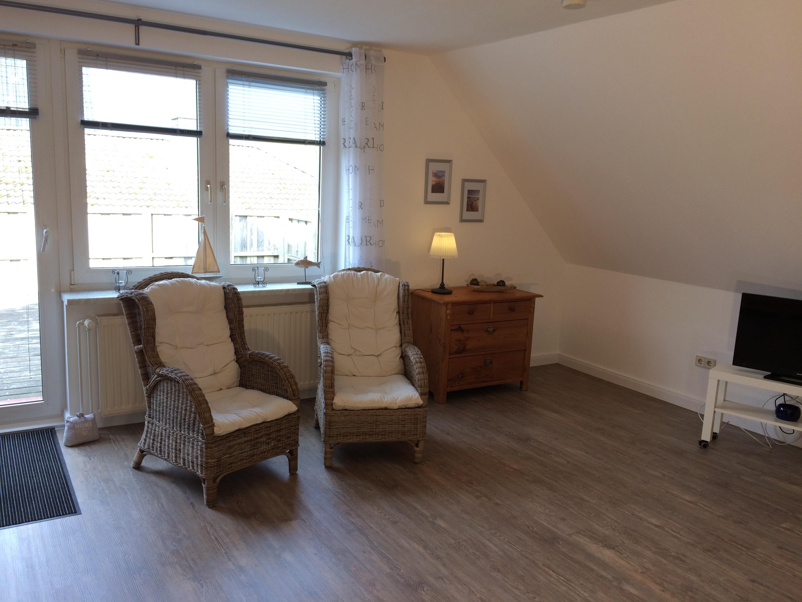 Im großzügigen Wohnzimmer finden Sie einen Flachbild-TV, einen DVD-Player sowie eine Stereoanlage mit CD- und Bluetooth-Funktion. Von hier aus haben Sie Zugang zu der etwa 50 Quadratmeter großen Dachterrasse in Süd-West-Lage, die förmlich zum Entspannen einlädt. Hier können Sie es sich richtig gutgehen lassen. Gartenmöbel, ein Sonnenschirm und zwei Liegen stehen für Sie bereit.