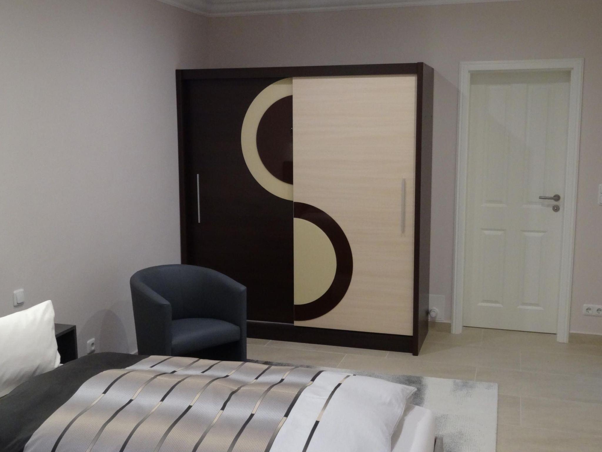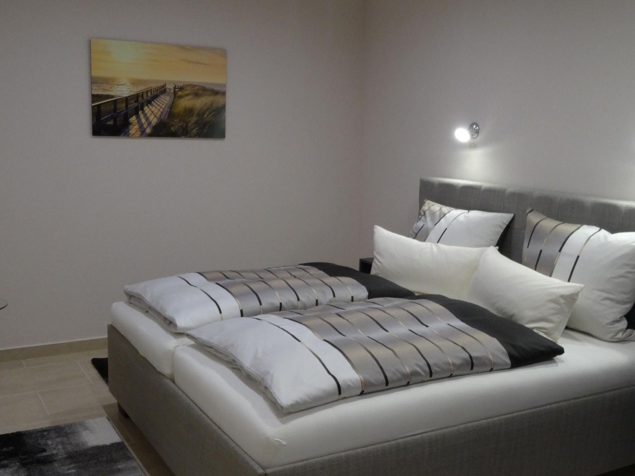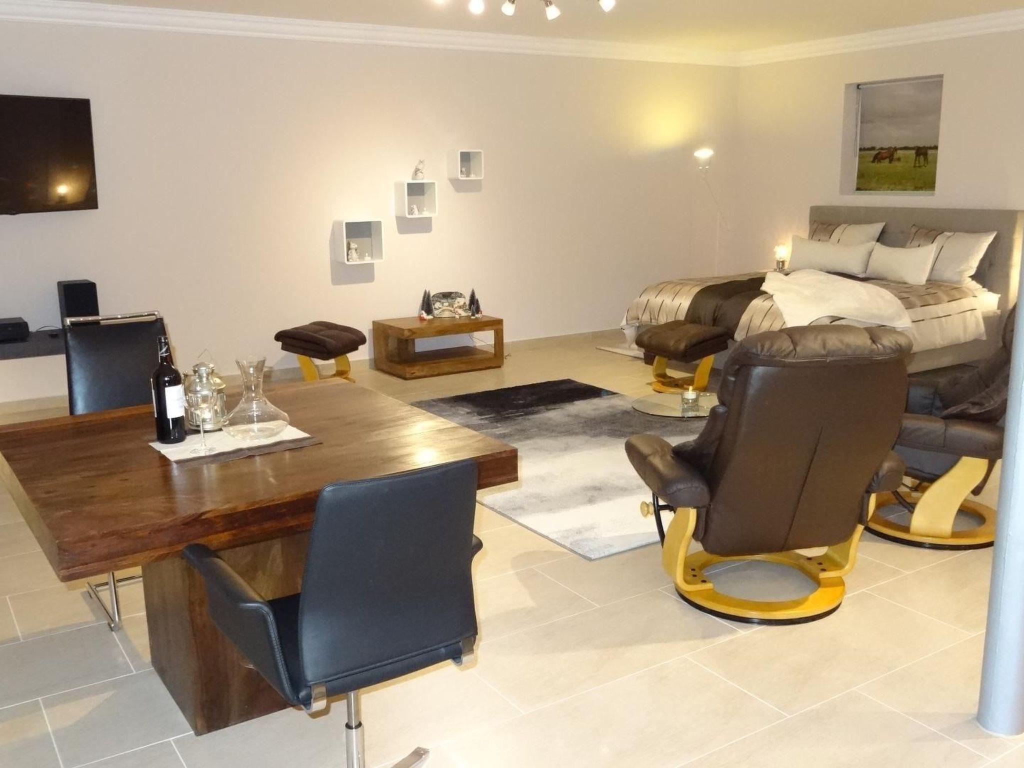 The holiday flat is on the ground floor and offers 120 m² of space for the discerning guest. Upon entering the flat, you enter a large room with underfloor heating and floor-to-ceiling windows facing the courtyard. A separate entrance door is at ground level. The spacious entrance area has a fireplace. In the living area you will find a high-quality fitted kitchen, which is fully equipped. Take a seat at the large, square table with four leather swivel armchairs. There are two leather armchairs with footstools for watching TV and relaxing. You can place small items on the small round glass table. The television is mounted on the wall. The Internet HIFI system is located under the 65-inch television. A box-spring bed is also available in this room. A box-spring bed (1.80 m x 2.00 m) and a large wardrobe with plenty of wooden hangers await you in the bedroom. . The bedroom is also equipped with underfloor heating. The bathroom with shower also has underfloor heating, a large mirror, make-up mirror with sevenfold magnification, a hairdryer and washing lotion as well as a wide washbasin, an open rain shower and a washing machine. White towels and white floor mats are provided. An internet connection is also available for you.