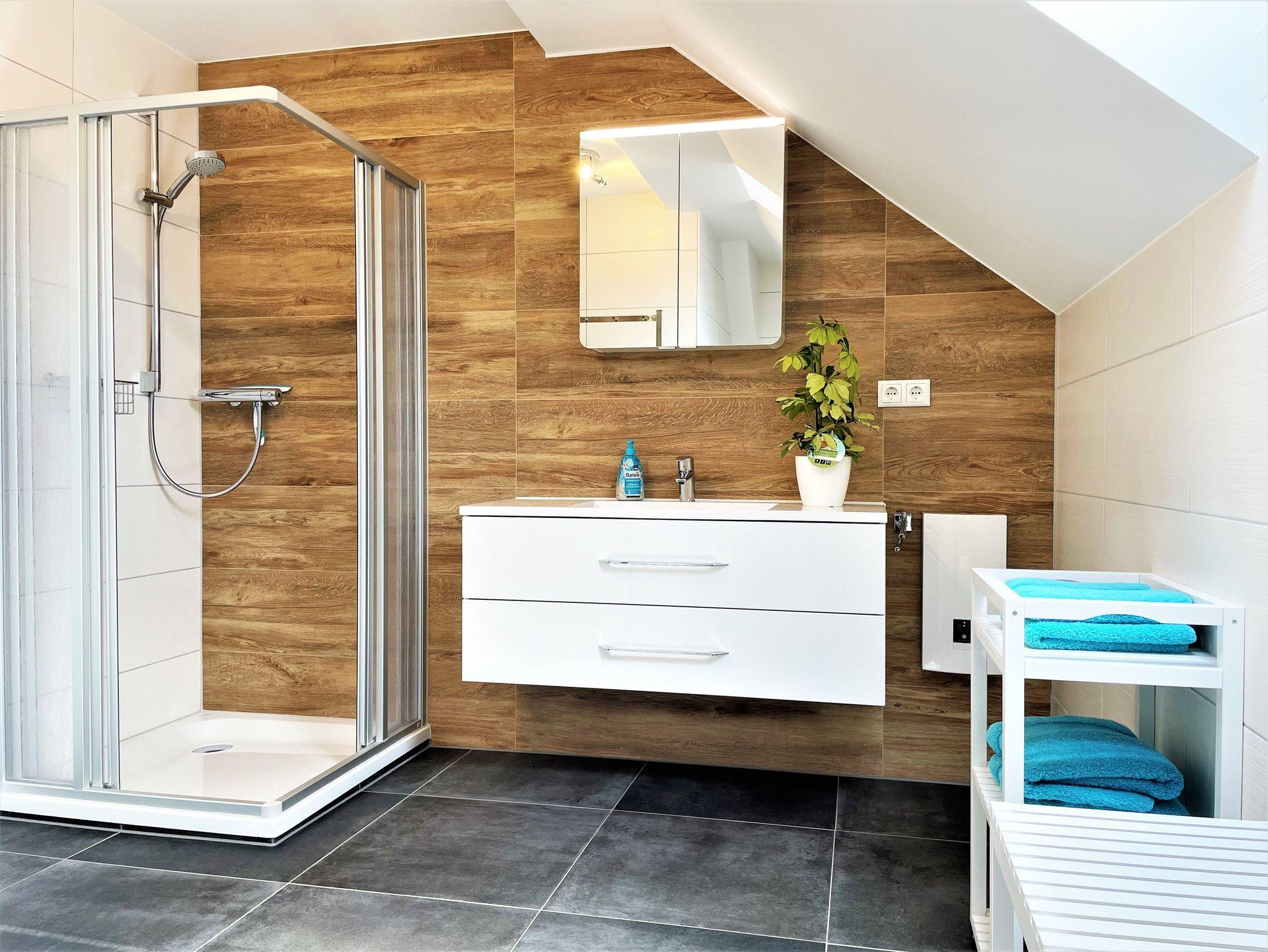 Die 86 m² große Nichtraucherferienwohnung hat 3 Zimmer, befindet sich in der oberen Etage und eignet sich ideal für 4 Personen. Alle Zimmer sind farblich, hell und harmonisch aufeinander abgestimmt. Das Wohnzimmer ist mit einer modernen Schrankwand, großem TV-Flachbildschirm und einem bequemen Ecksofa eingerichtet. Weiterhin befindet sich ein Esstisch im Wohnzimmer, an dem 4 Personen speisen können. Ein Schlafzimmer verfügt über 2 getrennt stehende Schlafmöglichkeiten und einer Kommode. Im 2 Schlafzimmer steht Gästen ein Boxspringbett zu Verfügung sowie ein großer Kleiderschrank, Kommode und ein TV-Flachbildschirm.