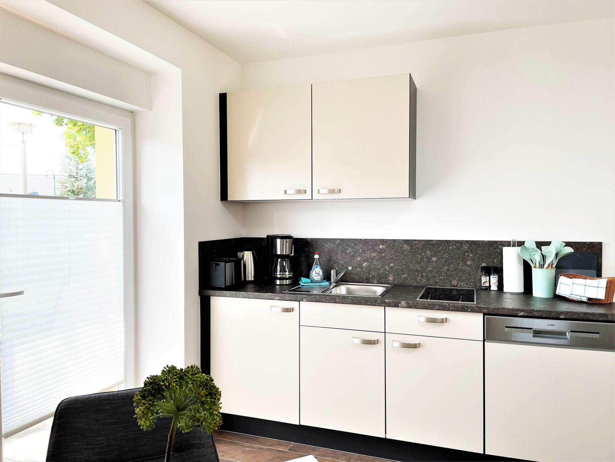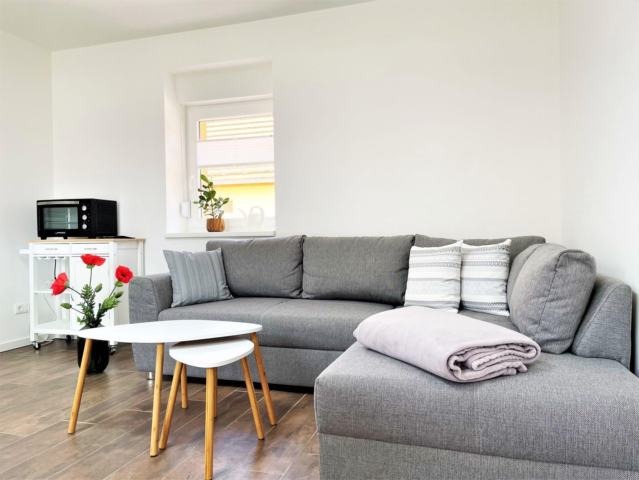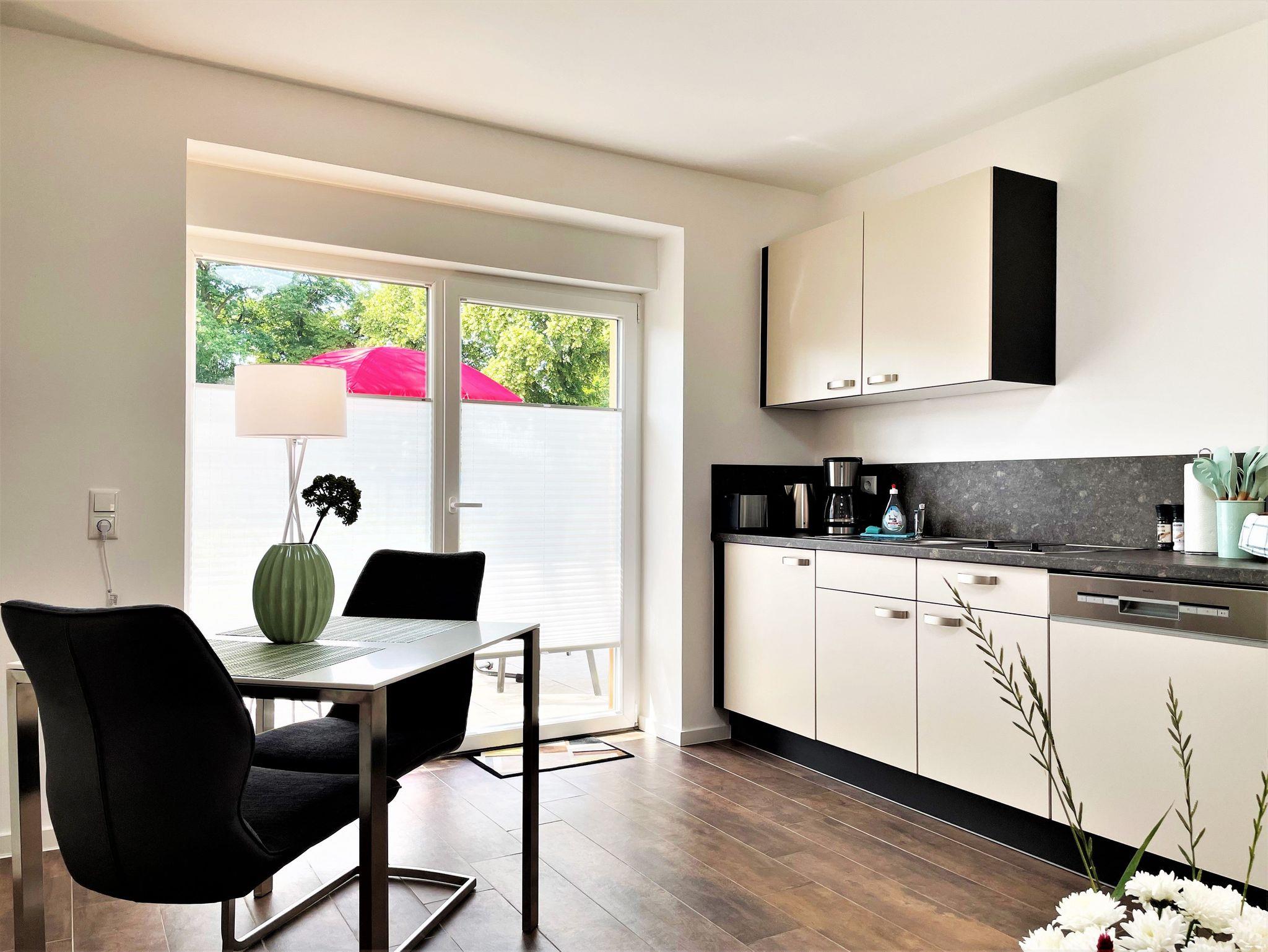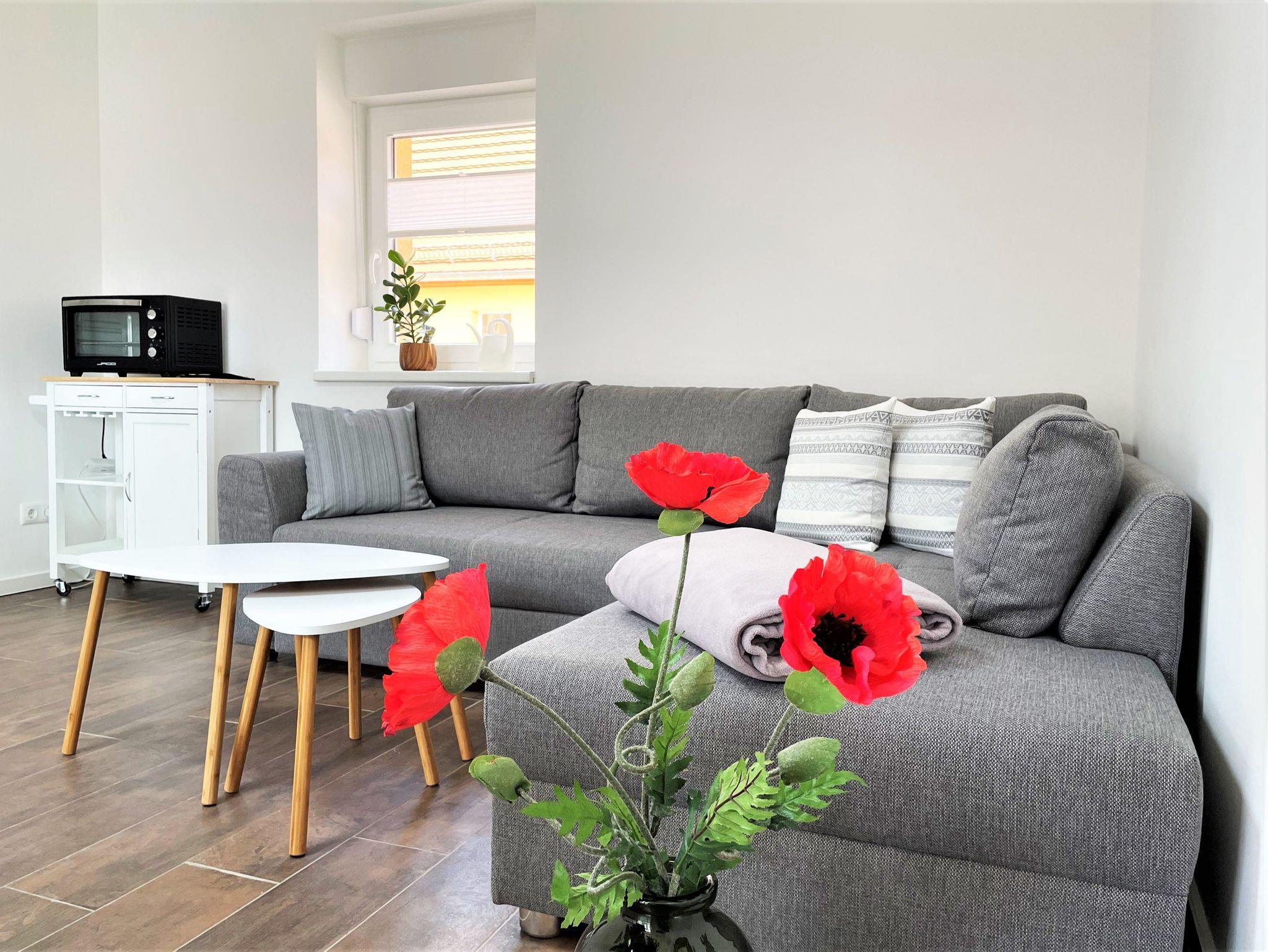 Die 52 m² große Nichtraucherferienwohnung ist ebenerdig gelegen, ist vom Innenhof aus begehbar und ideal für 2 Personen geeignet. Im Wohnbereich befindet sich eine offene, gut ausgestattete Küche sowie ein Esstisch mit Bestuhlung. Weiterhin gibt es ein gemütliches Ecksofa mit Beistelltischen und ein TV-Flachbildschirm. Das helle und zeitgemäß eingerichtete Schlafzimmer verfügt über ein bequemes Boxspringbett, Kleiderschrank, eine Kommode und einen zusätzlichen TV-Flachbildschirm. Im Badezimmer finden Gäste eine Dusche, WC sowie einen modernen Waschtisch mit Spiegelschrank vor. Der Flurbereich ist mit einer Garderobe und Spiegel ausgestattet. Eine eingebaute Fußbodenheizung sorgt im Winter für eine wohlige Wärme und im Sommer kühlt diese die Raumtemperatur herunter. WLAN, Parkplatz und Fahrradabstellplätze incl. Steckdose sind im Endpreis enthalten.