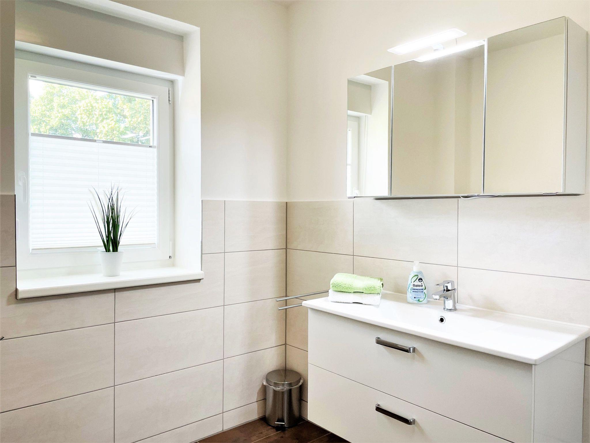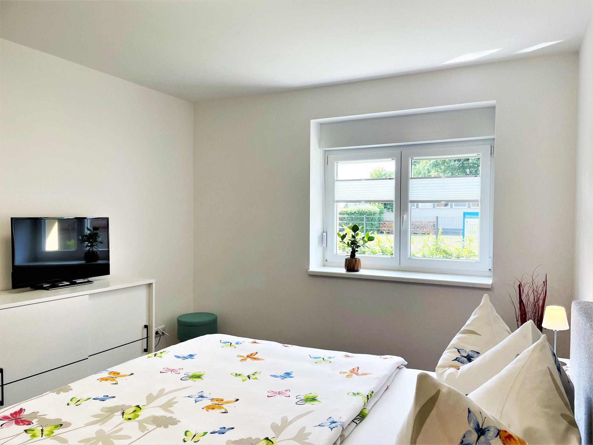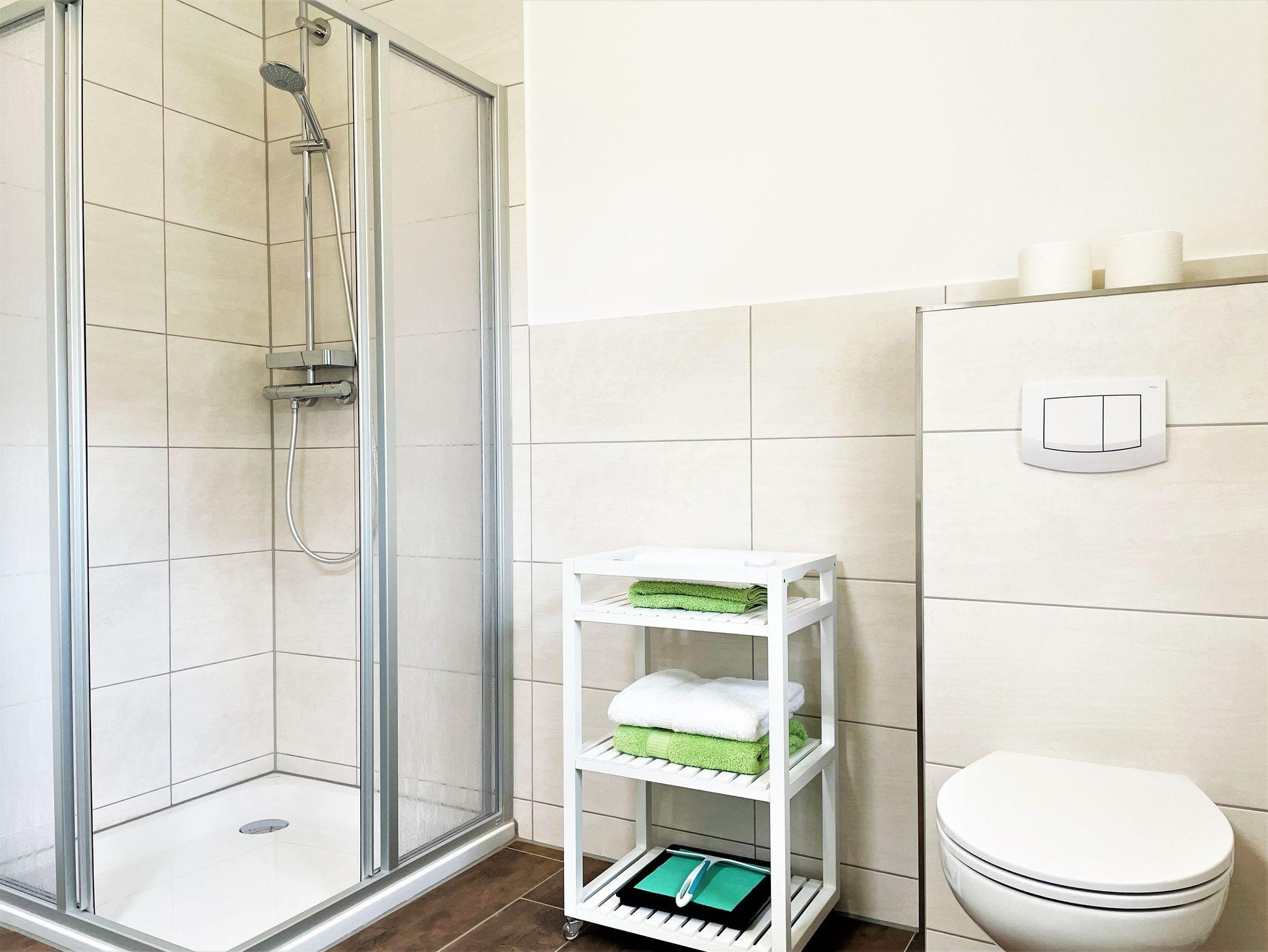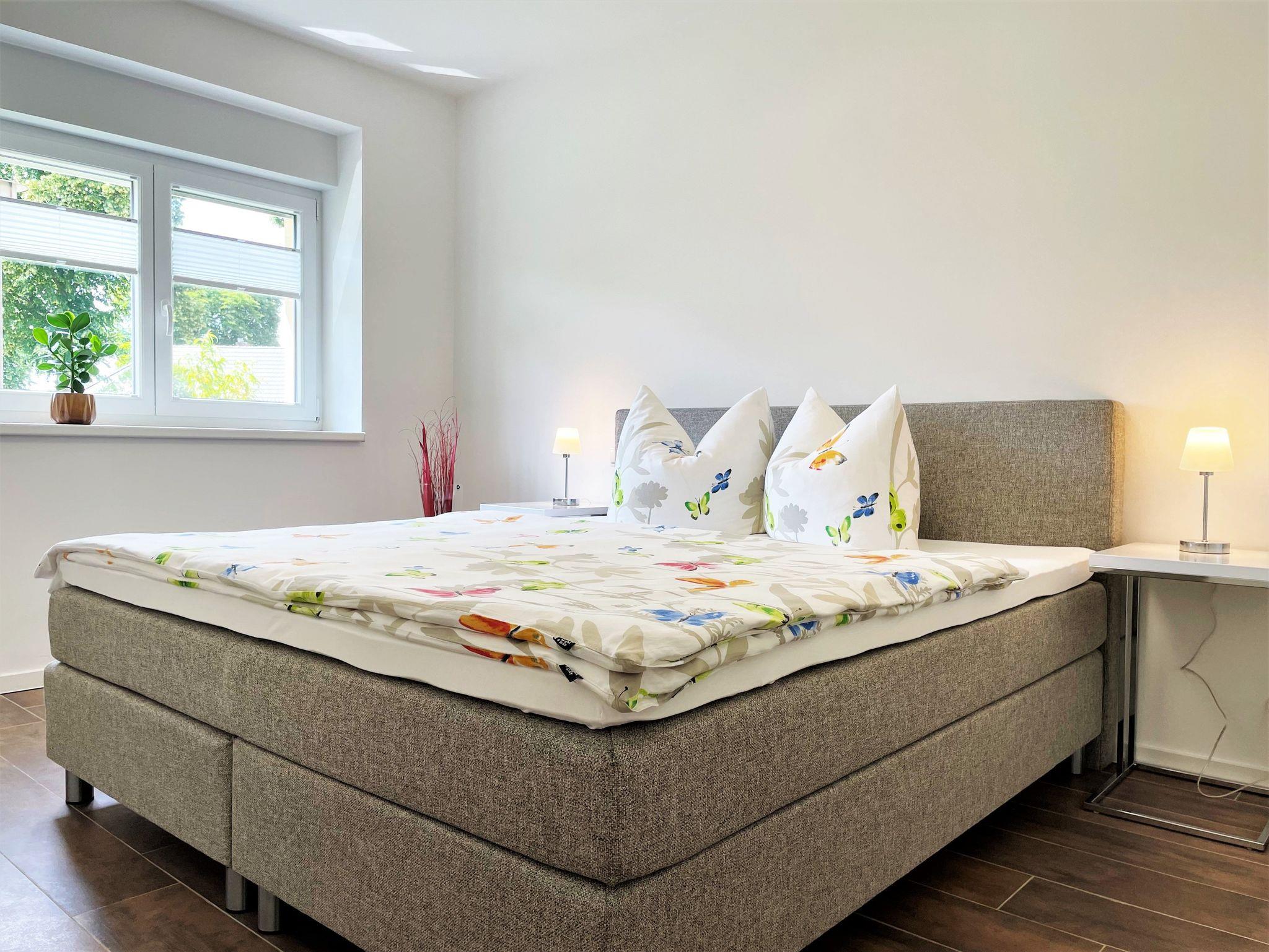 Die 52 m² große Nichtraucherferienwohnung ist ebenerdig gelegen, ist vom Innenhof aus begehbar und ideal für 2 Personen geeignet. Im Wohnbereich befindet sich eine offene, gut ausgestattete Küche sowie ein Esstisch mit Bestuhlung. Weiterhin gibt es ein gemütliches Ecksofa mit Beistelltischen und ein TV-Flachbildschirm. Das helle und zeitgemäß eingerichtete Schlafzimmer verfügt über ein bequemes Boxspringbett, Kleiderschrank, eine Kommode und einen zusätzlichen TV-Flachbildschirm. Im Badezimmer finden Gäste eine Dusche, WC sowie einen modernen Waschtisch mit Spiegelschrank vor. Der Flurbereich ist mit einer Garderobe und Spiegel ausgestattet. Eine eingebaute Fußbodenheizung sorgt im Winter für eine wohlige Wärme und im Sommer kühlt diese die Raumtemperatur herunter. WLAN, Parkplatz und Fahrradabstellplätze incl. Steckdose sind im Endpreis enthalten.