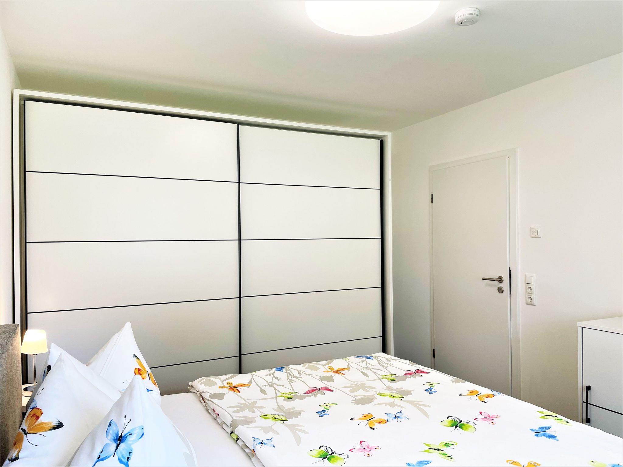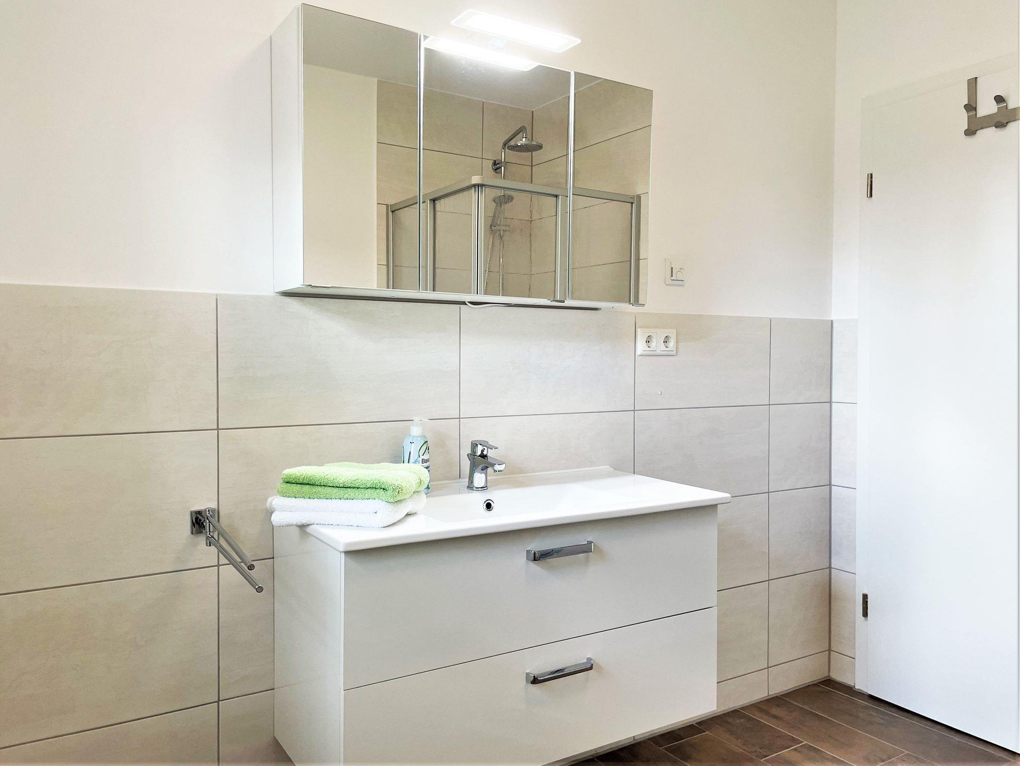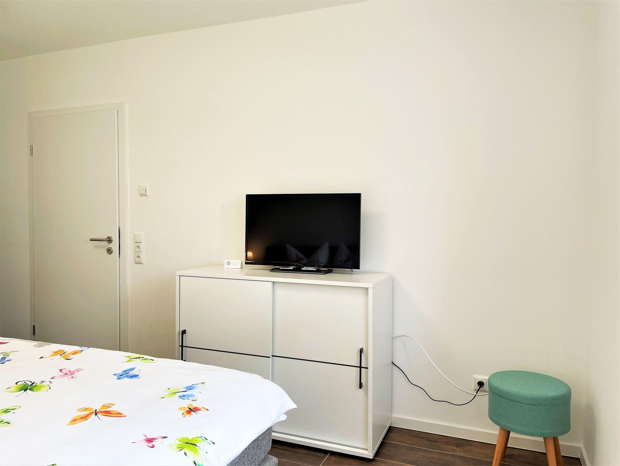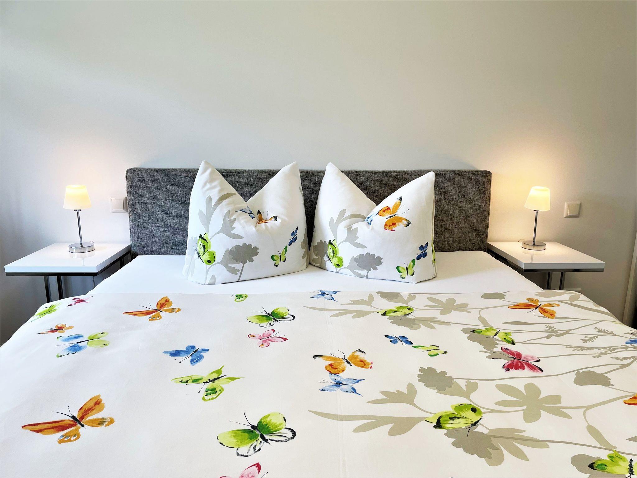 Die 52 m² große Nichtraucherferienwohnung ist ebenerdig gelegen, ist vom Innenhof aus begehbar und ideal für 2 Personen geeignet. Im Wohnbereich befindet sich eine offene, gut ausgestattete Küche sowie ein Esstisch mit Bestuhlung. Weiterhin gibt es ein gemütliches Ecksofa mit Beistelltischen und ein TV-Flachbildschirm. Das helle und zeitgemäß eingerichtete Schlafzimmer verfügt über ein bequemes Boxspringbett, Kleiderschrank, eine Kommode und einen zusätzlichen TV-Flachbildschirm. Im Badezimmer finden Gäste eine Dusche, WC sowie einen modernen Waschtisch mit Spiegelschrank vor. Der Flurbereich ist mit einer Garderobe und Spiegel ausgestattet. Eine eingebaute Fußbodenheizung sorgt im Winter für eine wohlige Wärme und im Sommer kühlt diese die Raumtemperatur herunter. WLAN, Parkplatz und Fahrradabstellplätze incl. Steckdose sind im Endpreis enthalten.
