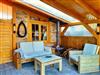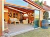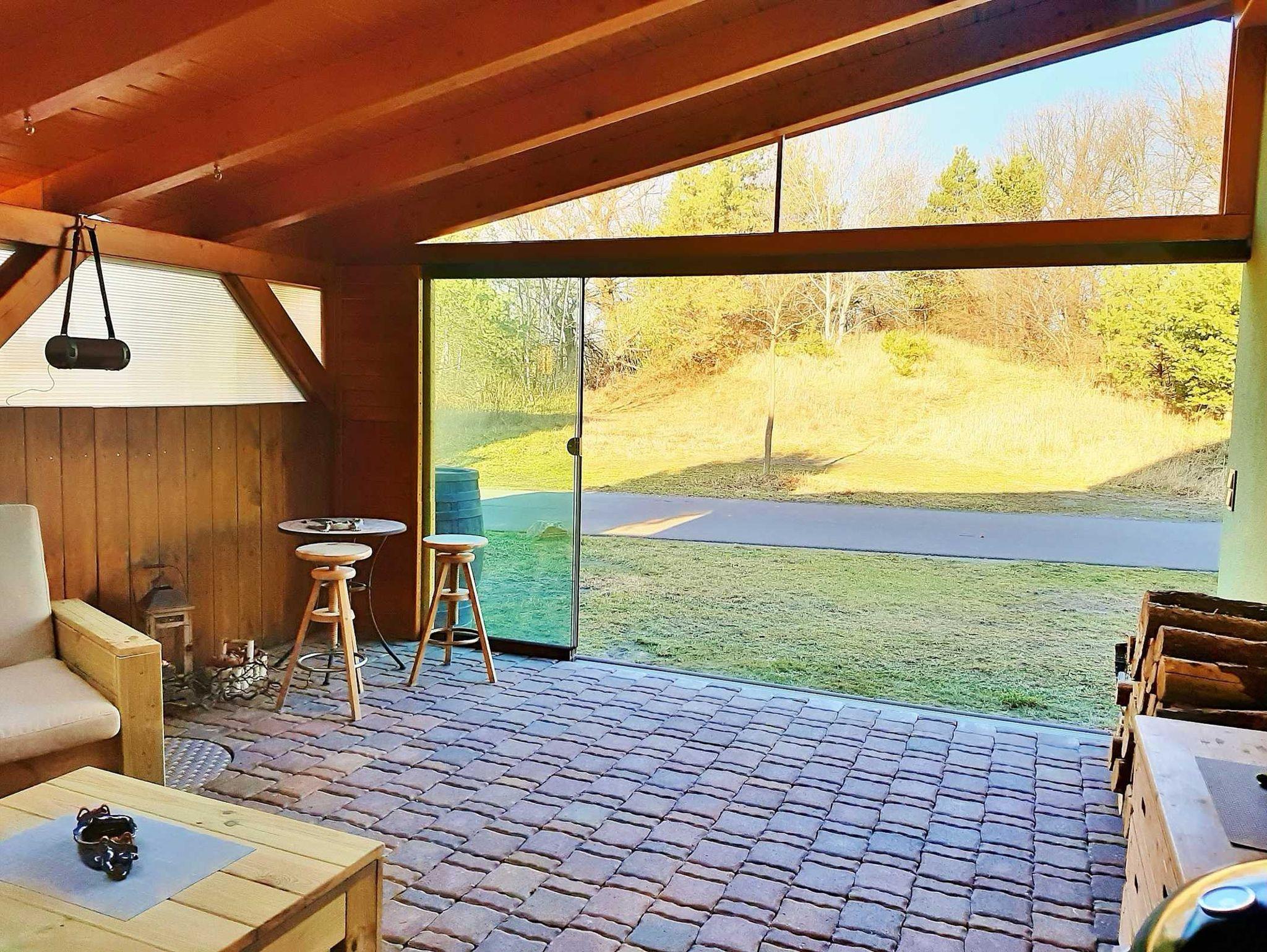 Im überdachten Außenbereich befindet sich eine chillige Sitzecke mit einem Grill und für die etwas kälteren Abende ein Kamin. Der Außenbereich kann komplett verschlossen werden.