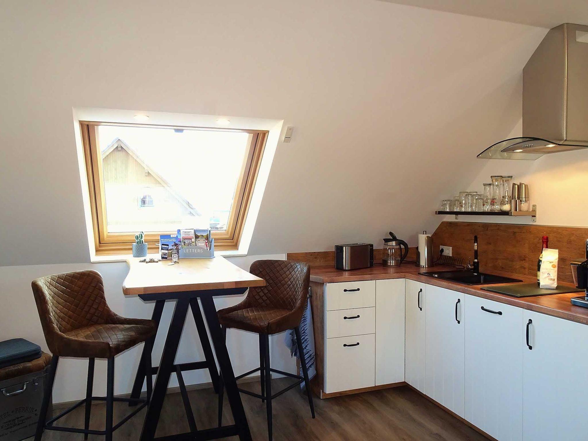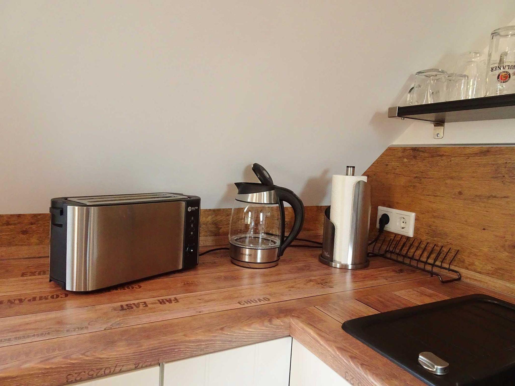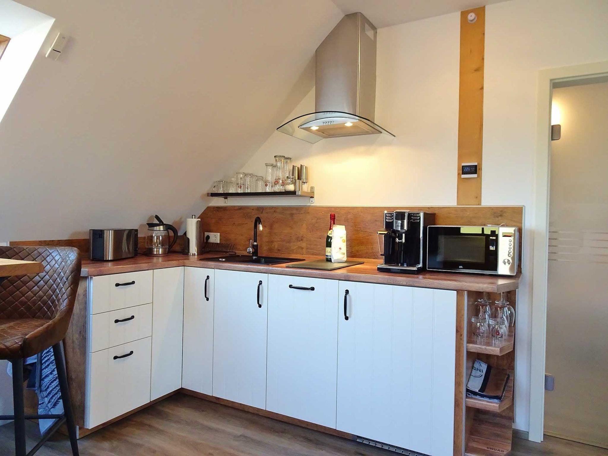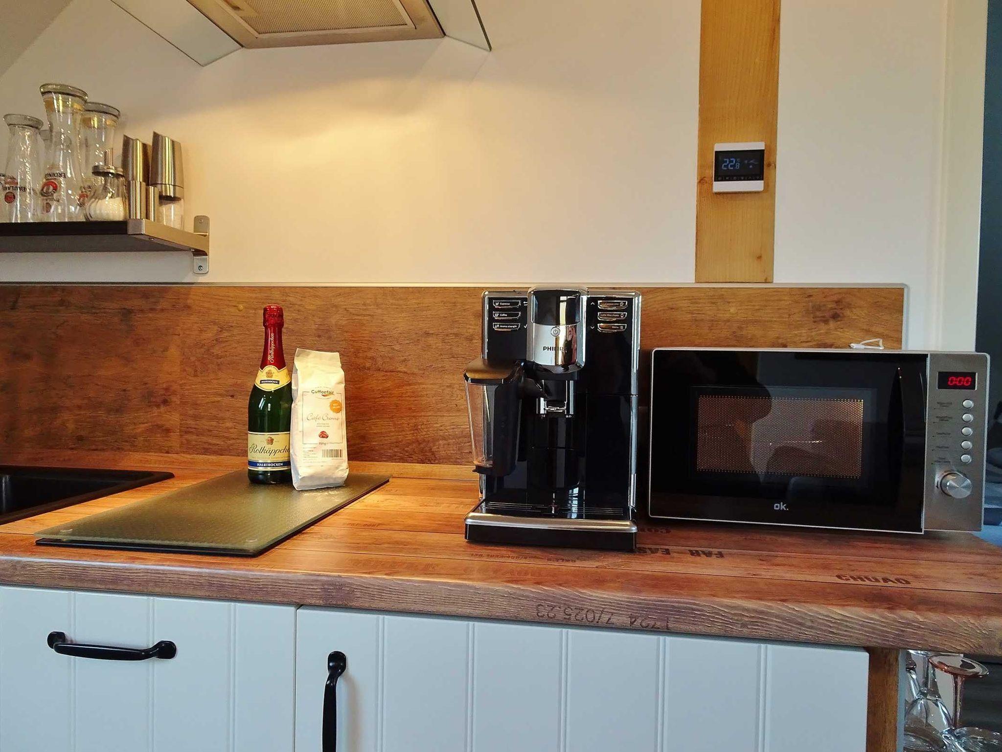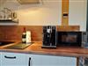 Die Küche beinhaltet ein Cerankochfeld, Abzugshaube, Kaffeevollautomat, Toaster, Wasserkocher, Kühlschrank mit Gefrierfach *** und eine Mikrowelle mit Grill.