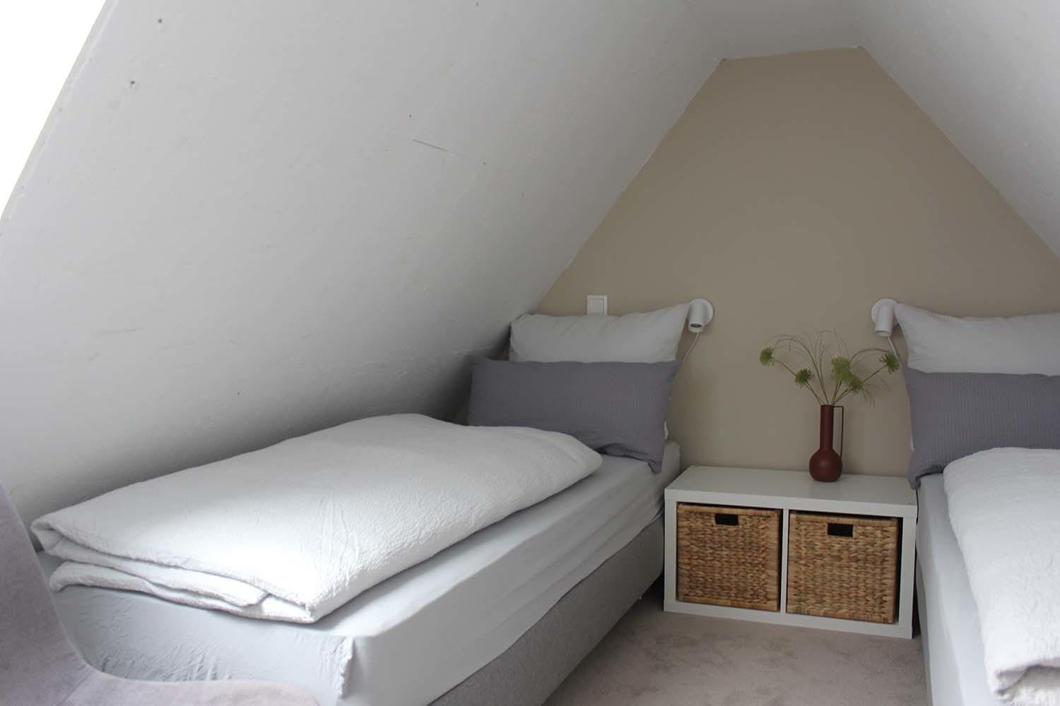 Die Ferienwohnung "Flut" liegt im ersten Stockwerk und bietet auf 45 Quadratmetern Platz für zwei Erwachsene (Doppelbett) und zwei Kinder (Einzelbetten). Die Mindestaufenthaltsdauer beträgt fünf Übernachtungen. Die Wohnung ist nicht barrierefrei.