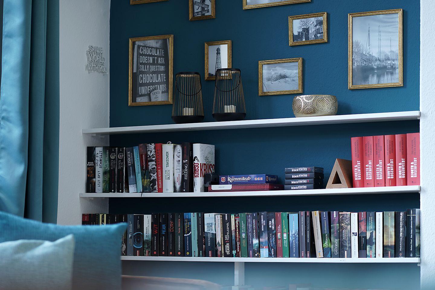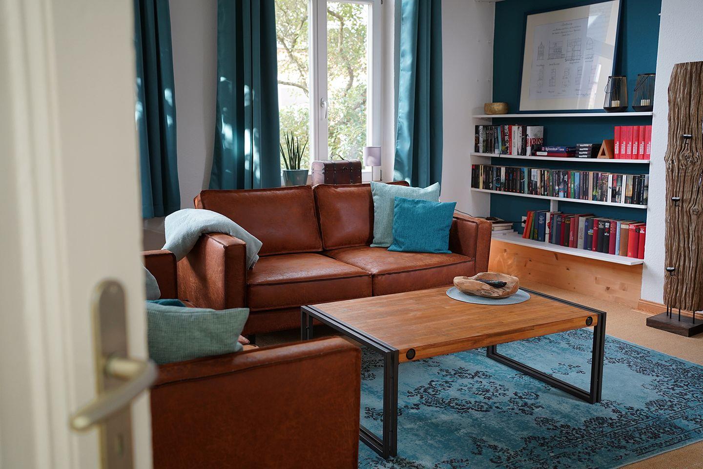 Im ersten Obergeschoss befindet sich das helle und großzügige Wohnzimmer mit TV und der „Hausbibliothek“ für gemütliche Schmökerabende.