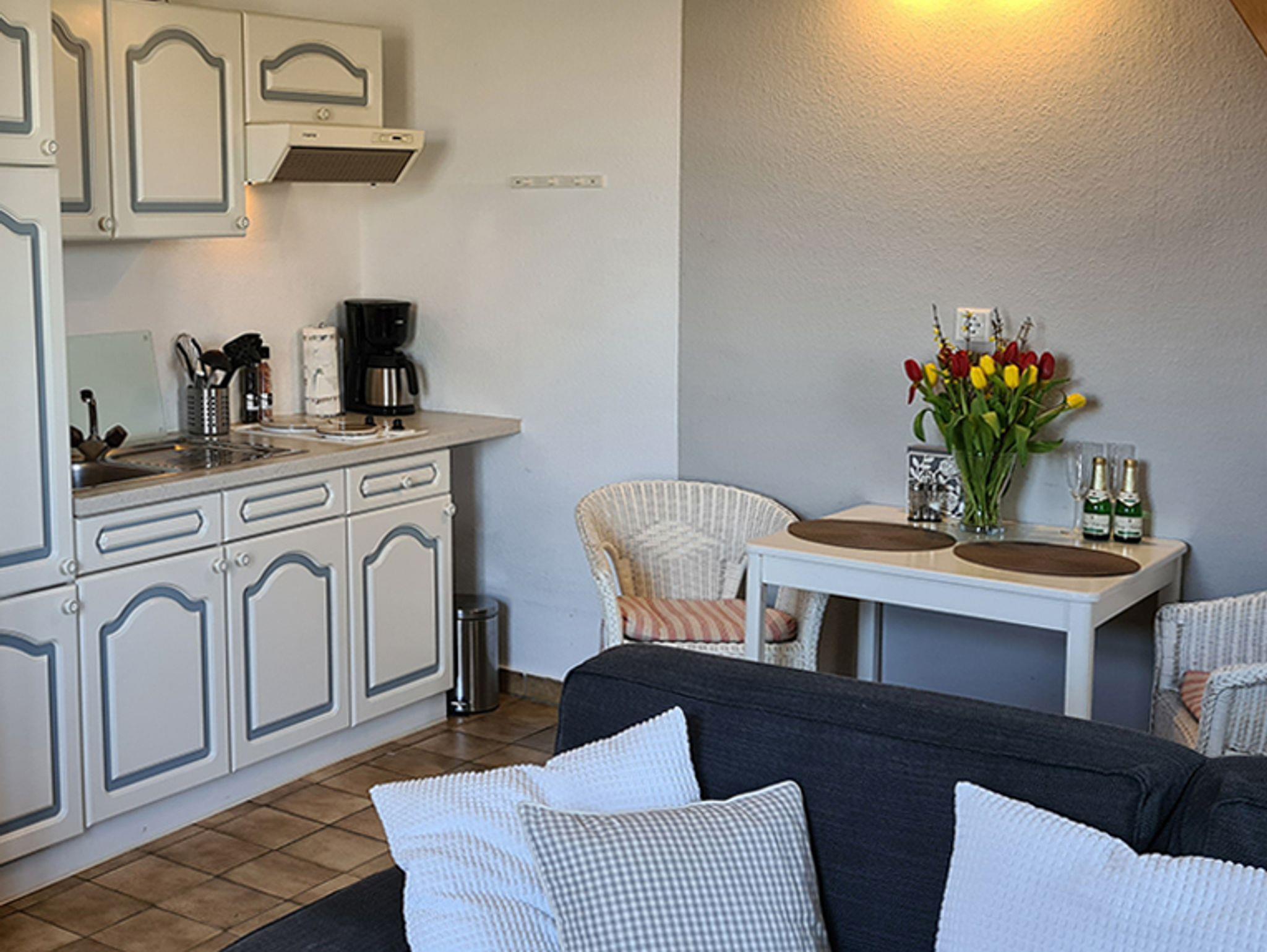 Im Erdgeschoss befindet sich der gemütliche Wohnraum mit integrierter, vollausgestatteter Einbauküchenzeile. Zur Ausstattung gehören 2 Herdplatten, Mikrowelle, Kühlschrank, Kaffeemaschine, Wasserkocher, Toaster und ein Handmixer. Außerdem finden Sie im Wohnbereich einen Eßtisch, ein gemütliches Schlafsofa für 2 Personen einen Flat-TV, DVD-Player, CD Radio mit USB/Bluetoothfunktion und freies W-Lan. Fliegengitter sind in der Wohnung vorhanden. Über die Raumspartreppe gelangen Sie in das Schlafzimmer mit Doppelbett, Kommode, Kleiderstange, Verdunkelungsrollo und Flat TV. Von hier aus haben Sie einen herrlichen Blick ins Binnenland und auf den hinter dem Grundstück verlaufenden Sielzug. Das Badezimmer ist mit Duschkabine, WC, Fön und Waschbecken ausgestattet. Die Wohnung ist sehr modern und mit viel Liebe zum Detail eingerichtet und bietet ein ganz besonderes Wohnerlebnis.