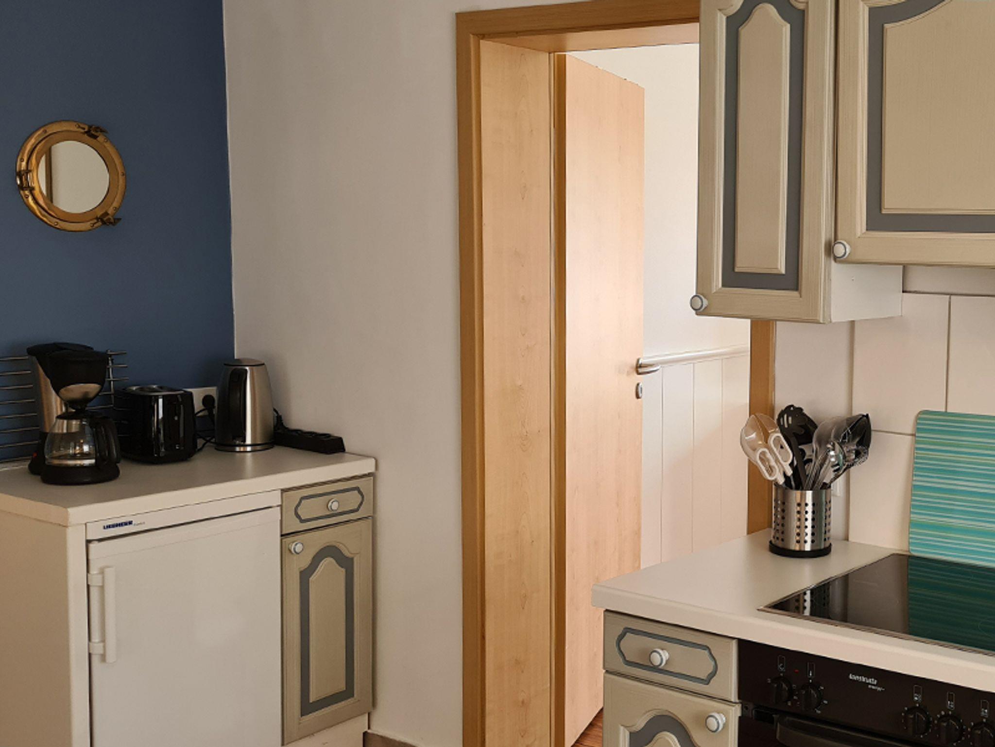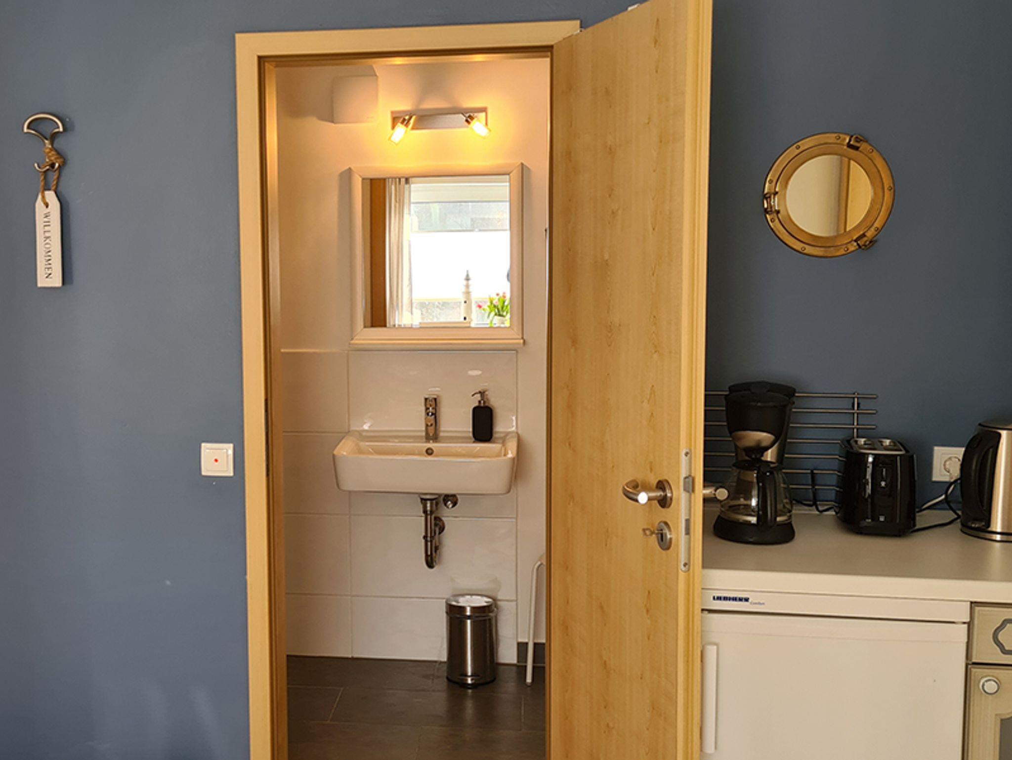 Die Ferienwohnung Störtebeker (40 m2) für 1 - 3 Personen (Nichtraucher) liegt im Erdgeschoß des Hauses Schau ins Land. Das helle Wohnzimmer ist modern und stilvoll eingerichtet. Von hier aus schauen Sie über den Garten hinweg und genießen den herrlichen Weitblick übers Land und Felder bis zum Deich der nahegelegenen Nordsee. Im Wohnzimmer befindet sich eine gemütliche Sofaecke, ein Sat-TV und eine Stereoanlage mit Bluetooth/USB-Funktion. Freies W-Lan ist verfügbar. Seitlich steht zusätzlich ein ausziehbares Tagesbett (0,80 m x 2,00 m). Die vollausgestattete Küche mit Küchenzeile bietet Ihnen alles, was man benötigt. Einen Herd mit Ceranfeld und Backofen, ein Geschirrspüler, ein Kühlschrank mit Gefrierfach, eine Kaffeemaschine, Wasserkocher, Toaster und einen Handmixer. Es ist dort genug Platz für einen Esstisch mit 4 Stühlen. Im Schlafzimmer befindet sich ein Doppelbett (1,40 m x 2,00 m) und 2 hohe Kommodenschränke. Verdunkelungsvorhänge sind ebenfalls vorhanden. Das Badezimmer ist ausgestattet mit einer ebenerdigen Dusche, Waschbecken, Spiegel, Hänge-WC und einem Fön. Die Ferienwohnung ist hell, liebevoll und modern eingerichtet. Der Gemeinschaftsgarten kann mit genutzt werden. Sitzgelegenheiten sind vorhanden. Ihr Hund ist uns willkommen. Parkmöglichkeiten sind direkt vor dem Haus vorhanden.