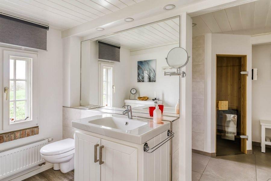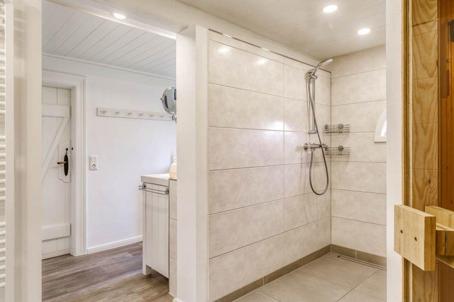 Das Bad im Erdgeschoss ist das Hauptbad mit großem Duschbereich und Sauna.