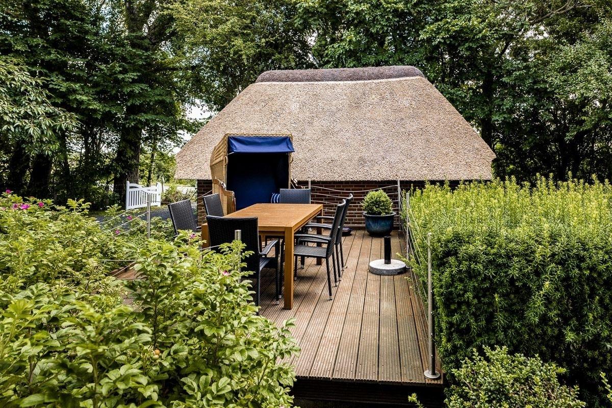 Das große Gartengrundstück (ca. 300 qm) ist komplett mit einem Schafsdrahtzaun umschlossen. Die Zaunhöhe liegt bei ca. 1,10m. Die Unterseite ist ab dem Boden ca. 0,1m maximal geöffnet. Für normalgroße Hunde besteht somit keine Gefahr des Weglaufens. Der Rundweg ums Haus ist mit dem ortstypischen Katzenkopfpflaster verlegt. Im großzügigen Garten befinden sich Liegestühle und Bänke. Hier können Sie auch gemeinsam Grillen. Die Holzterrasse mit Sonnenschirm ist eines der beliebten Highlights. Wunderbar für den Rotwein in den Abendstunden und den Ausklang eines erlebnisreichen Tages. In einem abschließbaren Unterstand können Sie Ihre eigenen Fahrräder sicher parken.
