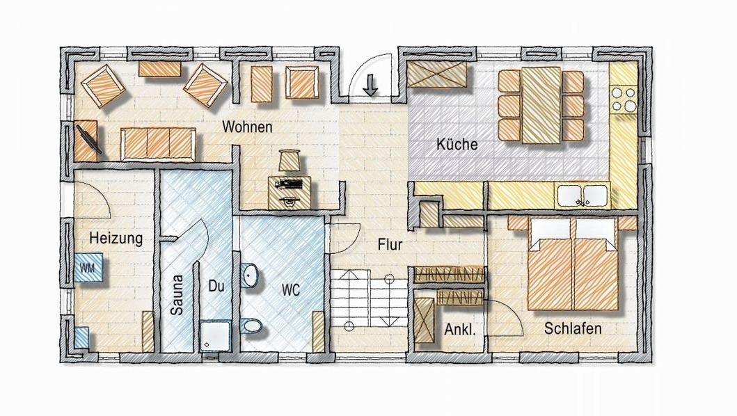 Die Küche ist modern gestaltet und doch gleichzeitig gemütlich und geschmackvoll eingerichtet. Sämtliche technische Geräte und Hilfsmittel sind zu vorhanden, wie Spülmaschine, Elektroherd, Kühlschrank mit Gefrierfach, Mikrowelle und vieles mehr.