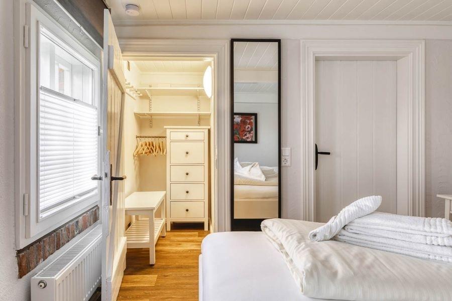 Als begehbarer Kleiderschrank dient hier eine bestens geeignete Kammer.