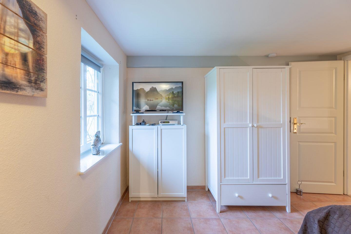 Das ca. 40 qm große Apartment ist ebenfalls über den Hauseingang erreichbar. Es verfügt über einen kombinierten Wohn-Schlafraum (mit TV), ein großzügiges Duschbad sowie eine kleine, voll eingerichtete Küche mit Essplatz. Im EG ist ein zusätzliches Gäste-WC vorhanden.