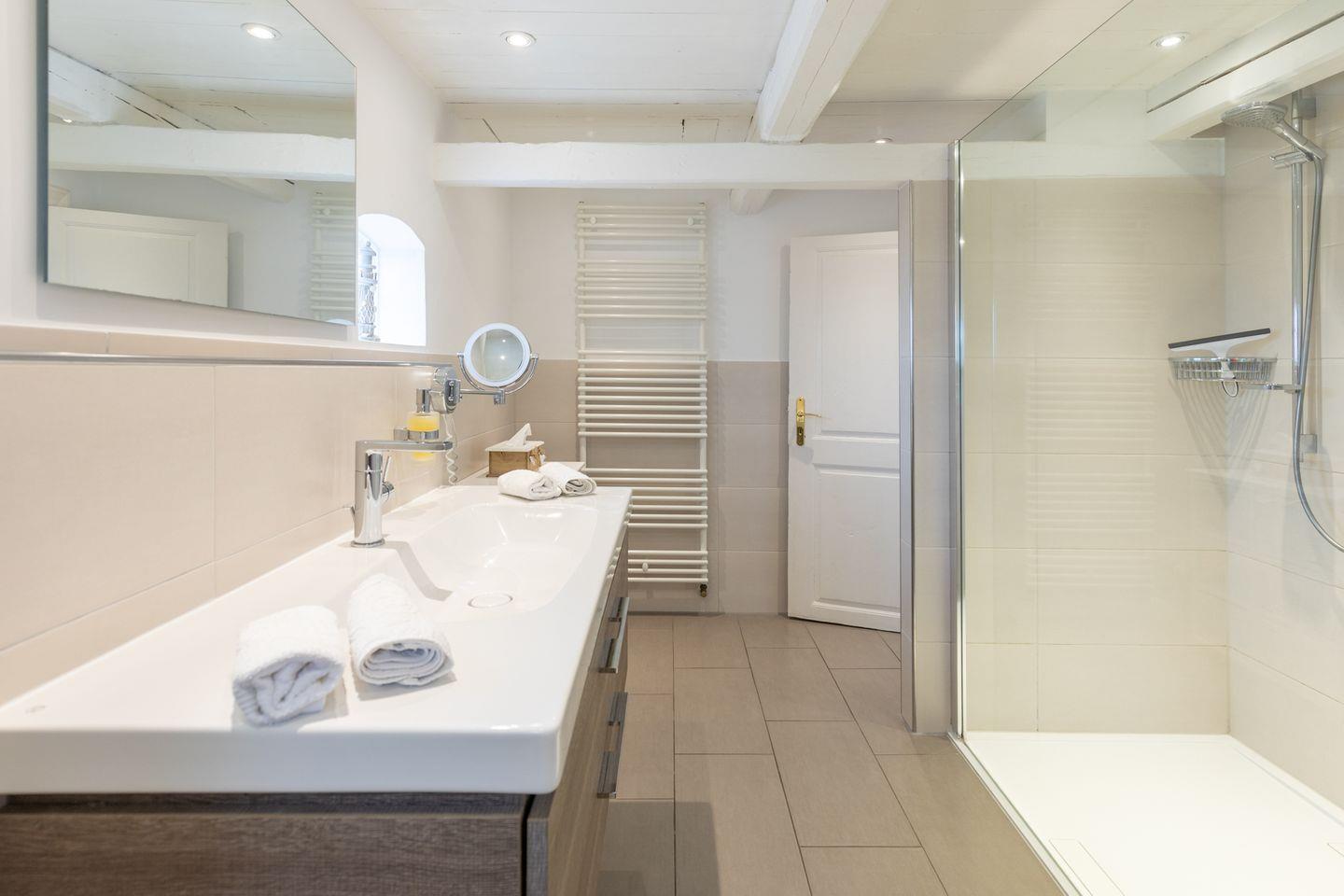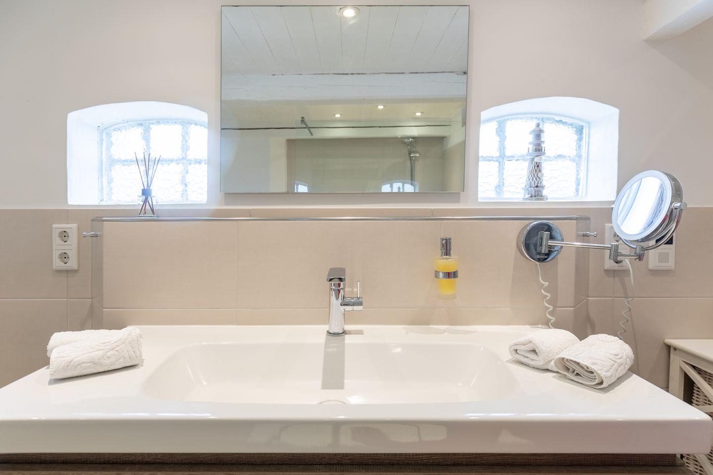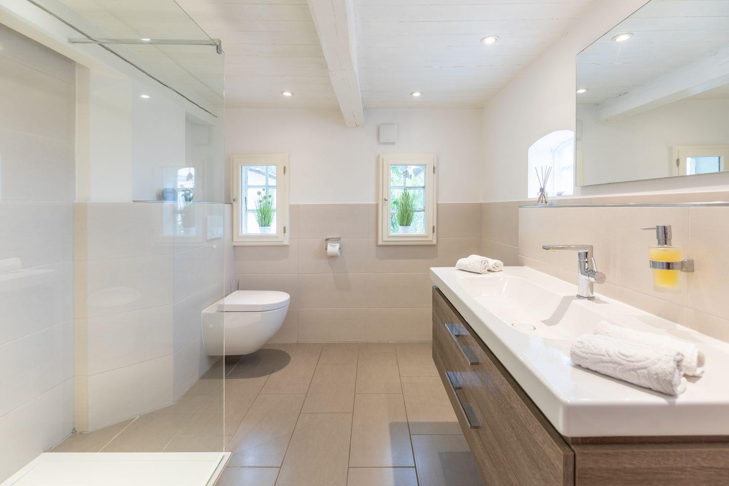 Die offene Küche ist mit einem Geschirrspüler, Herd, Backofen, einer Mikrowelle und einem Kühlschrank mit Gefrierfach ausgestattet. Ebenfalls zur Küchenausstattung gehören Grohe Blue Wasserfiltertechnik für gekühltes Mineralwasser (still/medium), Nescafé Dolce Gusto und normale Kaffeemaschine, Toaster, Wasserkocher, Eierkocher, Mixer, Waffeleisen, Besteck und Geschirr in 12-facher Ausfertigung und Gläser in allen Variationen. Der große Esstisch lädt zu gemütlichen Abenden im Kreise der Freunde oder Familie ein. Eine Waschmaschine steht Ihnen zur Verfügung.