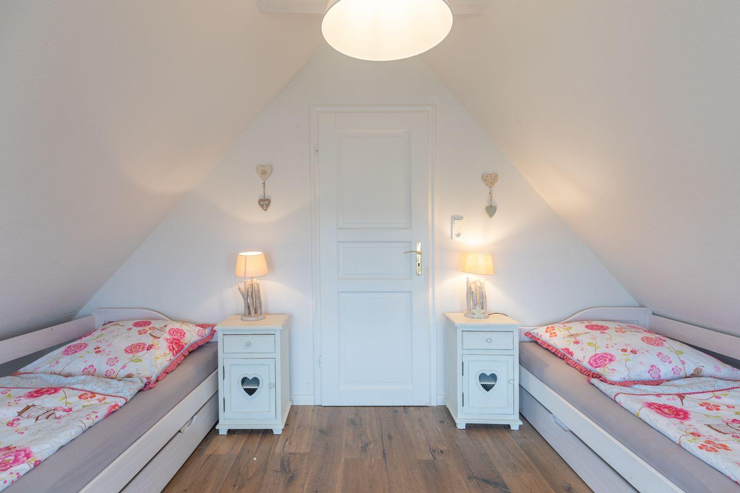 Das 140 qm große Ferienhaus wurde im klassischen Landhausstil eingerichtet und bietet Platz für bis zu 6 Personen. Zwei Schlafzimmer befinden sich im Obergeschoss: eines mit einem Doppelbett (180 x 200 m) und einem gemütlichen Sofa und TV als Rückzugsort und ein weiteres mit zwei Einzelbetten, das sich für Kinder und junge Erwachsene hervorragend eignet. Ebenso befindet sich auf dieser Etage ein kleines Duschbad mit WC.