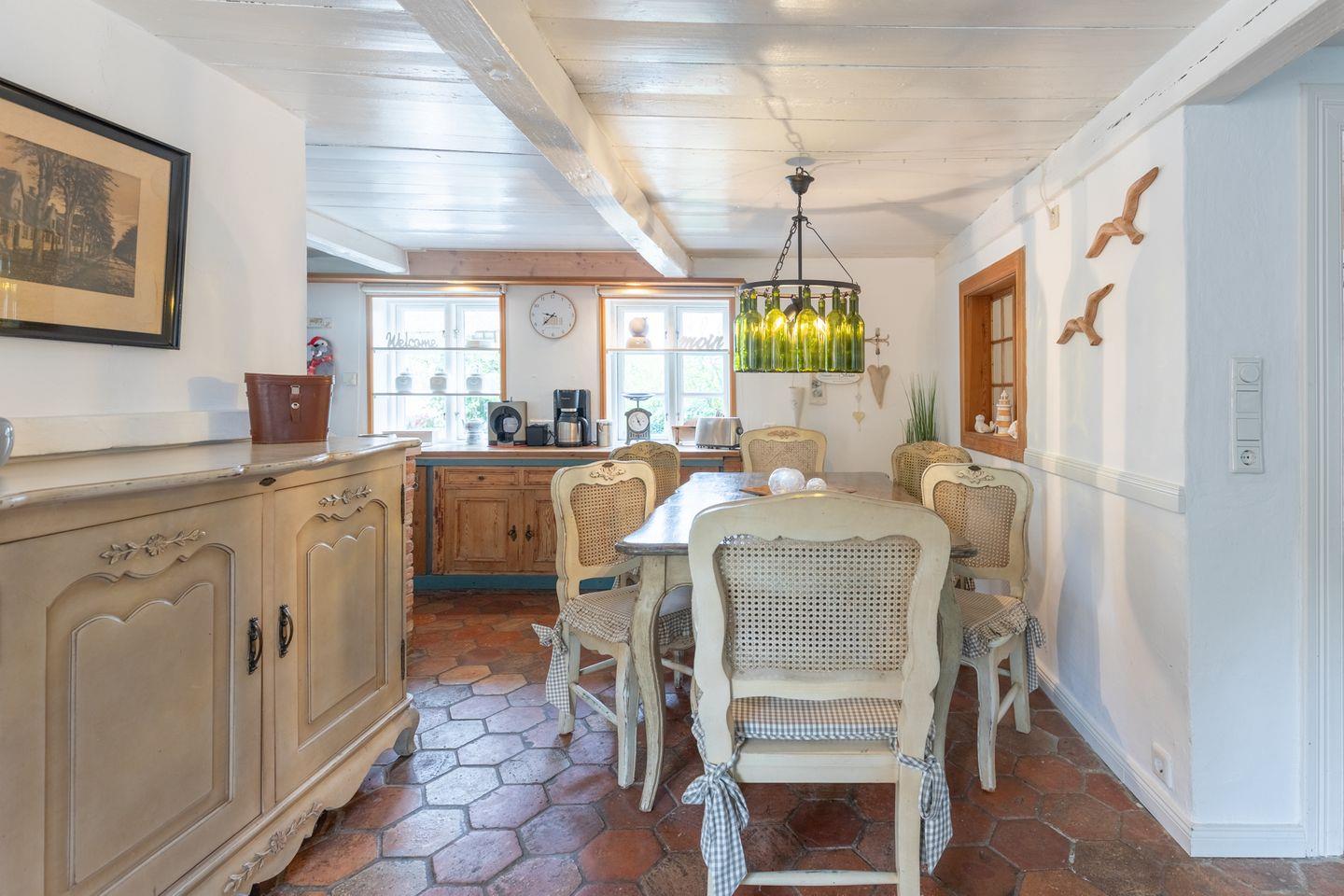 Erleben Sie das romantische Ferienhaus Witthuis - Perle am Deich in Emmelsbüll-Horsbüll, Nordfriesland. Das reetgedeckte Haus von 1840 bietet Platz für bis zu 6 Personen und liegt nur wenige Schritte von der Nordseeküste und dem Wattenmeer entfernt. Das 140 qm große Haus im Landhausstil verfügt über 3 Schlafzimmer, ein gemütliches Wohnzimmer mit Kamin, eine gut ausgestattete Küche und eine sonnige Terrasse. Der große eingezäunte Garten ist ideal für Familien und Haustiere.