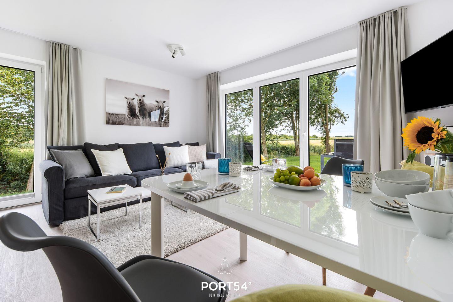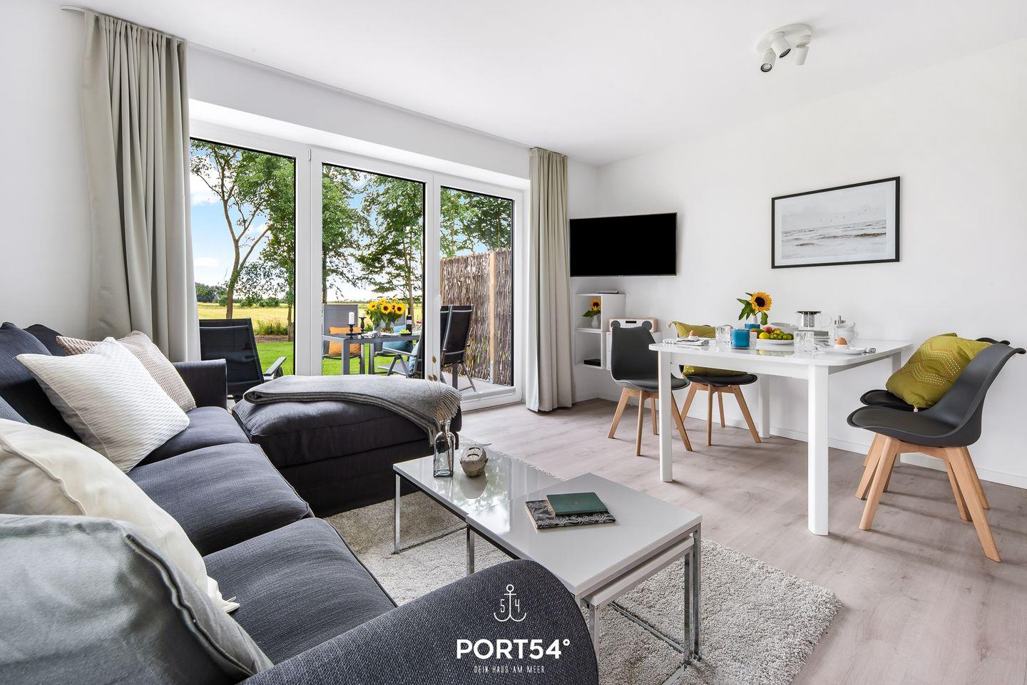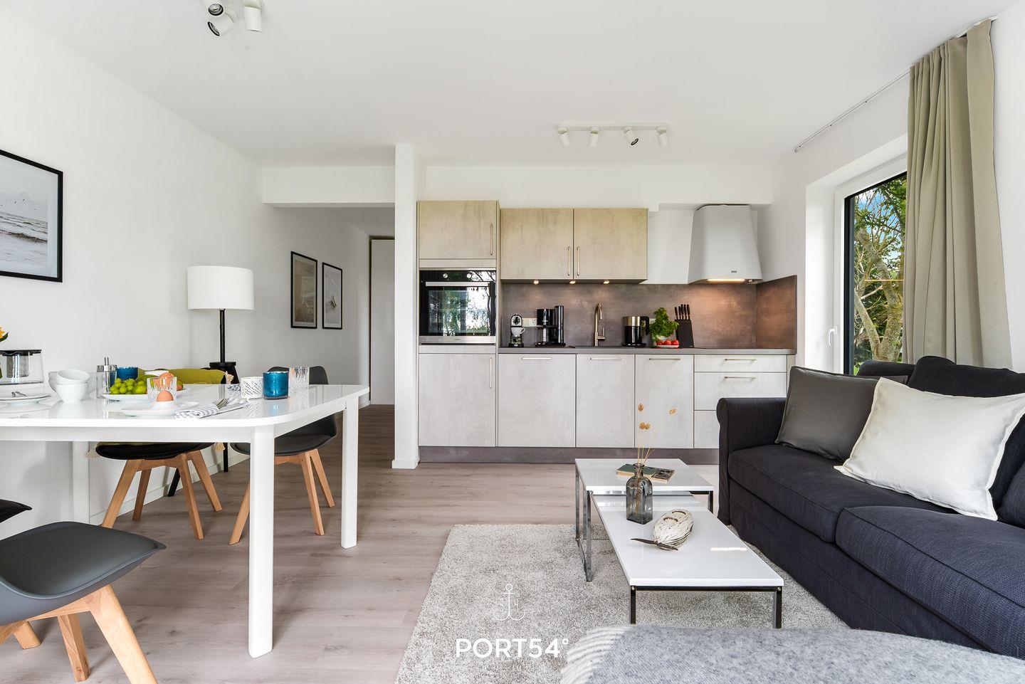 Das Wohnzimmer lädt zu gemütlichen Stunden ein. Die Küche ist modern und voll ausgestattet, sodass Sie hier wunderbar kochen können. Das Schlafzimmer ist hochwertig eingerichtet und verfügt über ein Doppelbett (180cmx200cm). Für weitere 2 Personen steht im Wohnzimmer ein gemütliches Schlafsofa zur Verfügung. Das helle Badezimmer hat eine Dusche. Die gesamte Wohnung verfügt über eine Fußbodenheizung. Auf der angrenzenden Sonnenterrasse mit einem Gemeinschaftsgarten können Sie herrliche Stunden an der frischen Nordseeluft verbringen und gemeinsame Grillabende veranstalten. Ein Elektrogrill steht Ihnen dafür zu Verfügung.
