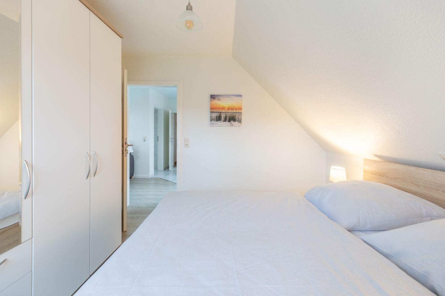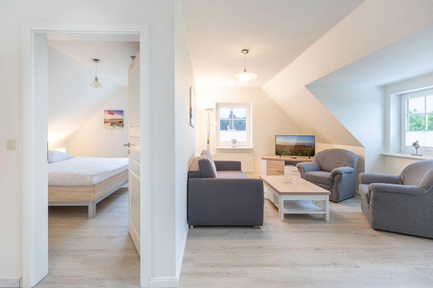 Die gemütliche Wohnung verfügt über ein Wohnzimmer mit bequemer Sitzgelegenheit und ein Schlafsofa (190 x 160). Der angrenzende Essbereich lädt zu geselligen Runden ein. Das Schlafzimmer ist mit einem komfortablen Doppelbett ausgestattet. In der Küche stehen Ihnen Cerankochfeld, Backofen, Kühlschrank, Kaffeemaschine, Mikrowelle, Brötchenaufbackautomat und Wasserkocher zur Verfügung. Das moderne Duschbad ist geräumig und verfügt über viel Tageslicht.