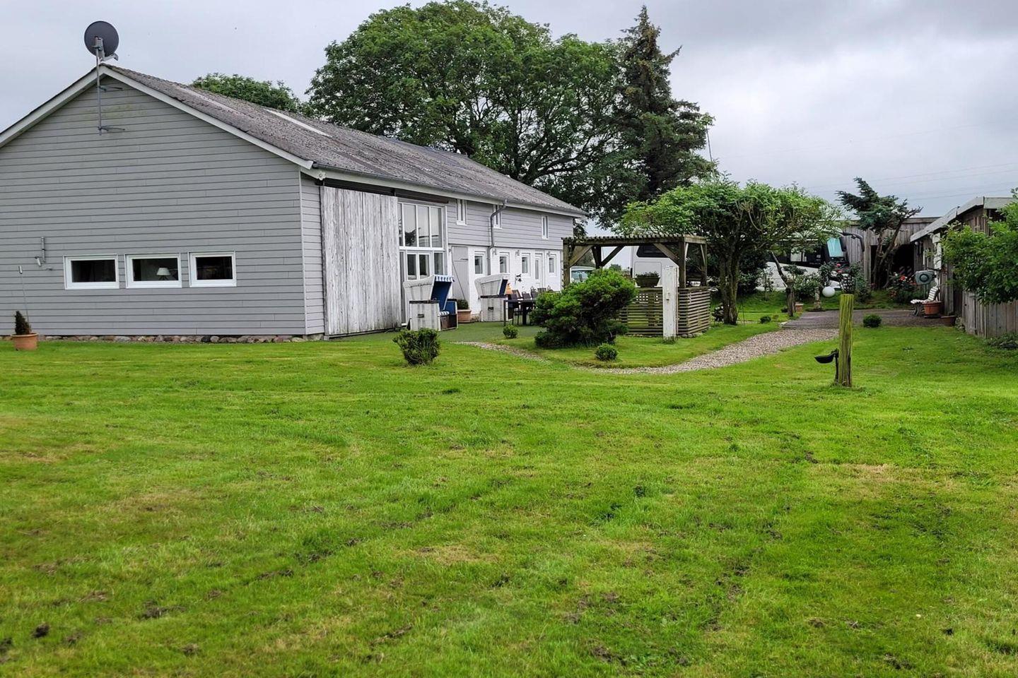 Die Außenanlage der Ferienwohnung lädt zu entspannten Momenten ein. Genießen Sie die frische Luft auf der Terrasse, wo Gartenmöbel und ein Grill bereitstehen. Sonnenliegen und ein Sonnenschirm sind ebenfalls vorhanden, sodass Sie ungestört die Sonne genießen können. Der Garten bietet zudem einen klaren Blick auf die umgebende Landschaft, die Ihnen einen beruhigenden Ausblick bietet. Unser Highlight ist der Platz im Strandkorb mit Ausblick über die Felder.