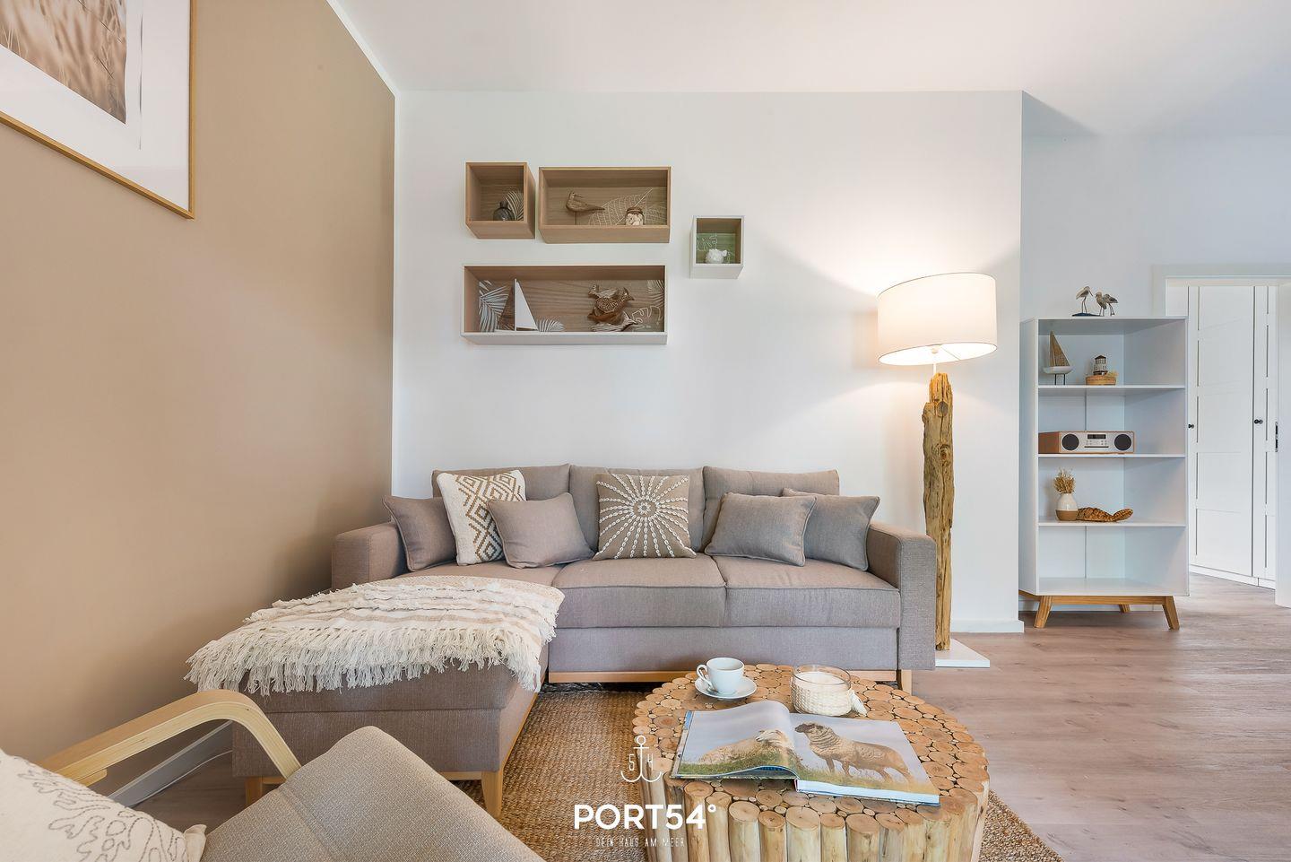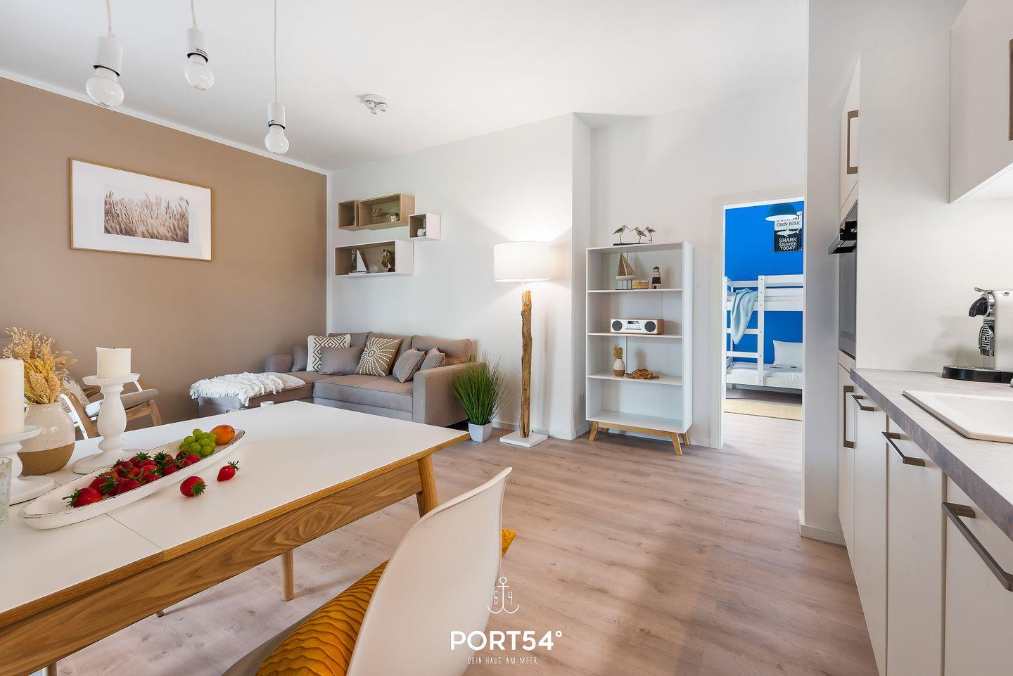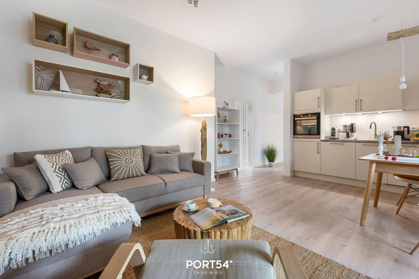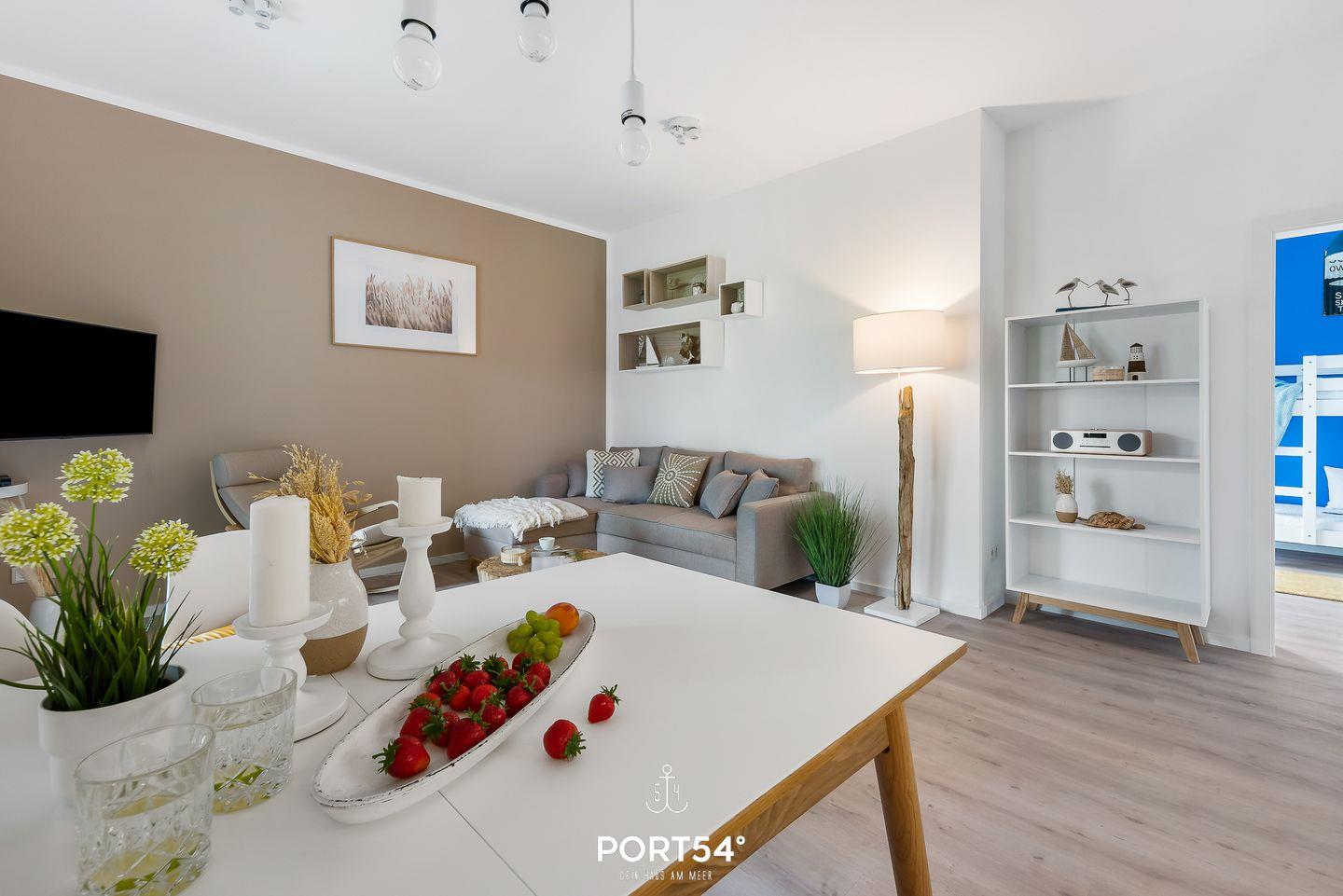 In dem geräumigen Wohnzimmer mit offener Küche können Sie es sich gemütlich machen. Die Küche ist modern und voll ausgestattet, sodass Sie hier wunderbar kochen können. Die beiden Schlafzimmer sind hochwertig eingerichtet und verfügen über ein Doppelbett und ein Etagenbett (90x200cm). Für weitere 2 Personen steht im Wohnzimmer ein gemütliches Schlafsofa zur Verfügung. Das helle Badezimmer hat eine ebenerdige Dusche. Zusätzlich gibt es noch ein Gäste-WC. Die gesamte Wohnung verfügt über eine Fußbodenheizung. Auf der angrenzenden Sonnenterrasse mit Gemeinschaftsgarten können Sie herrliche Stunden an der frischen Nordseeluft verbringen. Für gesellige Grillabende steht ein Elektrogrill zur Verfügung.