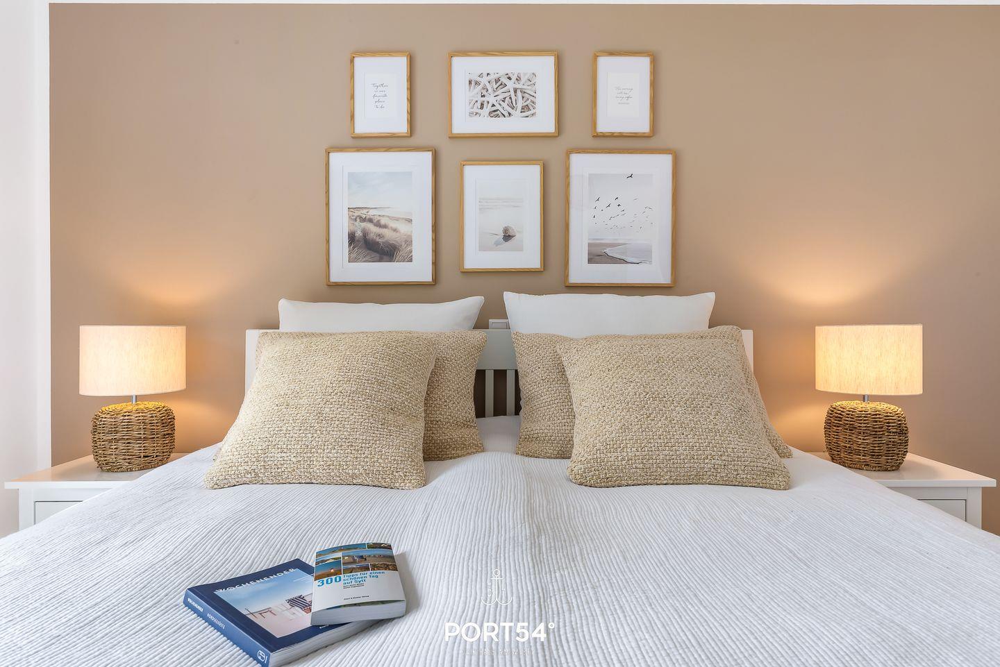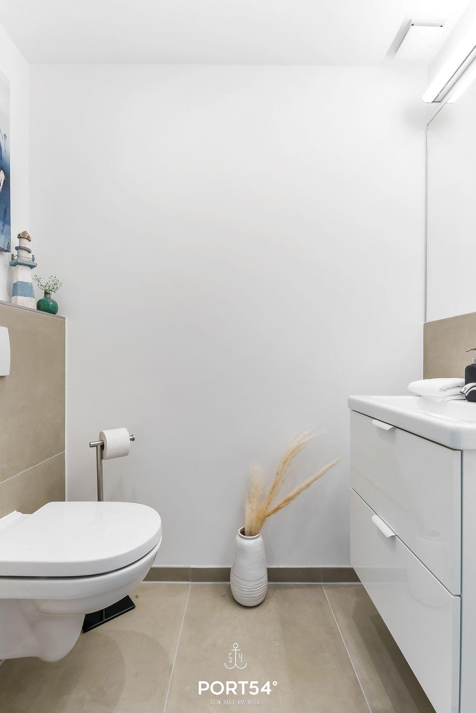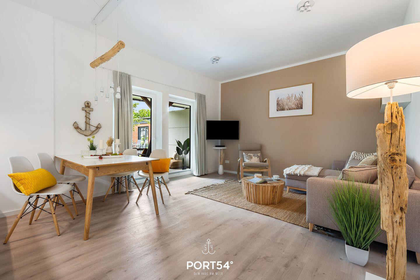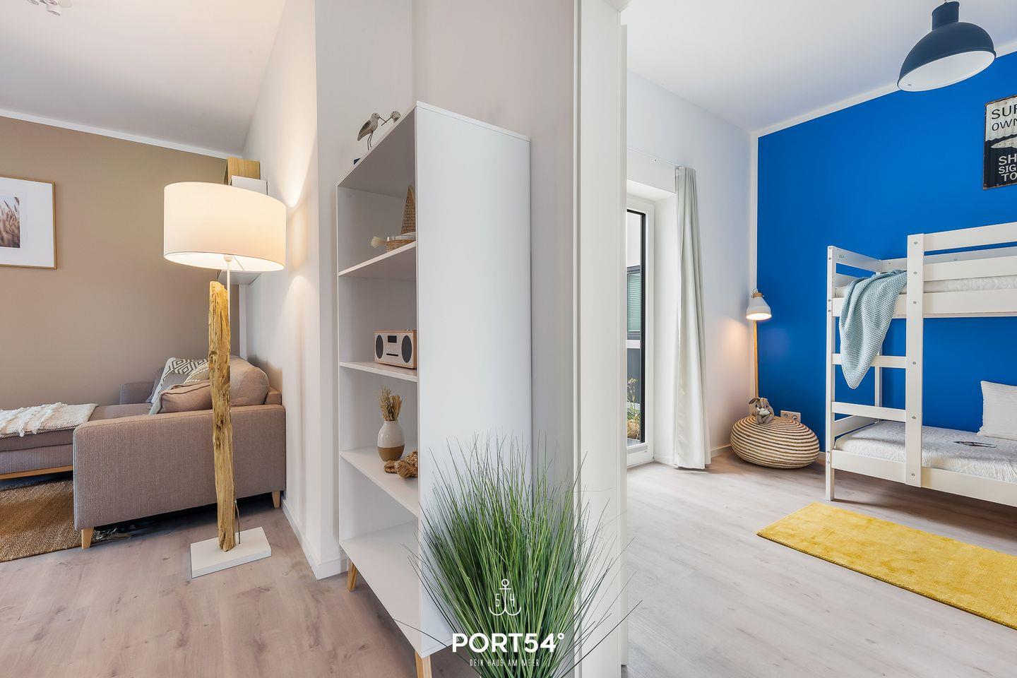 In dem geräumigen Wohnzimmer mit offener Küche können Sie es sich gemütlich machen. Die Küche ist modern und voll ausgestattet, sodass Sie hier wunderbar kochen können. Die beiden Schlafzimmer sind hochwertig eingerichtet und verfügen über ein Doppelbett und ein Etagenbett (90x200cm). Für weitere 2 Personen steht im Wohnzimmer ein gemütliches Schlafsofa zur Verfügung. Das helle Badezimmer hat eine ebenerdige Dusche. Zusätzlich gibt es noch ein Gäste-WC. Die gesamte Wohnung verfügt über eine Fußbodenheizung. Auf der angrenzenden Sonnenterrasse mit Gemeinschaftsgarten können Sie herrliche Stunden an der frischen Nordseeluft verbringen. Für gesellige Grillabende steht ein Elektrogrill zur Verfügung.