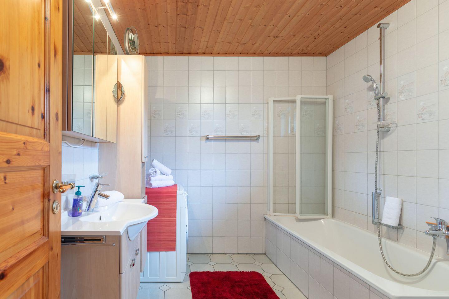 Das helle Badezimmer bietet Ihnen eine Badewanne mit Duschvorrichtung und eine Waschmaschine.