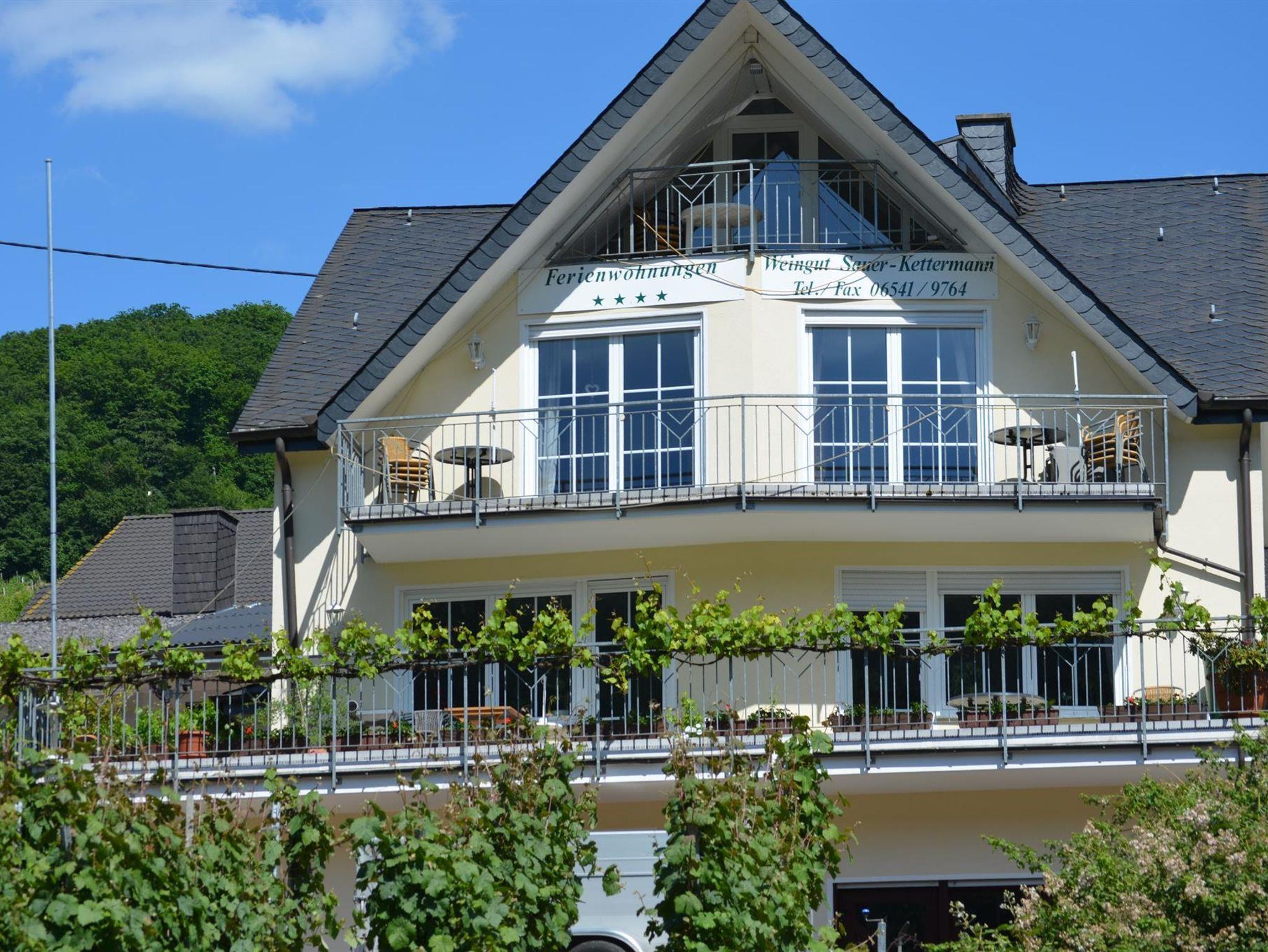 Neubau in sonniger Lage im Rebengrün. 3 komfortable 4-Sterne-Fewo's mit Balkon, Moselblick, gr. Terrasse, gr. Spielplatz, Grillmöglichkeit u. Liegewiese im geräumigen Innengelände. Kellerbesichtigung, Wein- u. Sektprobe.