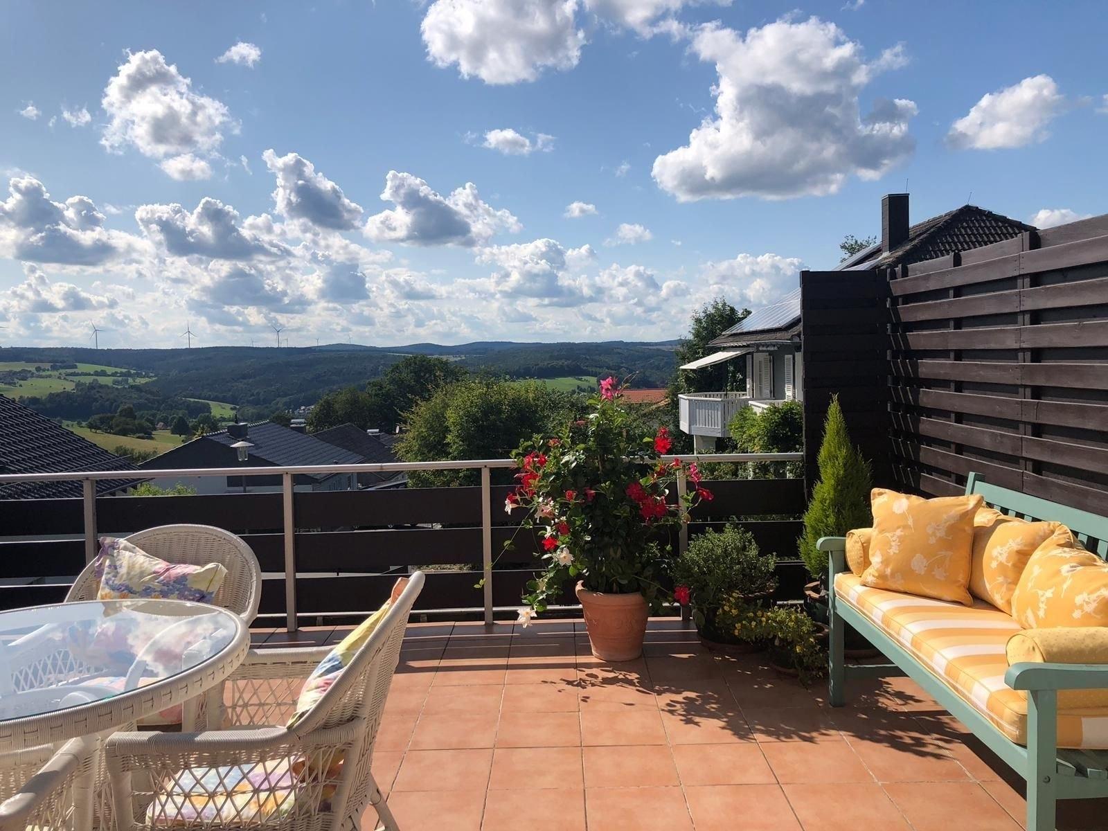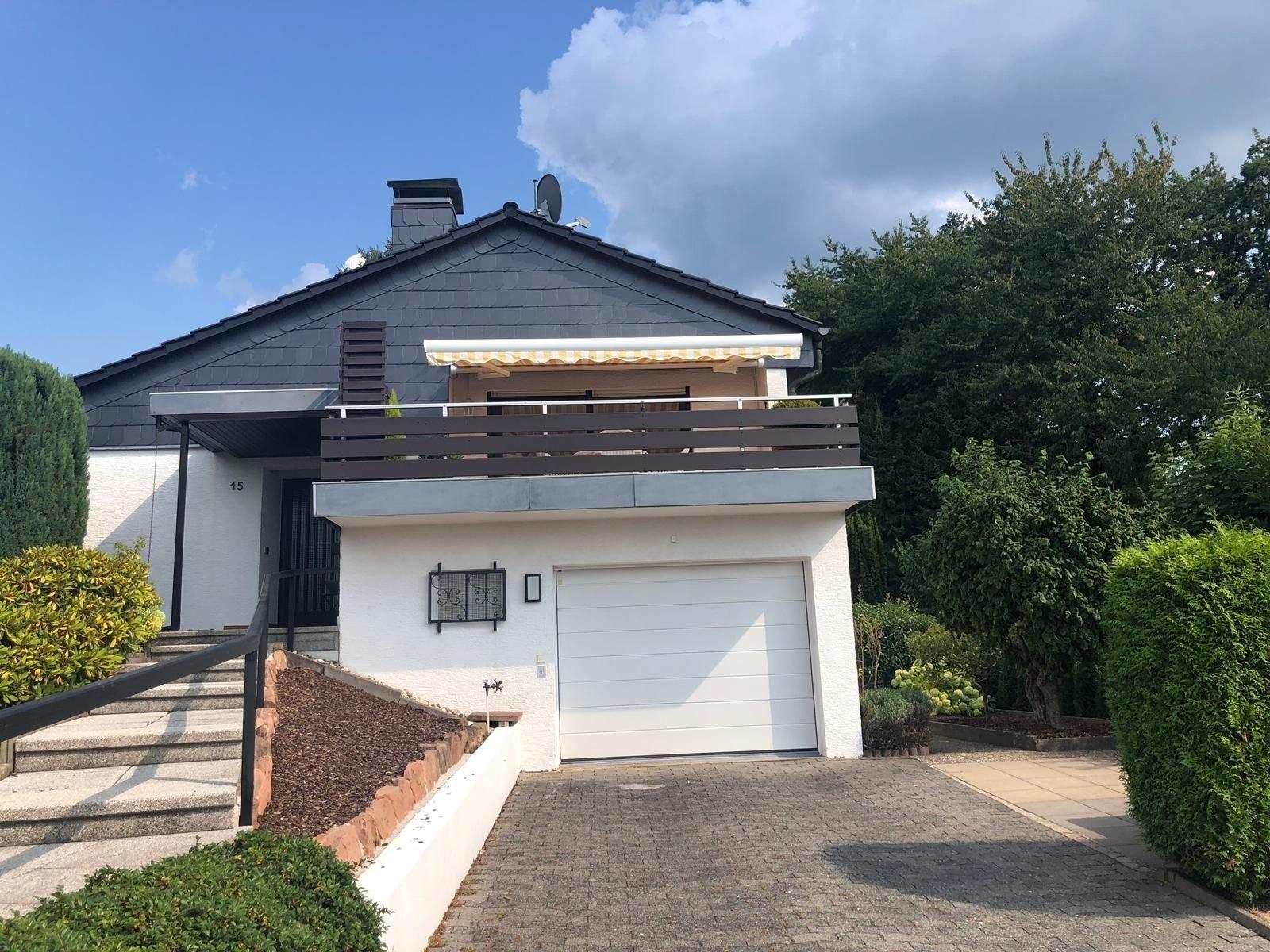 5 Sterne Ferienhaus mit 125 m² für bis zu 6 Personen. 3 Schlafzimmer, 2 große Badezimmer, großzügige Terrasse mit Panorama-Fernblick, überdachter Freisitz mit Gasgrill. Garage und 3 PKW Stellplätze im Hof. Herrlich ruhig am Waldrand gelegen.