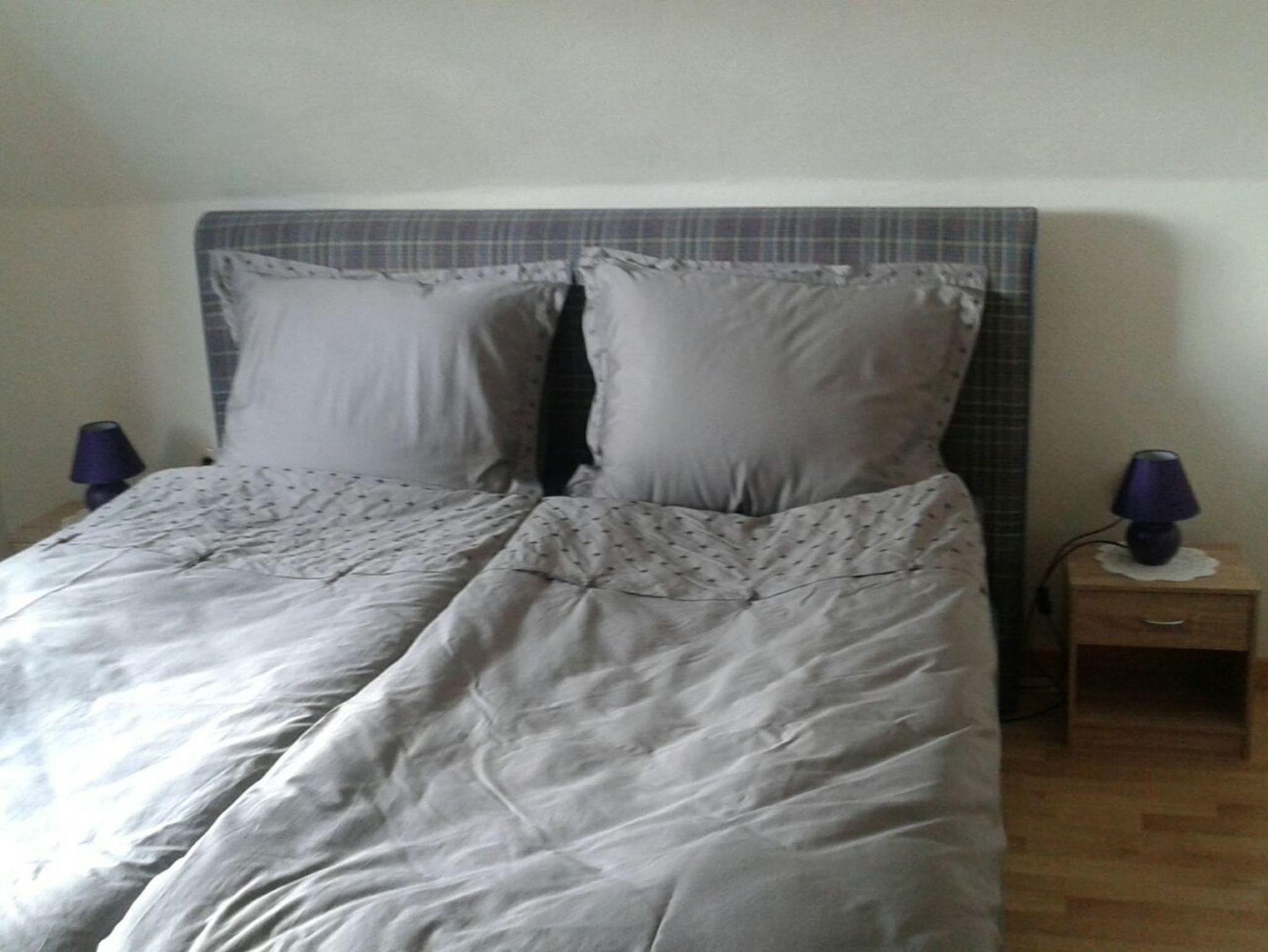 Im Obergeschoss befinden sich zwei getrennte Schlafzimmer. In einem Schlafzimmer befindet sich ein Boxspring Doppelbett und bei Bedarf ein Reisebett für Babys/ Kleinkinder und in dem anderen Schlafzimmer zwei Einzelbetten.