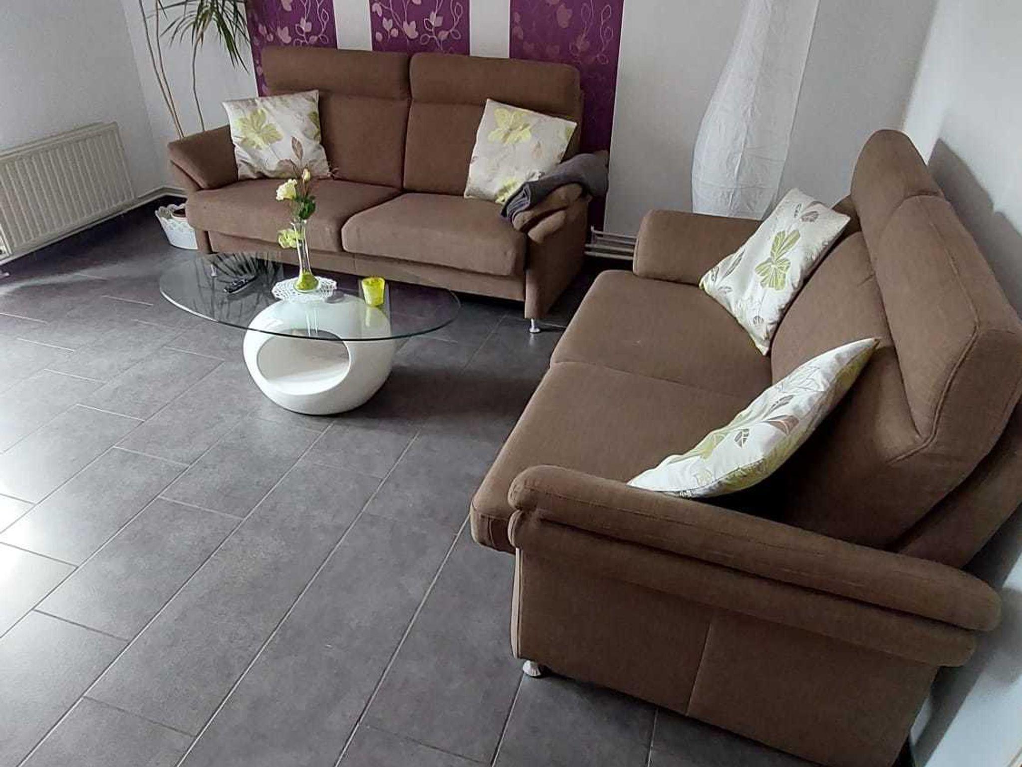 Im Untergeschoss befindet sich ein großes Wohnzimmer mit Flachbild TV und zwei Sofas. Im Wohnzimmer befindet sich auch der Esstisch. Eine Tür führt vom Wohnzimmer direkt zur Terrasse. Die Terrasse ist mit Stühlen, Tisch, Gartenliege und einem Grill voll ausgestattet.