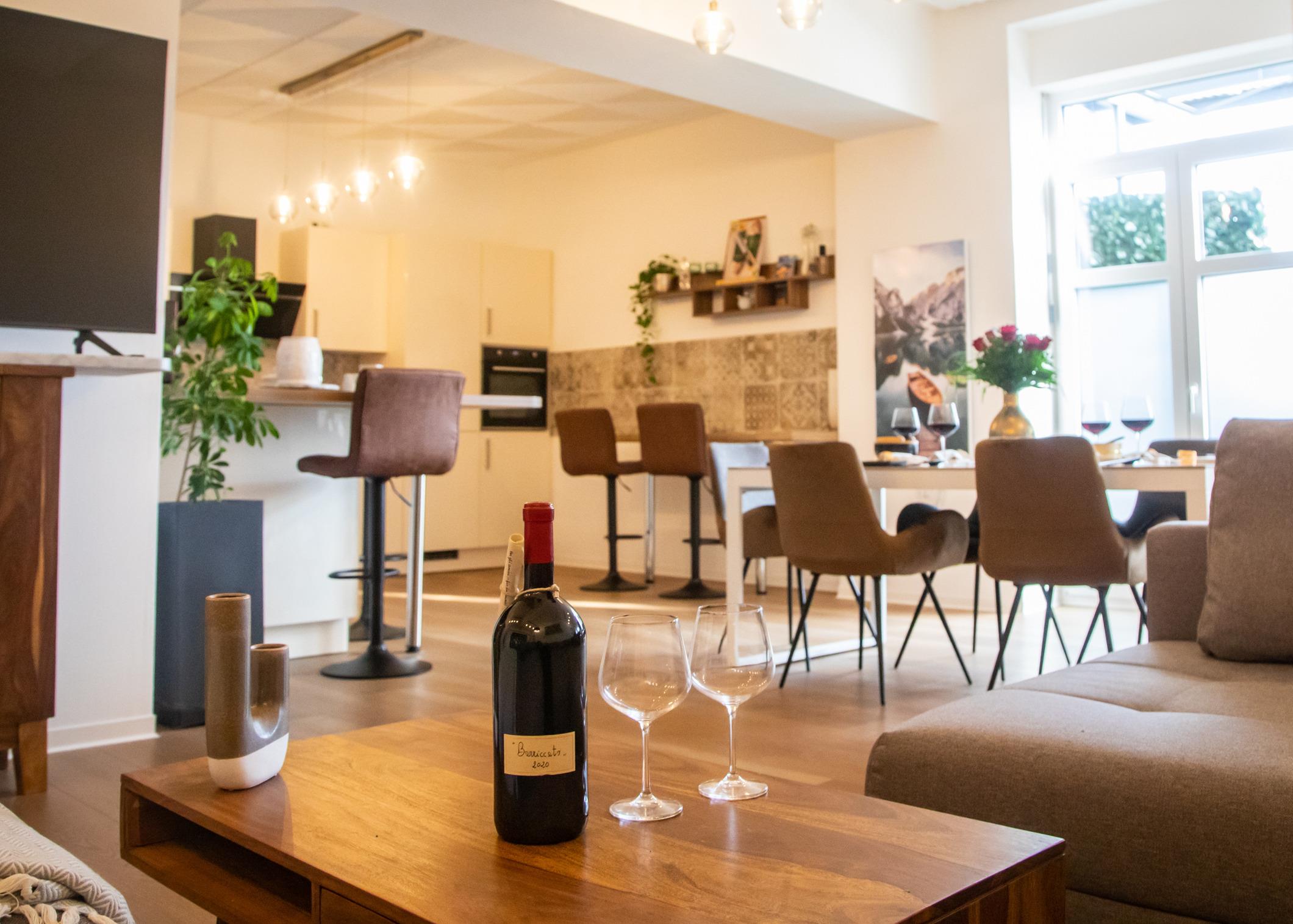 Erftstadt liegt im Dreieck zu den Großstädten Köln, Bonn und Aachen und bietet mit eigenem Bahnhof, der A1 und A61 sowie dem Streckennetz der Buslinien eine sehr gute Anbindung. Ein Auto ist empfehlenswert. Der Bahnhof ist ca. 6 km entfernt. Die Wohnung liegt sehr zentral im Herzen von Lechenich, nur wenige Fußmeter zum Supermarkt und historischen Ortskern mit Markt, zahlreichen Geschäften, Restaurants, Ärzten & Apotheken, Banken, Bushaltestelle und vieles mehr. Egal ob ein Besuch im Phantasialand, die Messe oder ein Besuch im Kölner Dom, dem Wahrzeichen & Kulturerbe, sie alle sind ein Besuch wert! Das moderne Loft ist die perfekte Adresse für Premium Wohnen & Liebhaber von Land- und Stadtleben. Ideal auch als repräsentative Managerwohnung! Optimal ausgelegt für 4 Personen können Person 5 und 6, Platz auf der bequemen Couch oder einem Beistellbett finden.