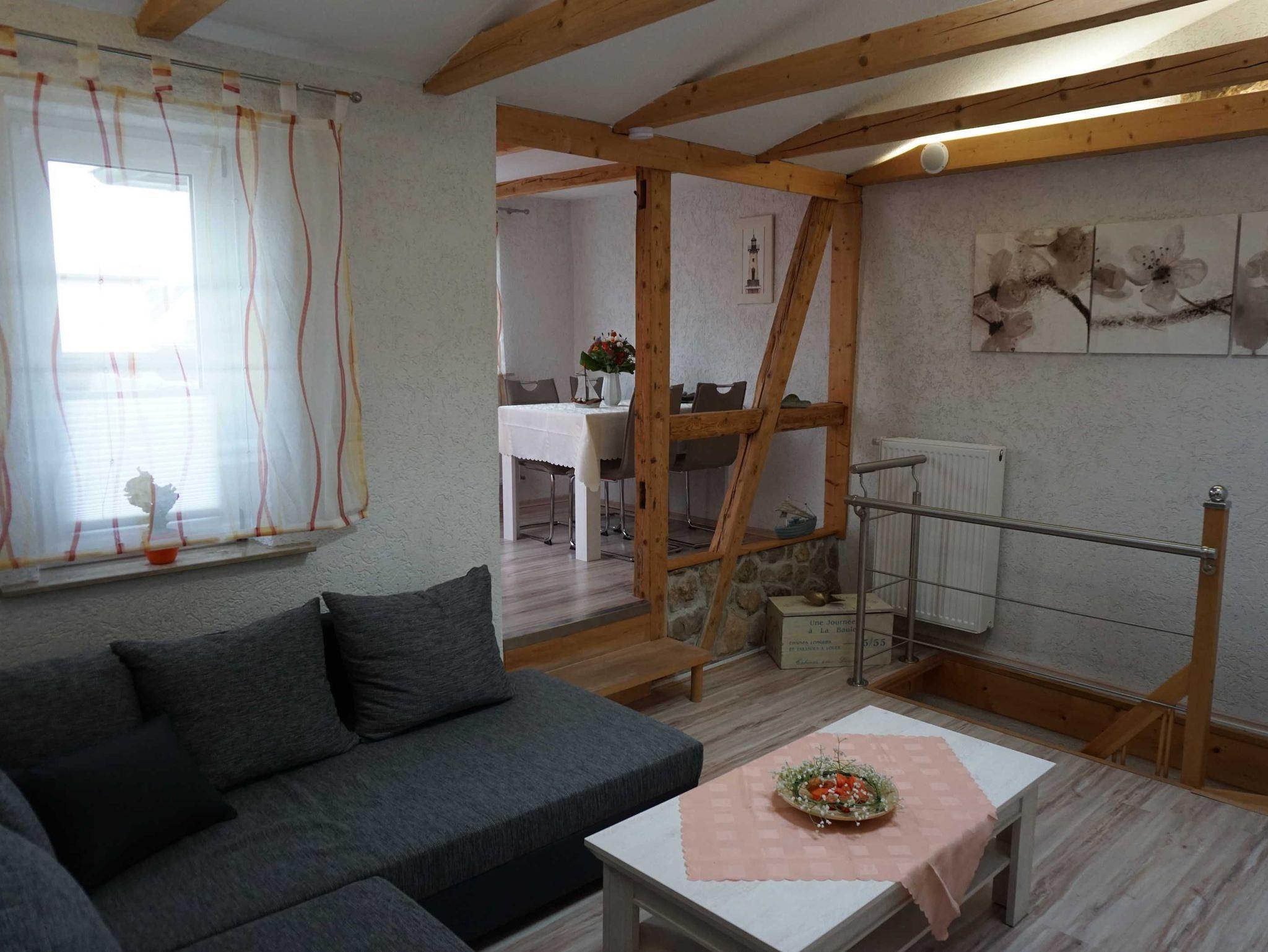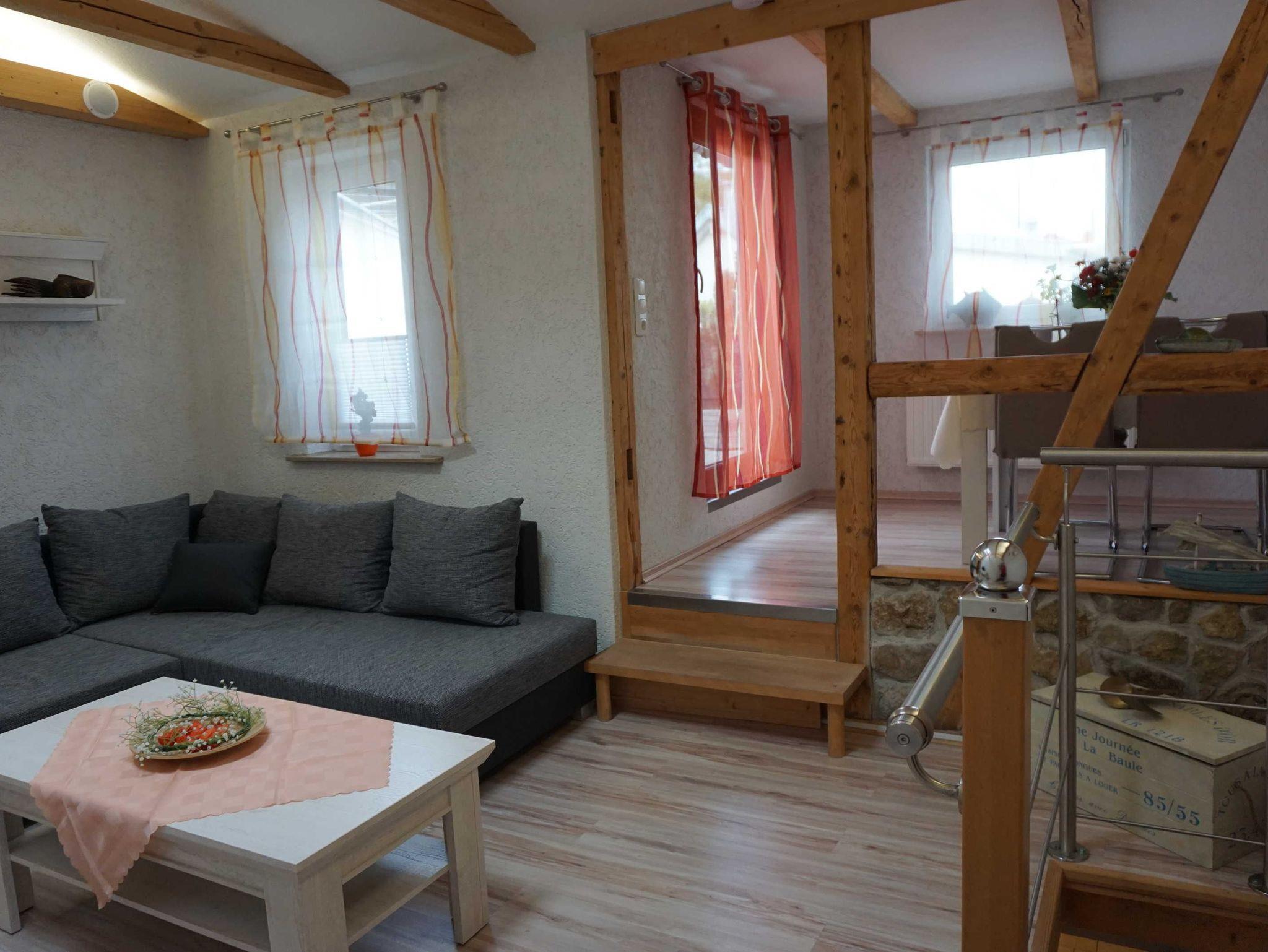 Die Ferienwohnung ist großzügig auf 2 Etagen verteilt. Sie verfügt im EG über ein Schlafzimmer, ein Badezimmer, eine Küche sowie einen Aufenthaltsraum mit Schlafcouch. Über eine steile Treppe gelagen Sie ins Obergeschoss. Dort befindet sich das Wohnzimmer mit Wintergarten , Zugang zur Terrasse sowie ein weiteres Schlafzimmer und ein Badezimmer.