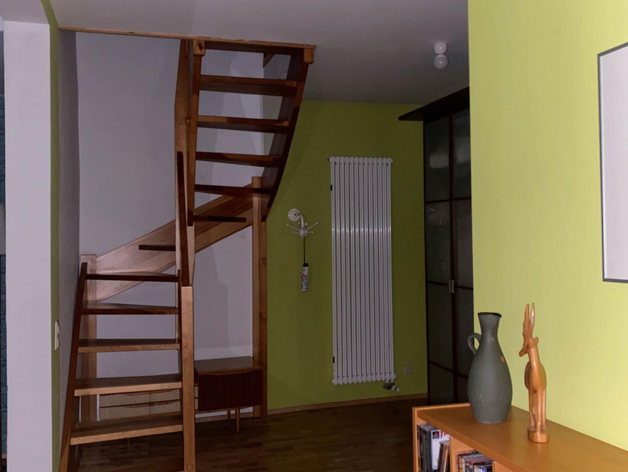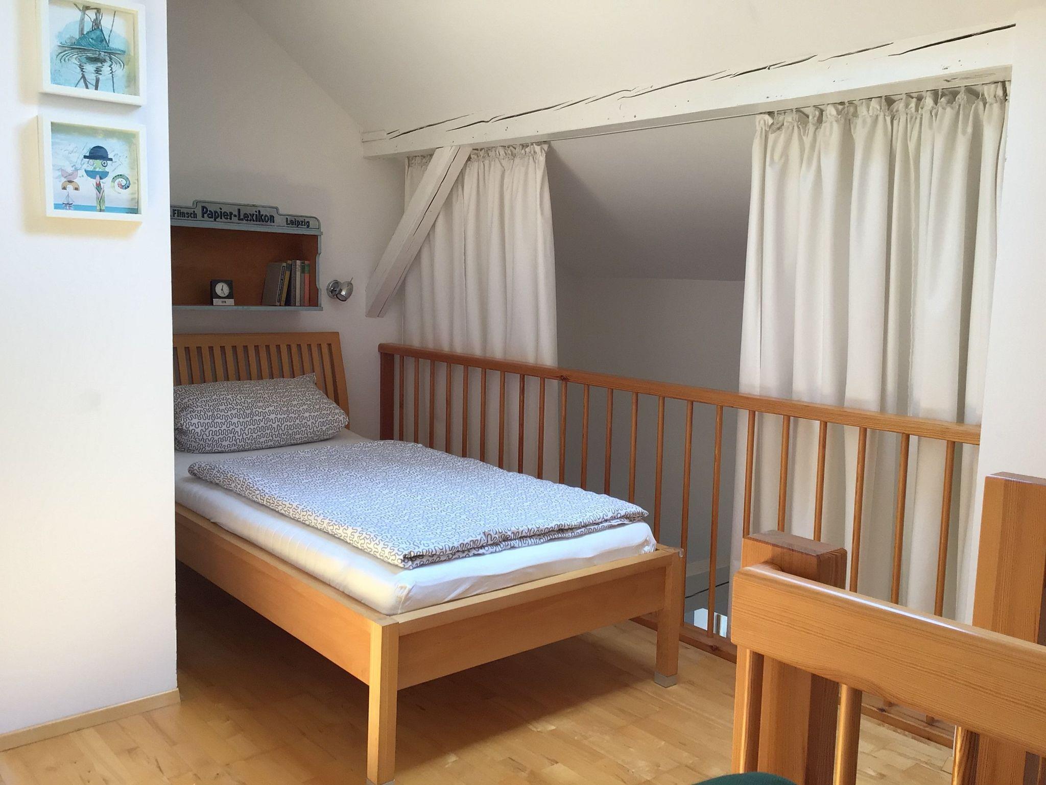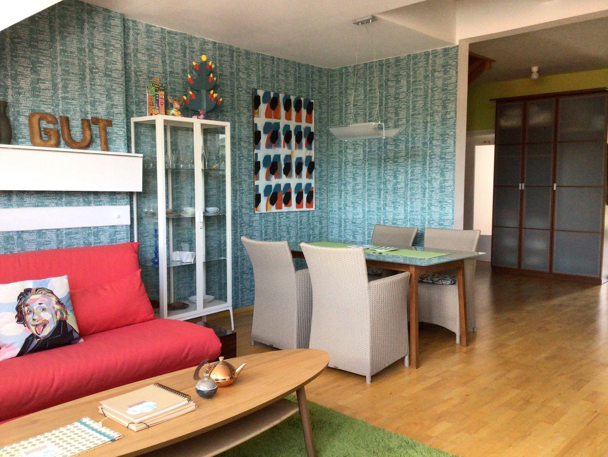 Unser Haus wurde 2009 liebevoll saniert und hat im Obergeschoss für 4 Personen eine im Designerstil geschmackvoll eingerichtete Nichtraucher-Maisonettewohnung mit Balkon. Die Wohnung ist 90m² groß, hat eine komfortabel eingerichtete Küche, ein geräumiges Badezimmer mit separater Dusche und ein großzügiges, sonniges Wohnzimmer mit einem bequemen Schlafsofa (1,60 m breit ). Vom Wohnzimmer kommt man in das 20m² große Schlafzimmer mit einem kleinen Doppelbett (1,40 m breit). Auf der Galerieetage befindet sich ein Einzelbett und ein kleiner Schreibtisch.