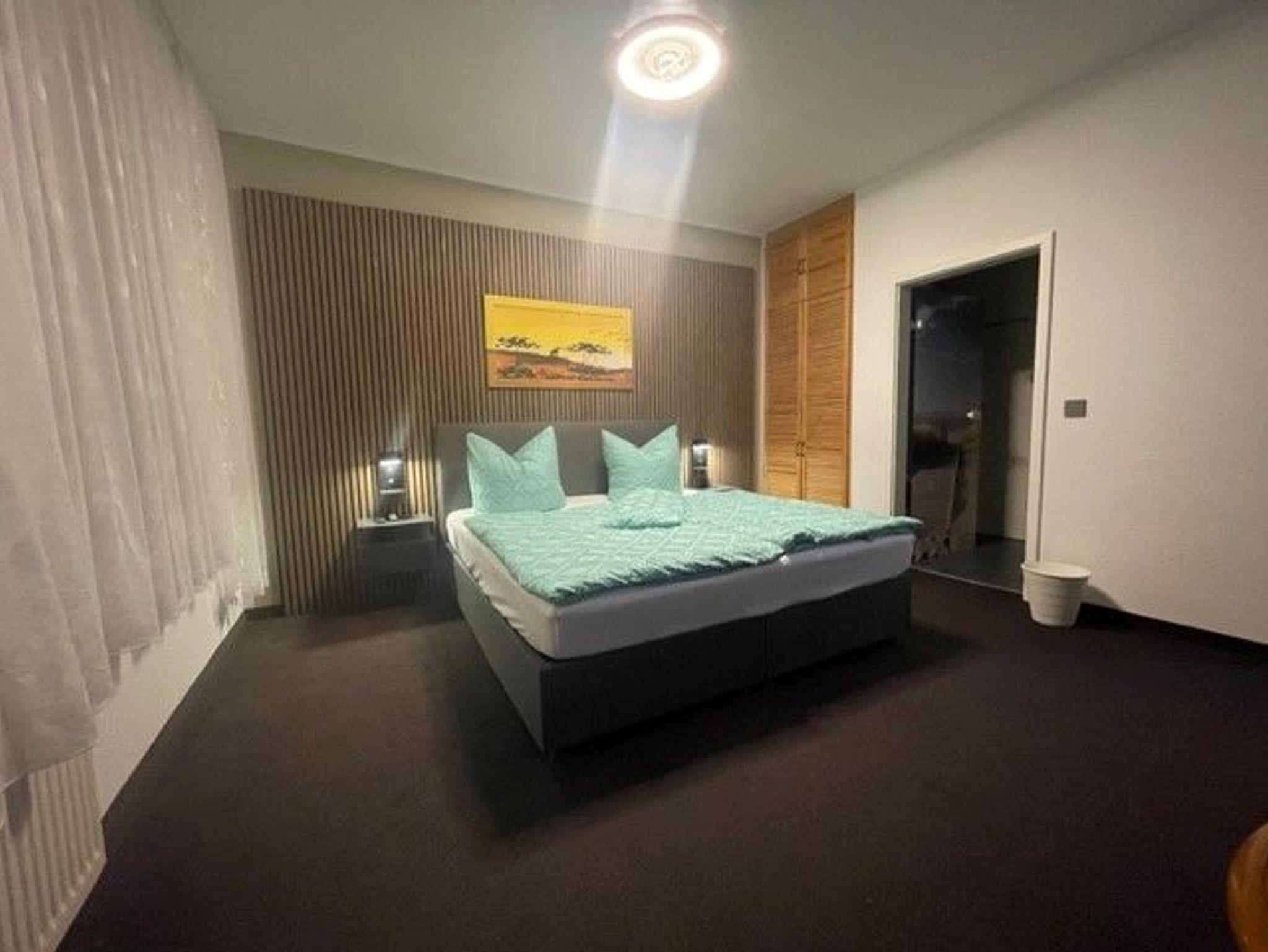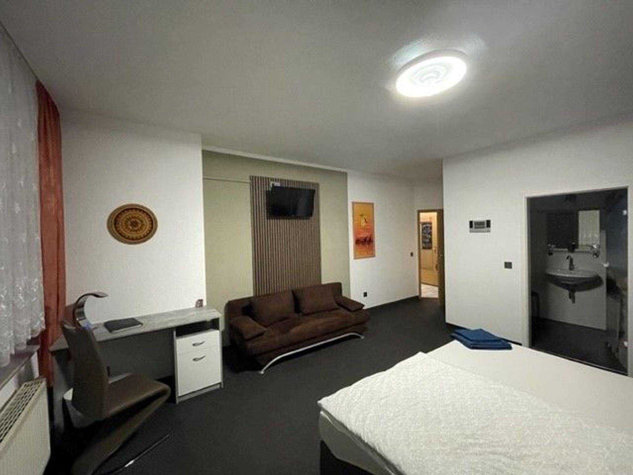Modern ausgestattetes Doppelzimmer (25m²) im Erdgeschoss des Mehrfamilienhauses- es verfügt über ein Boxspringbett, Sat-TV, Flachbildschirm, kleine Sitzecke mit Tisch und 2 Sesseln, Kleiderschrank, Teppichfußboden, Rolläden und ein Badezimmer mit Dusche/WC und Föhn. Eine Aufbettung im Zimmer für eine 3. Person ist möglich, ein Kinderreisebett kann bei Bedarf gestellt werden. Die Küche, in der auch das Frühstück serviert wird, kann gern genutzt werden.