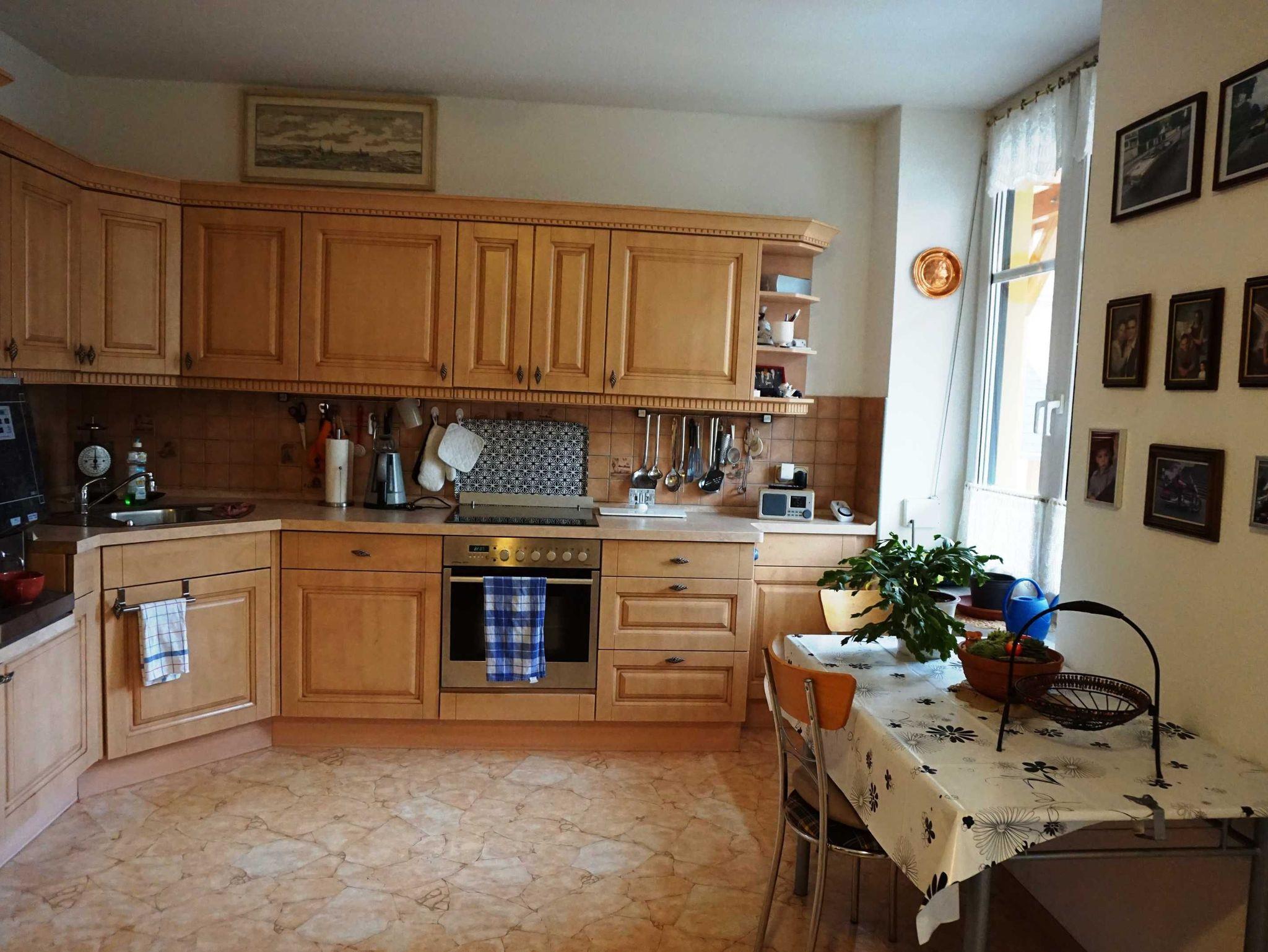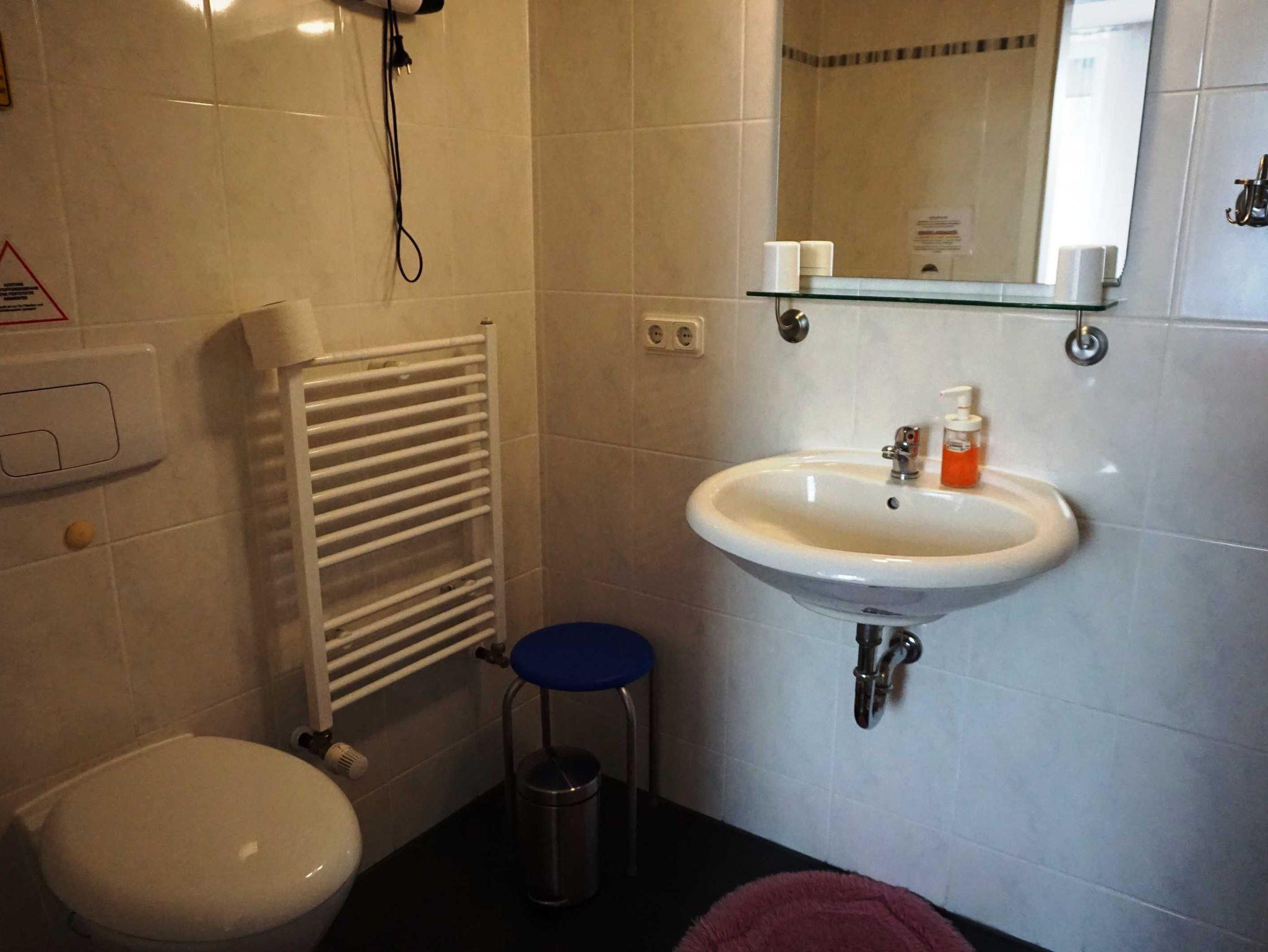 Modern ausgestattetes Doppelzimmer (25m²) im Erdgeschoss des Mehrfamilienhauses- es verfügt über ein Boxspringbett, Sat-TV, Flachbildschirm, kleine Sitzecke mit mit Tisch und 2 Sesseln, Kleiderschrank, Teppichfußboden, Rolläden und ein Badezimmer mit Dusche/WC und Föhn. Eine Aufbettung im Zimmer für eine 3. Person ist möglich, ein Kinderreisebett kann bei Bedarf gestellt werden. Die Küche, in der auch das Frühstück serviert wird, kann gern gegen eine Zusatzgebühr genutzt werden.