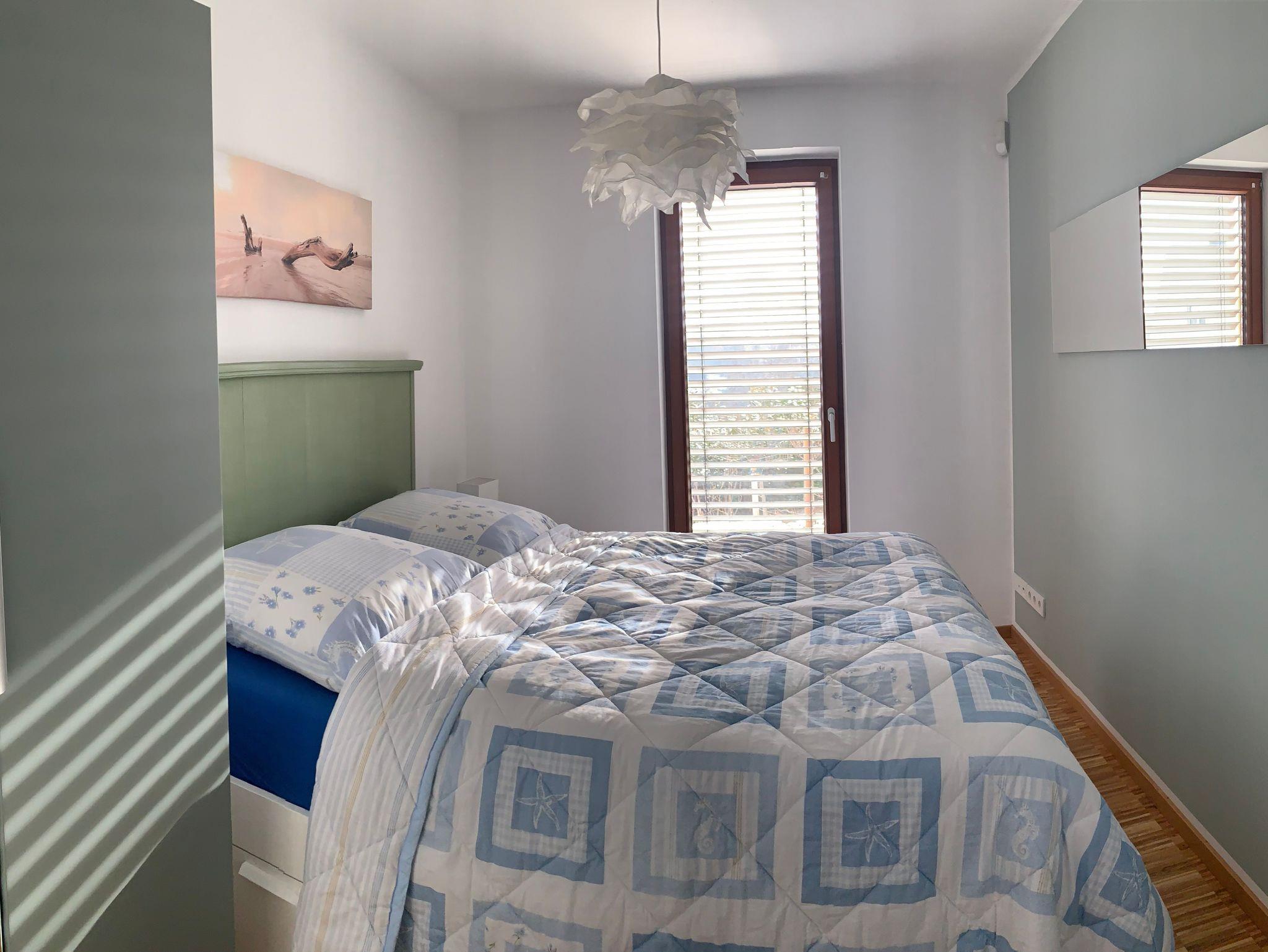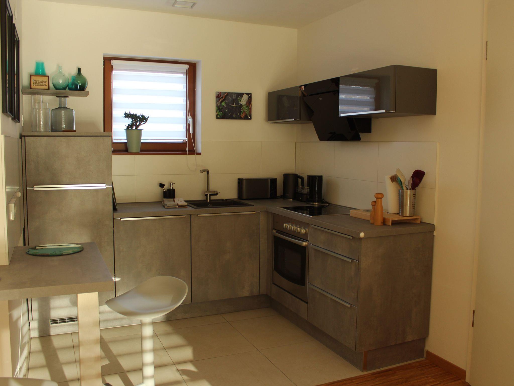 Die Ferienwohnung verfügt über ein Schlafzimmer, ein Badezimmer und einen Wohnbereich mit komplett ausgestatteter Küche. Vom Wohnereich aus, kann man eine sehr schöne Terrasse mit Blick auf den egapark nutzen.
