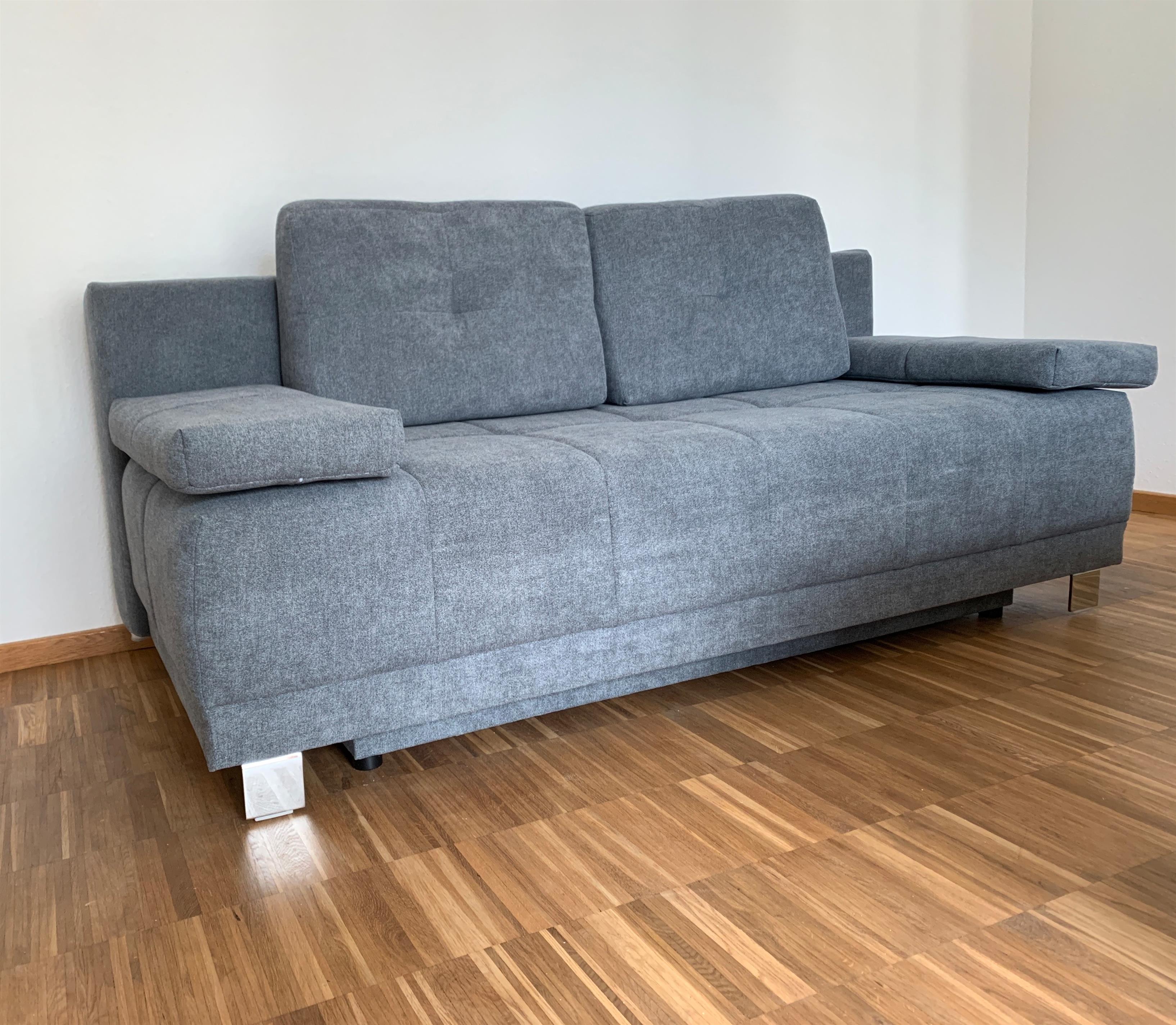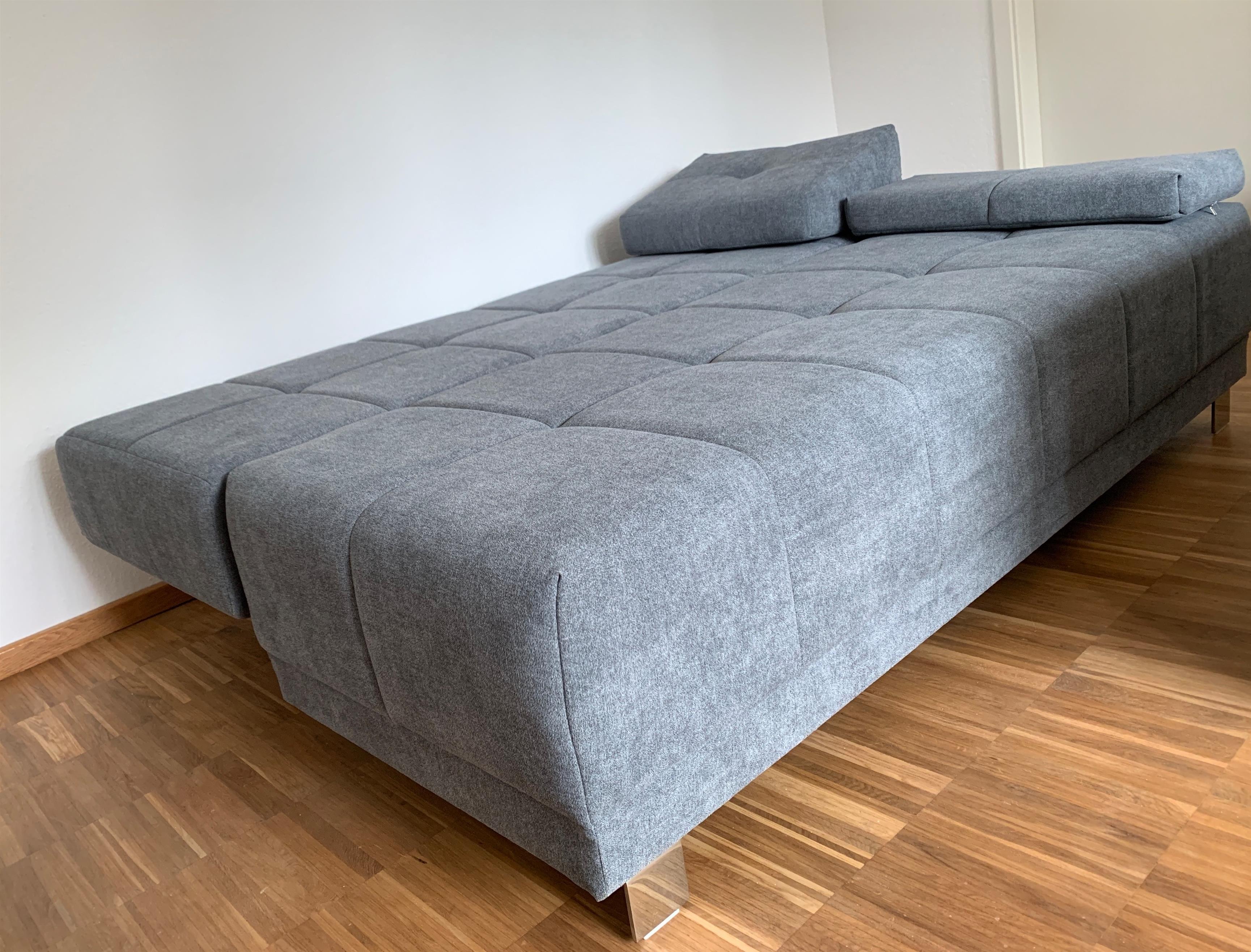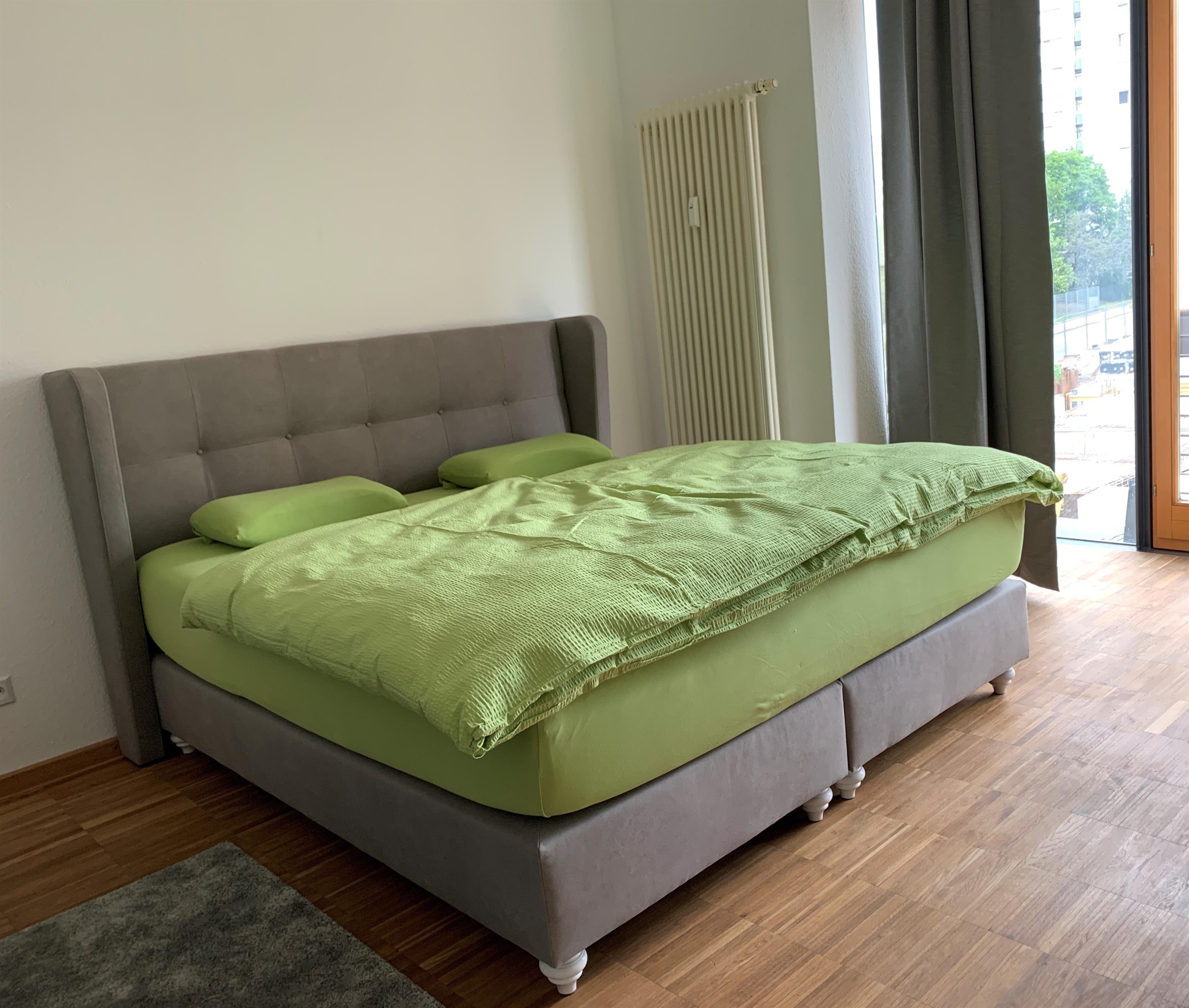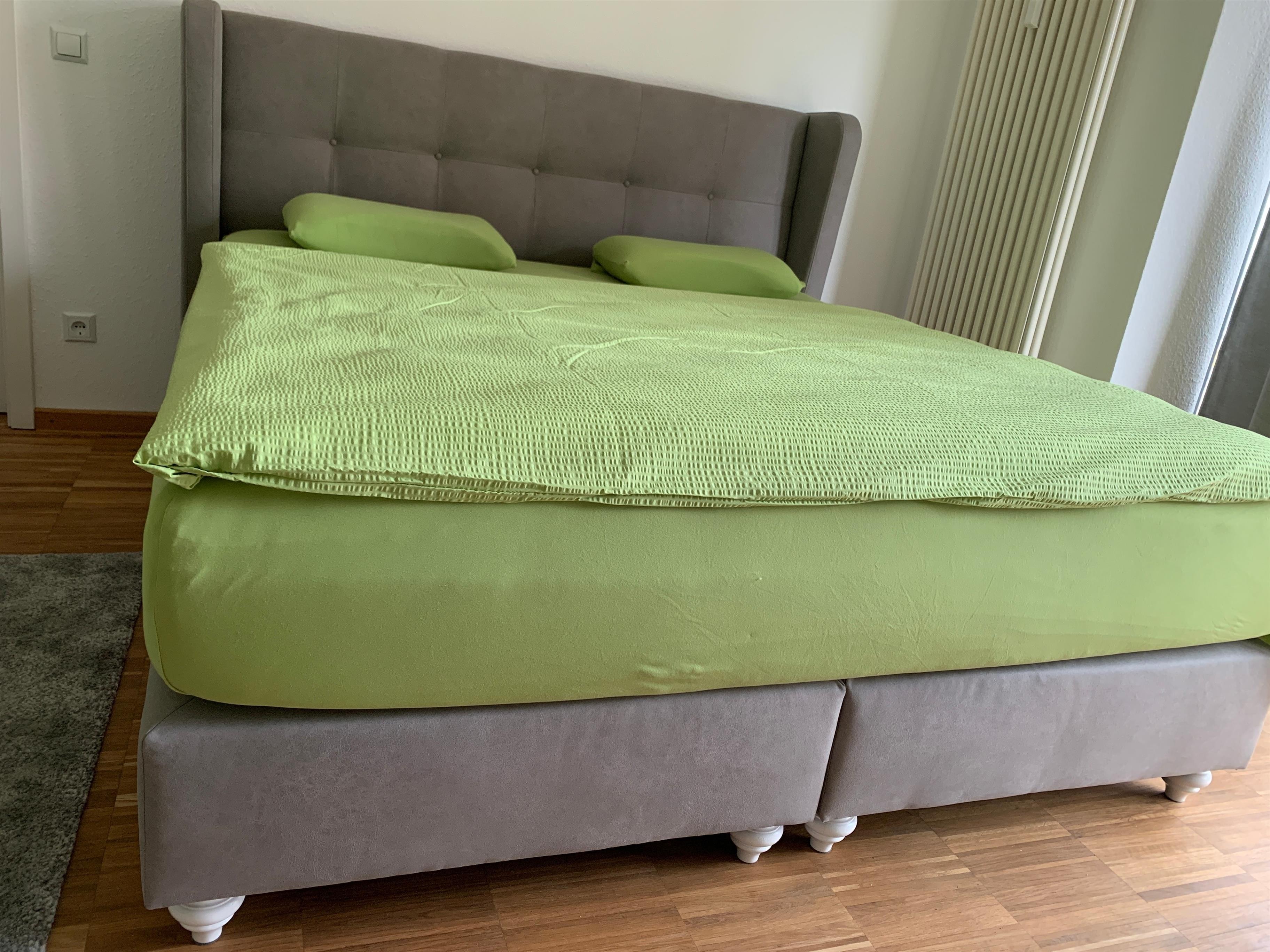 Wohn- und Schlafzimmer für 3 Personen: Das Doppelbett ist ein Boxspringbett von 180 x 200 cm mit komfortablem Einstieg, einer hochwertigen Taschenfederkernmatratze und Viscoschaumtopper. Weiterhin steht eine hochwertige Schlafcouch mit ausreichender Länge bereit. Bettdecken in Übergröße (135x220 cm).