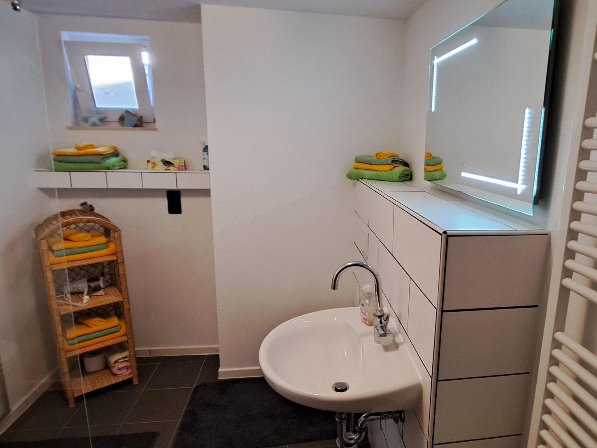Im Badezimmer befinden sich eine ebenerdige Dusche, ein Waschbecken und eine Toilette.