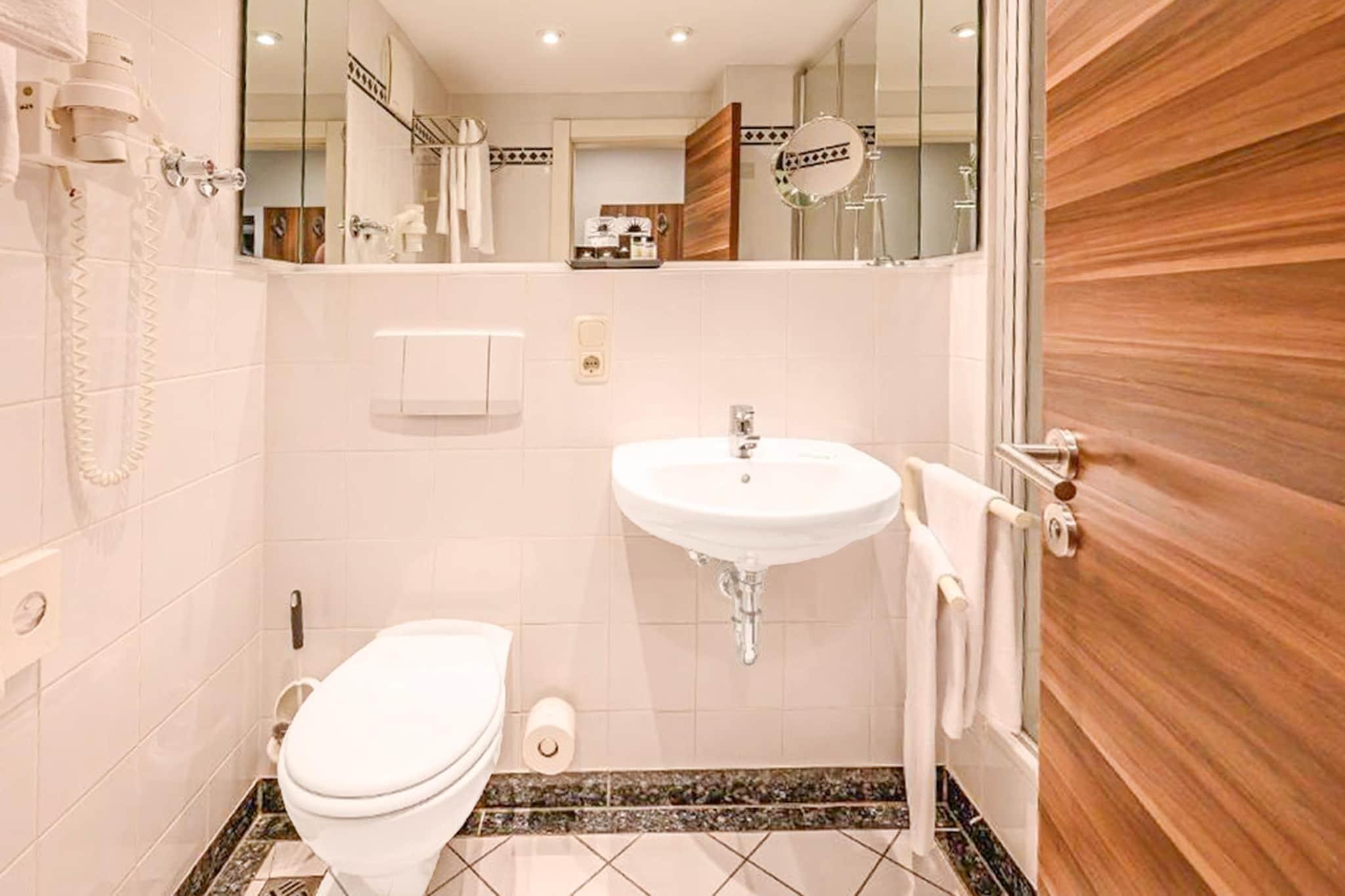 Ich hatte ein barrierefreies Zimmer reserviert, aber stattdessen ein Zimmer mit Balkon bekommen, Das war nicht weiter schlimm, nur etwas umständlich, Das Rührei beim Frühstück war ziemlich trocken, da könnte man noch nachbessern, Wer nach Ruhe sucht, dem kann ich dieses Hotel empfehlen, Die Betten waren sehr bequem und die Ausstattung modern, Das Frühstück war gut,