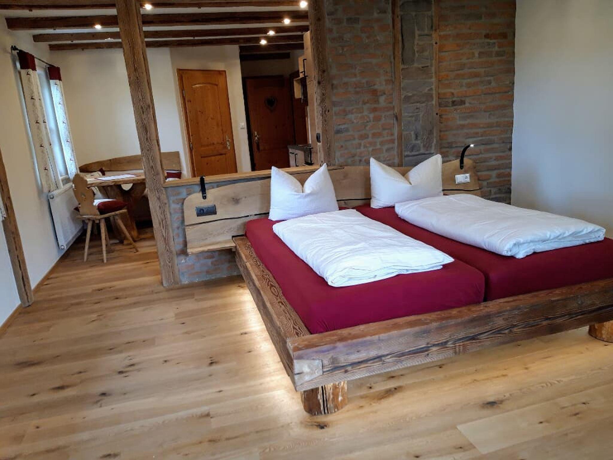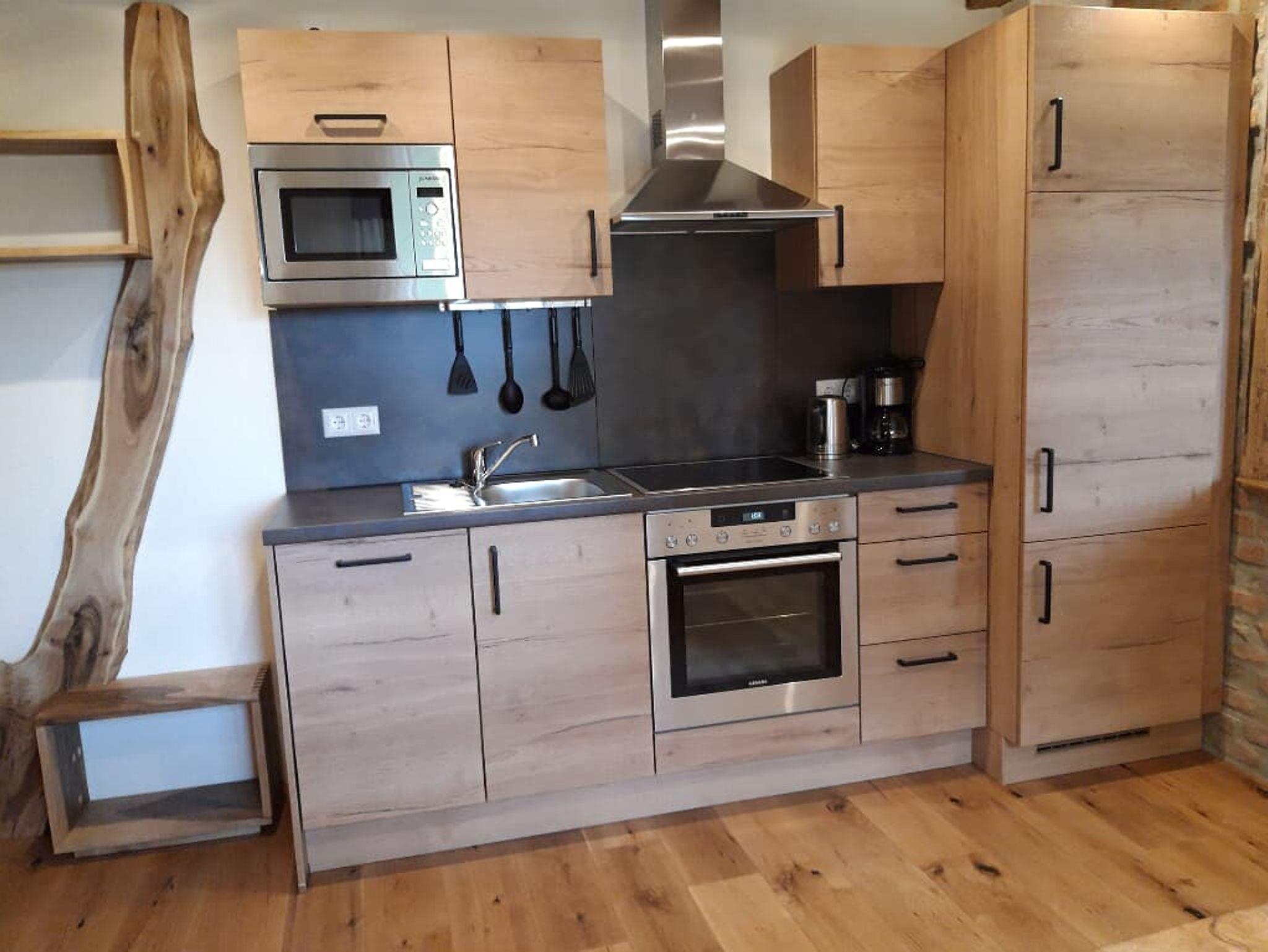Hochwertig und liebevoll ausgestattetes Appartment, hell und freundlich, mit Blick auf die Bayerwaldberge, direkten Zugang zum Balkon, komplett eingerichtete Küche, Sitzecke, Schlafsofa, uriges Doppelbett, großer Flachbild-TV Dusche / WC