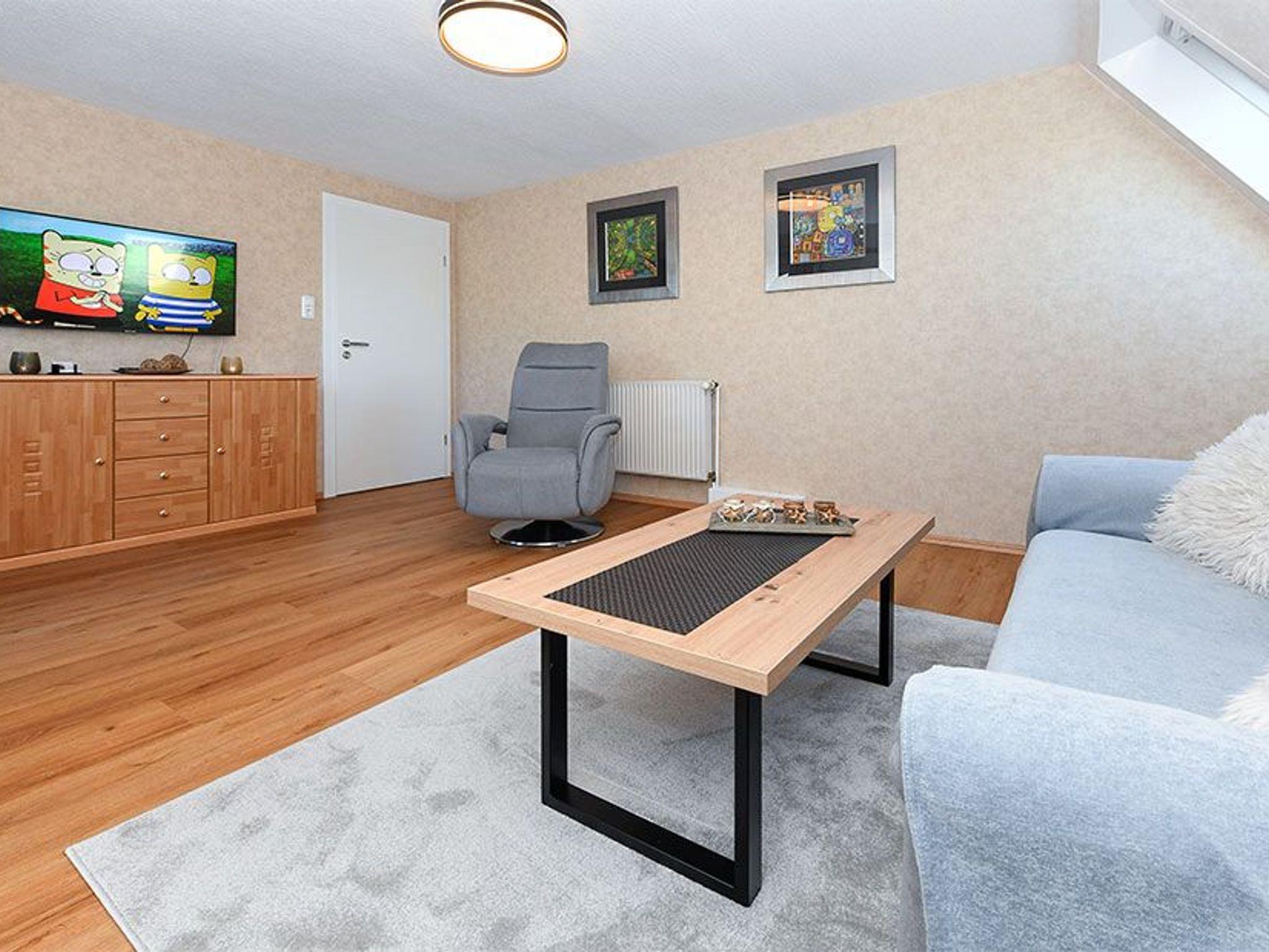Größe ca. 70 Quadratmeter, Wohnzimmer, Galerie, Küche, Schlafzimmer, zweites separates Schlafzimmer/Kinderzimmer, Badezimmer mit Dusche, Waschtisch und WC, separates zweites WC, Obergeschoss, Balkon, Koffer-/Abstellraum, optimal für 1 bis 3 Personen.