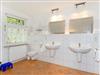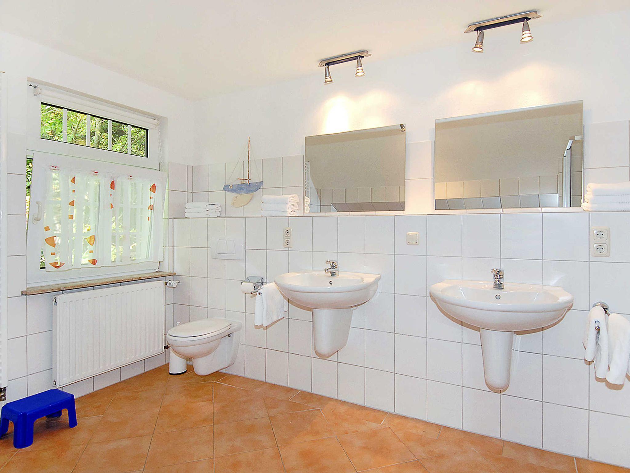 Badezimmer mit Doppel-Waschbecken, Dusche, Badewanne und WC