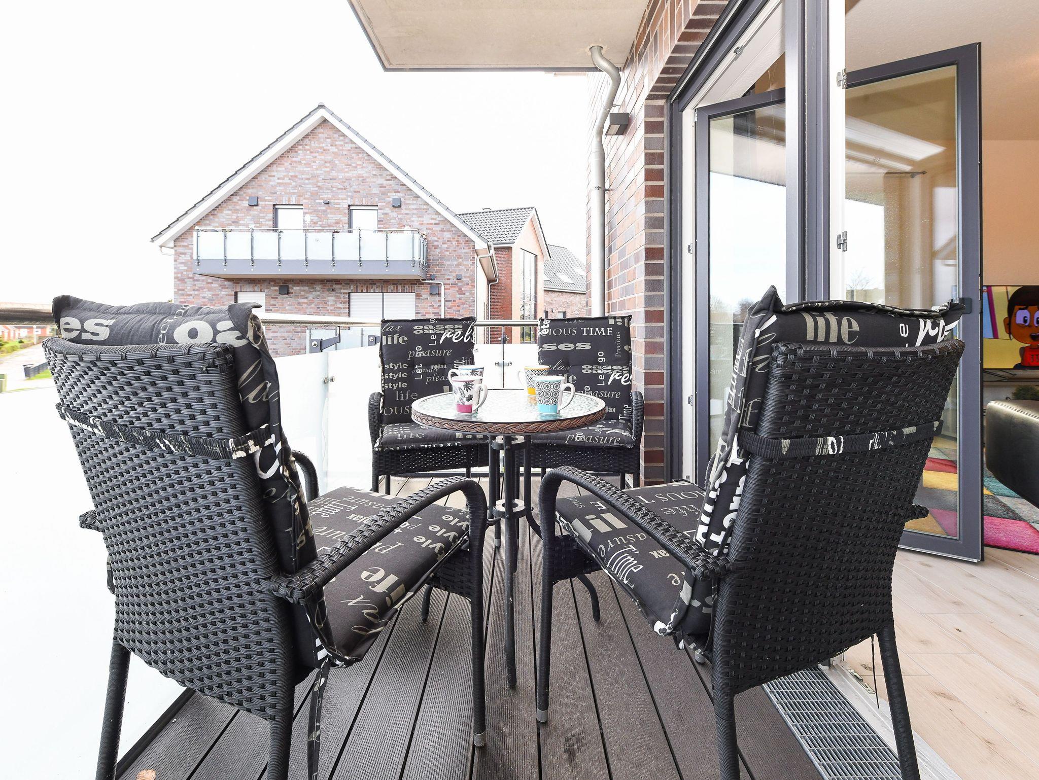 Vom schönen und liebevoll gestalteten Wohnzimmer erreichen Sie den angenehm großen Balkon und hier wie dort genießen Sie Ihre Tage in Ostfriesland bei einer schönen gemütlichen Tasse Tee!