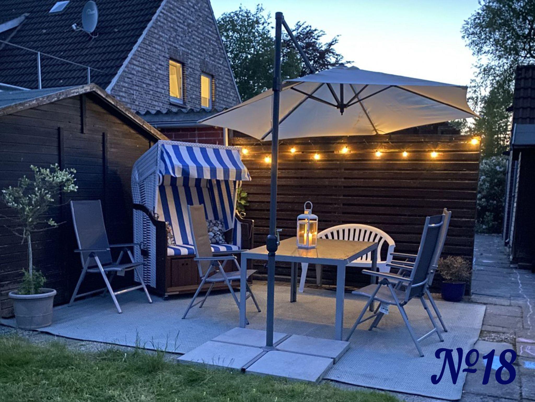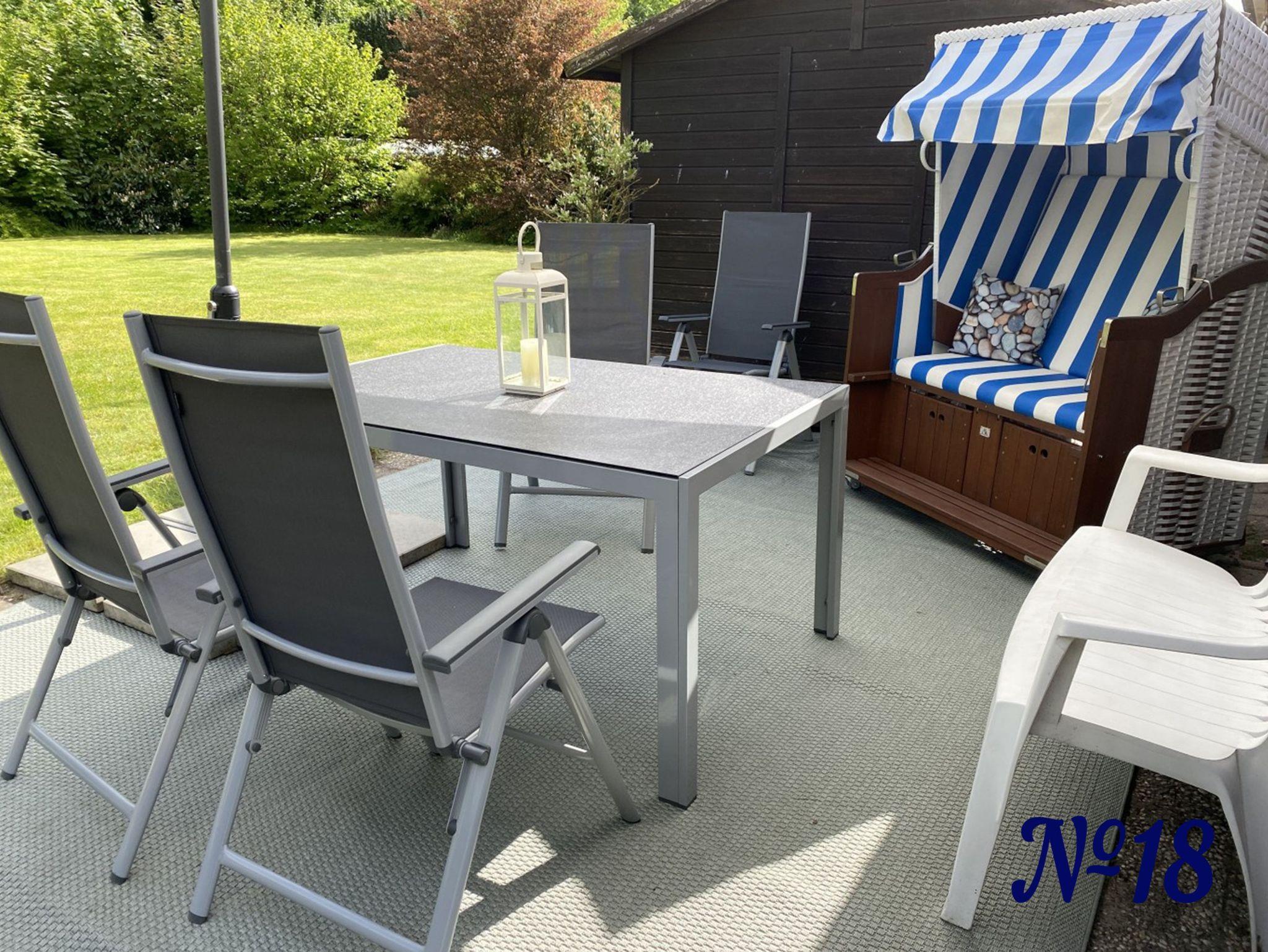 Auf der großen Wiese hinter dem Haus finden Sie eine Sitzecke mit Strandkorb, einem großen Sonnenschirm und Gartenmöbeln zum Relaxen. Für die Kleinen ist dort ein Sandkasen mit etwas Sandspielzeug.