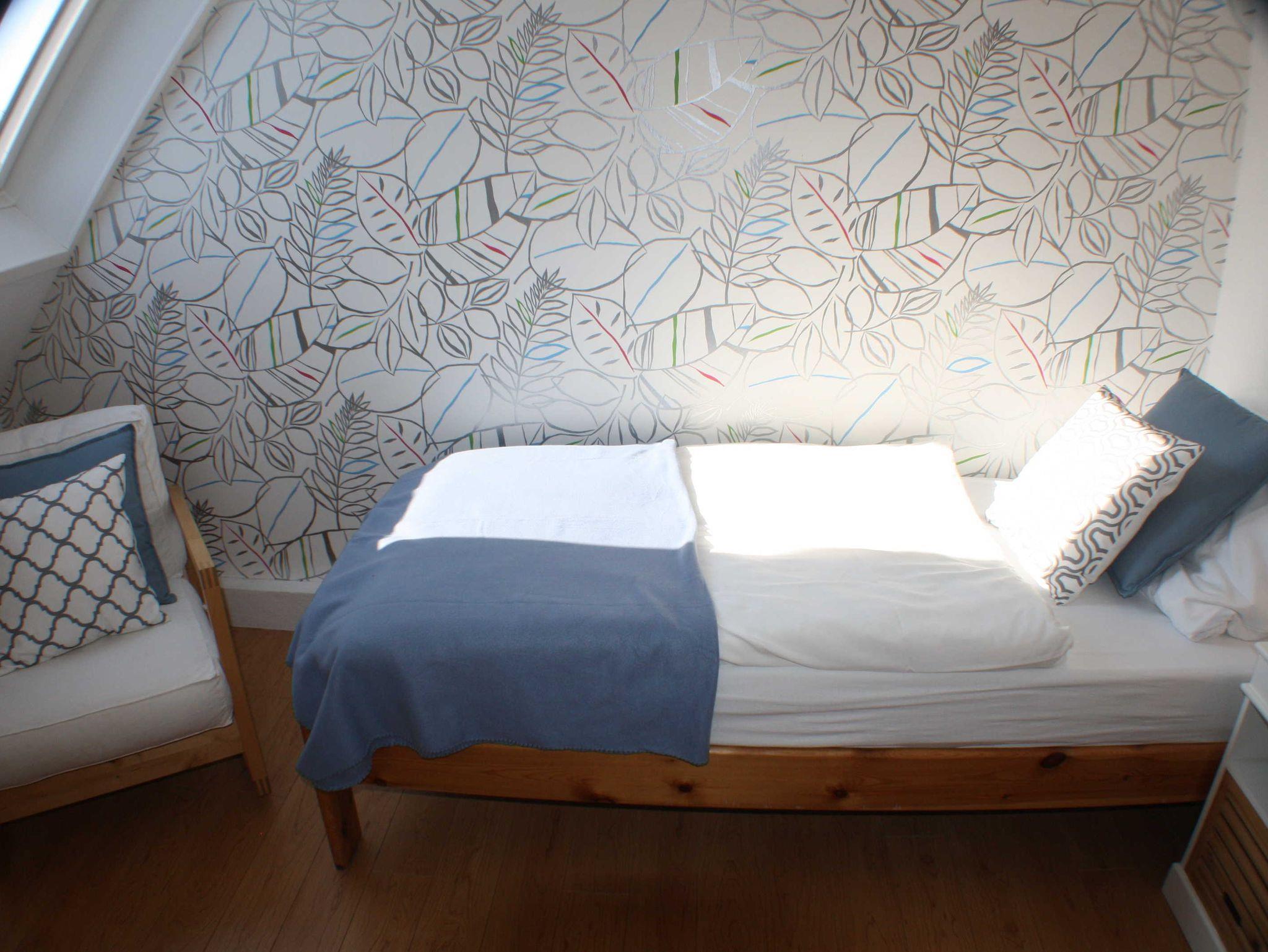Es gibt einen großen Wohn/Schlafraum, eine kleine Küche, ein Einzelzimmer und ein Tageslichtbad.