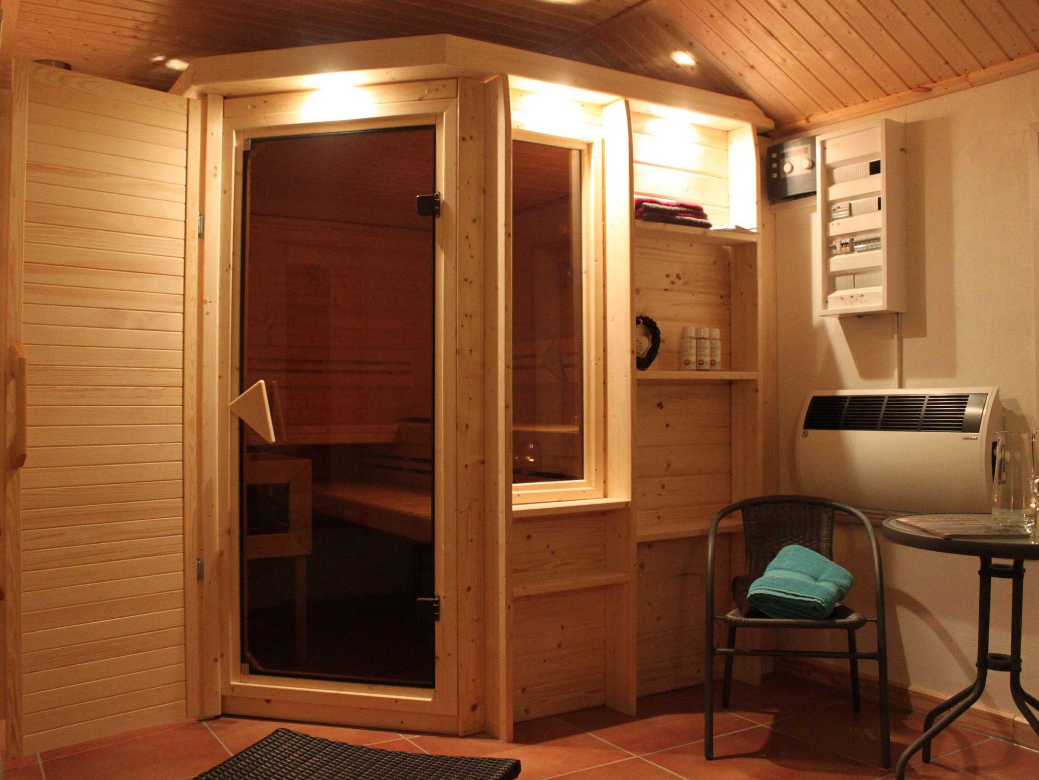 In einem separaten Gebäude befindet sich eine Sauna mit Dusche, WC und Außenterasse. Die Sauna bietet Platz für 4 Personen und wird mit 6 € pro Stunde berechnet.
