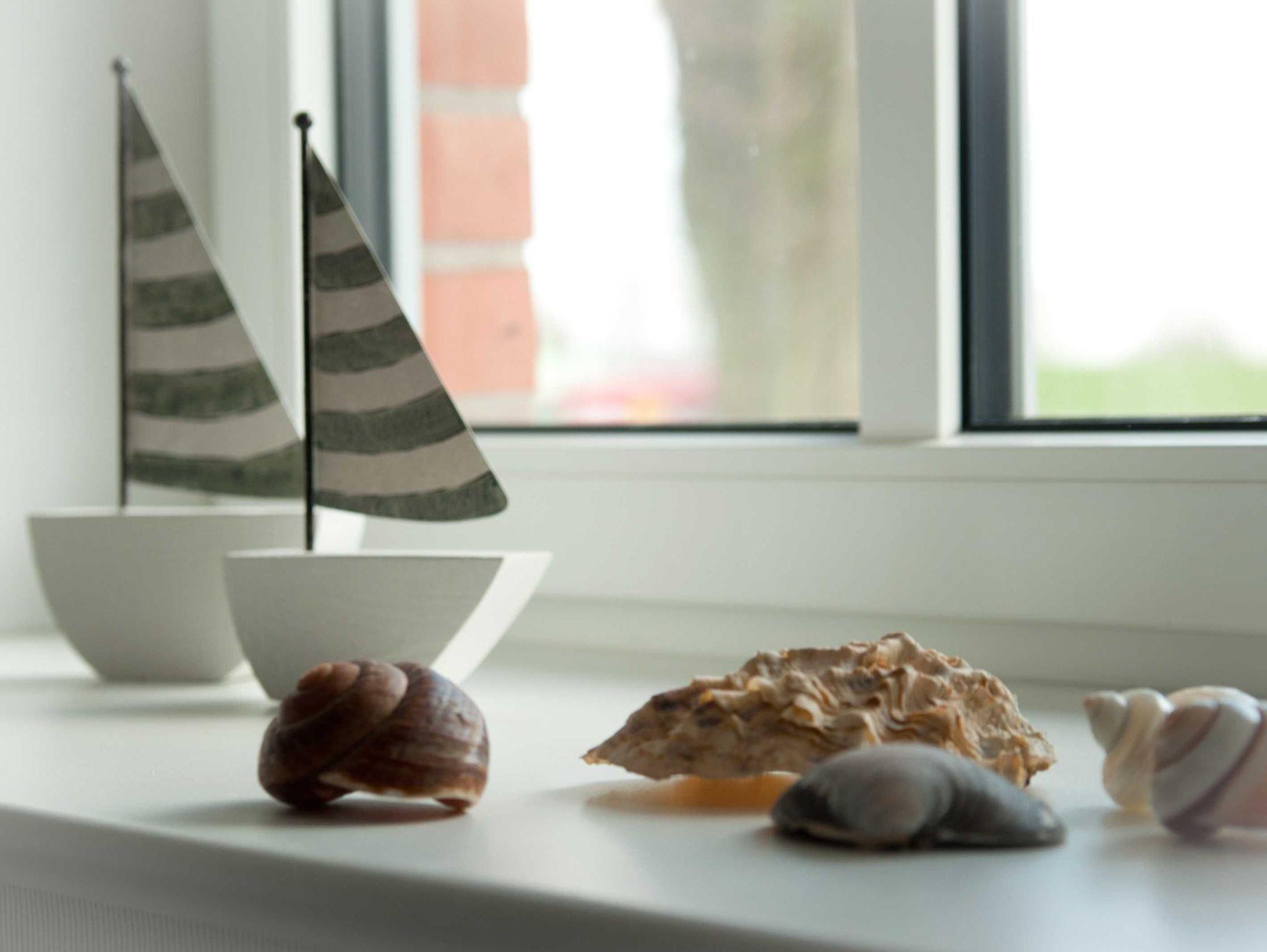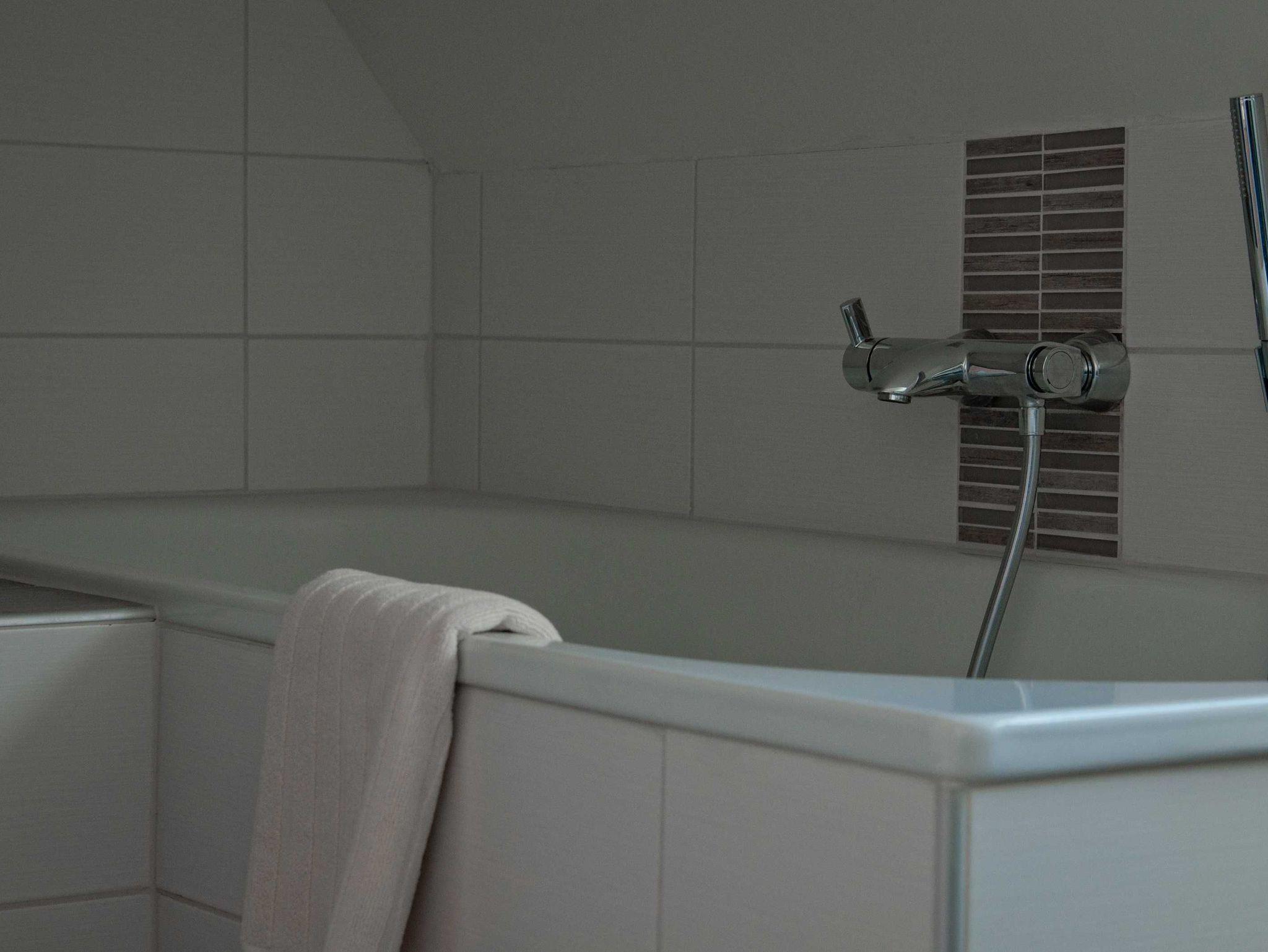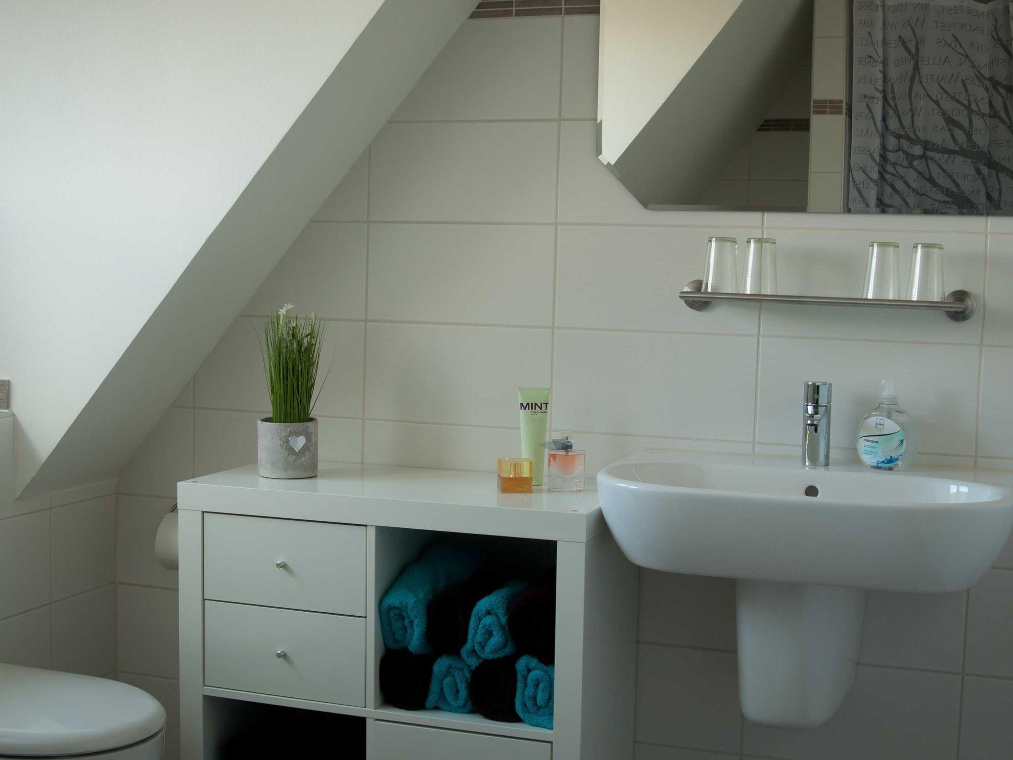 Im oberen Bad finden Sie neben der Dusche eine Badewanne und können aus dem Fenster einen Blick in die schöne Landschaft Angelns werfen.