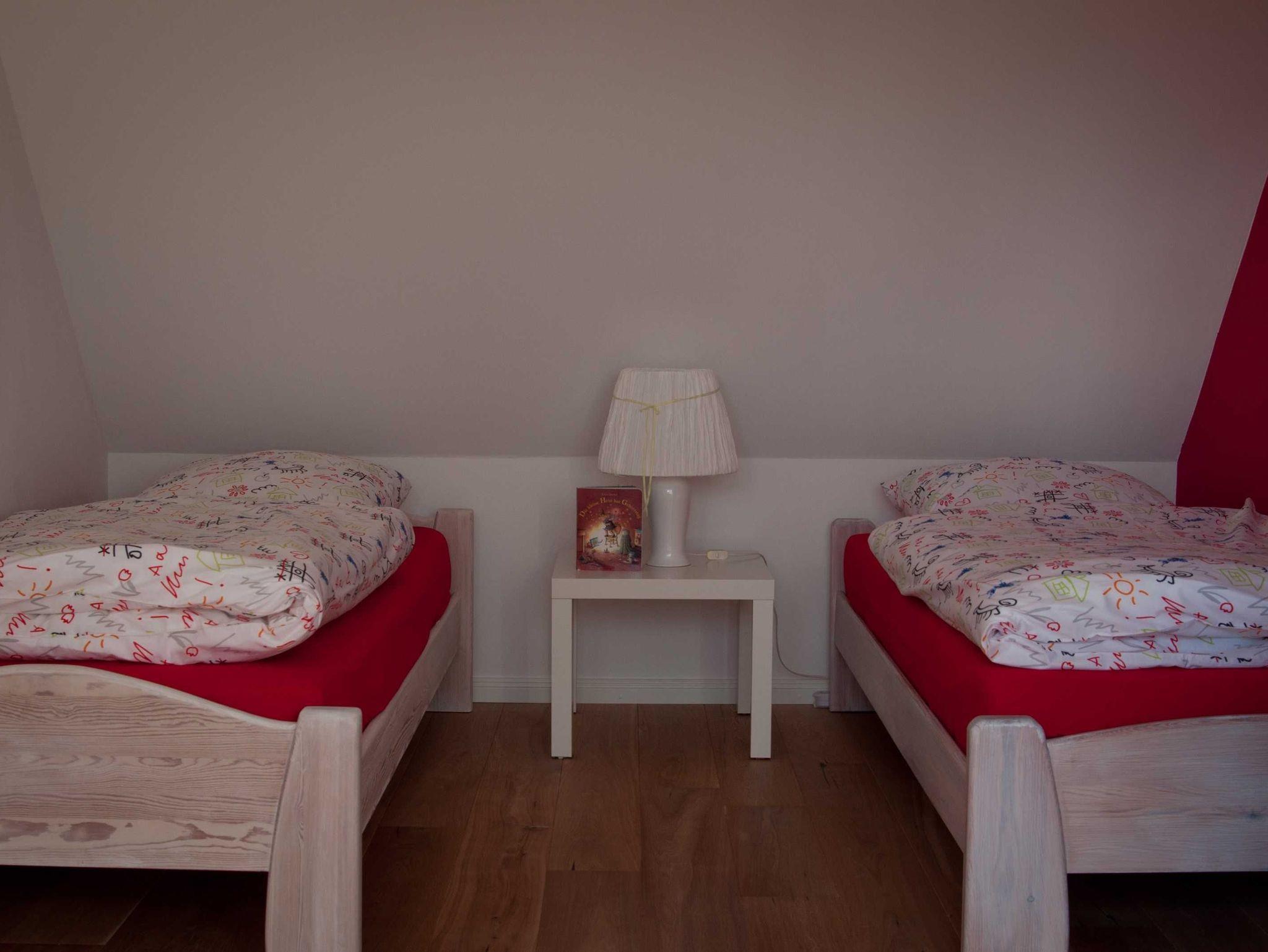 Das Kinderzimmer im Obergeschoß ist geprägt durch die große Gaube, die viel Sonnenlicht in dieses Zimmer lässt. Hier befinden sich zwei Einzelbetten und ein Kinderbett sowie ein weiterer Schrank.